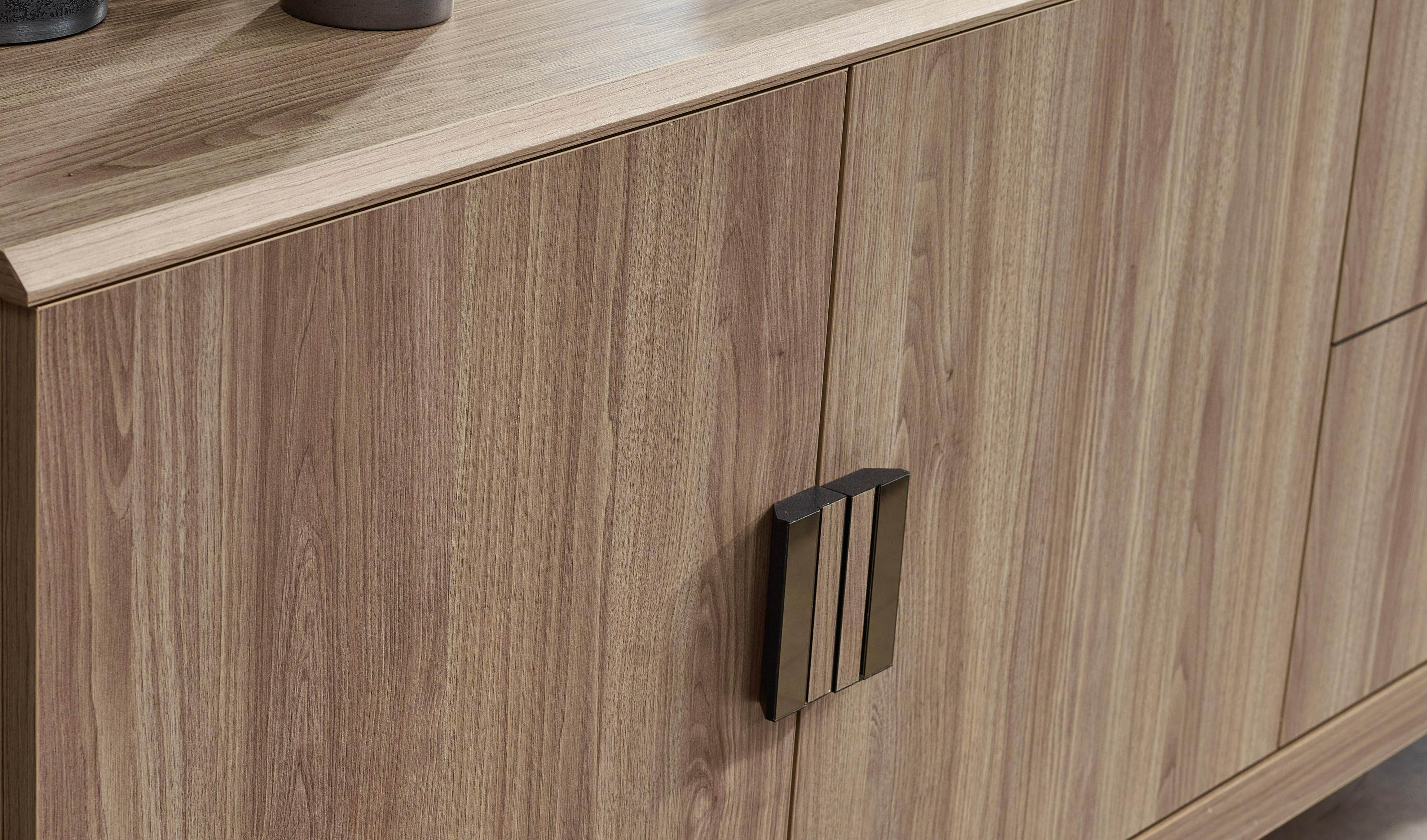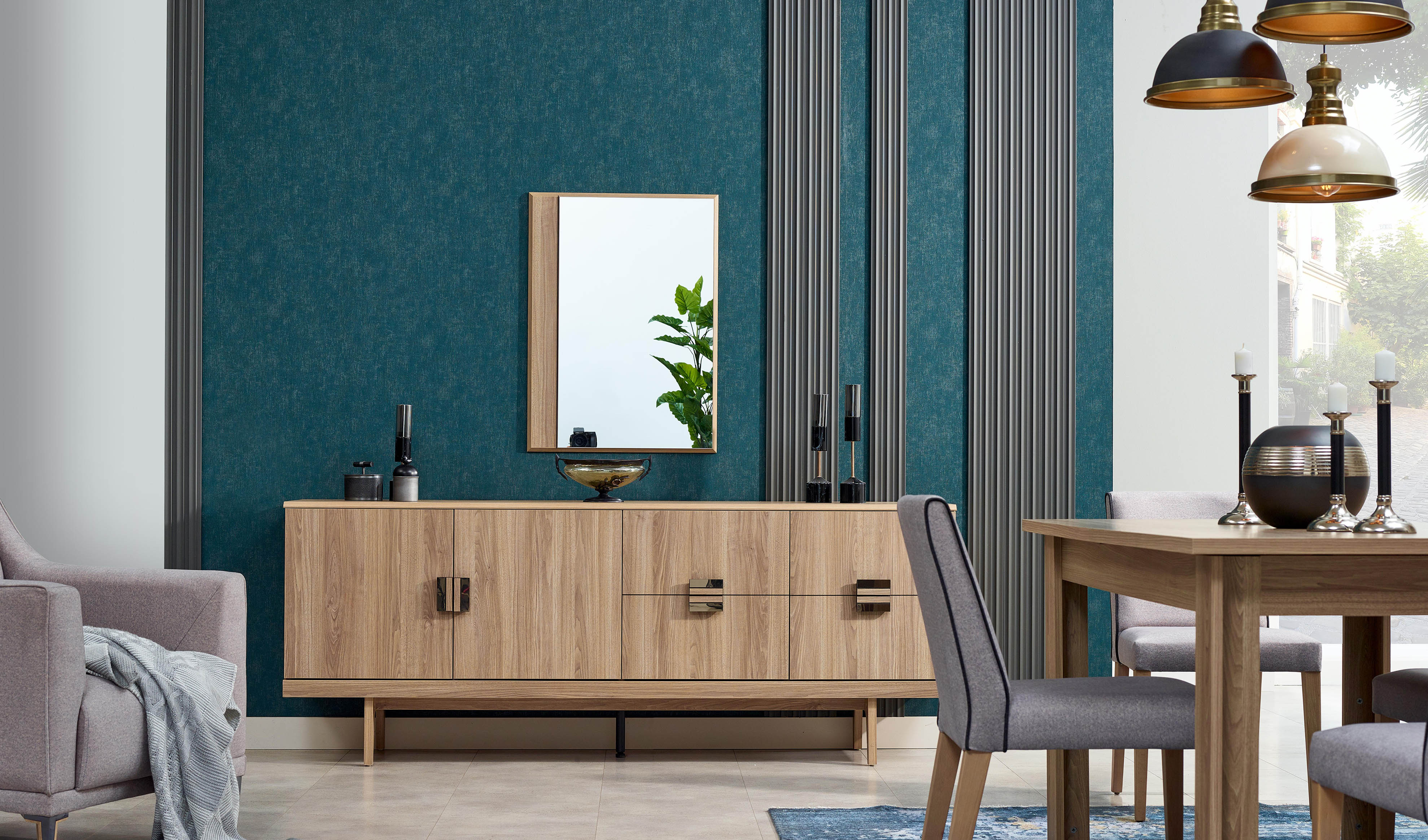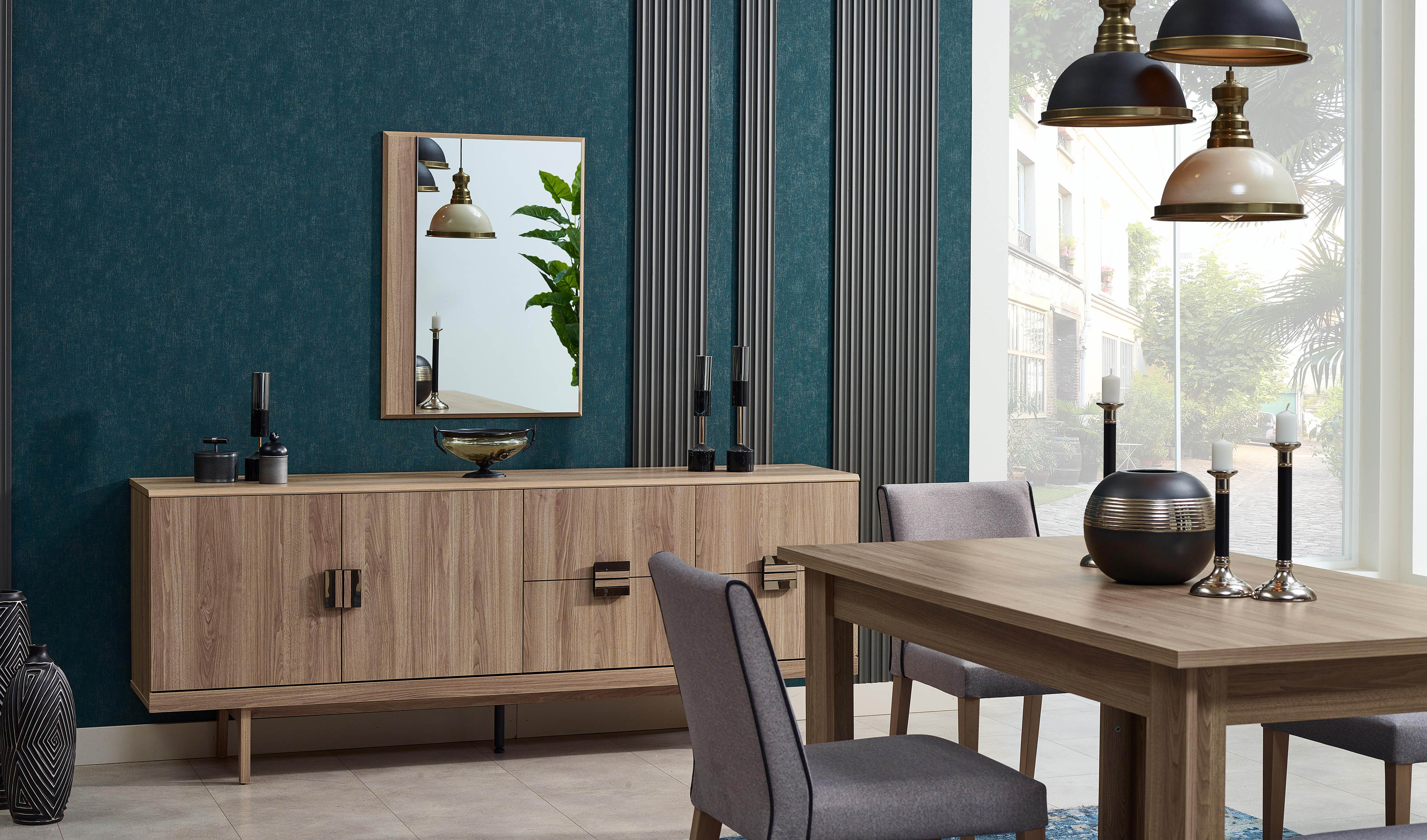 Kalem işi renk kombinasyonu ve özel ayak-kulp tasarımı ile modern bir duruş sergileyen bu yemek odası takımı, geniş saklama alanları ve düz renk ayna detaylarıyla estetiği tamamlıyor.