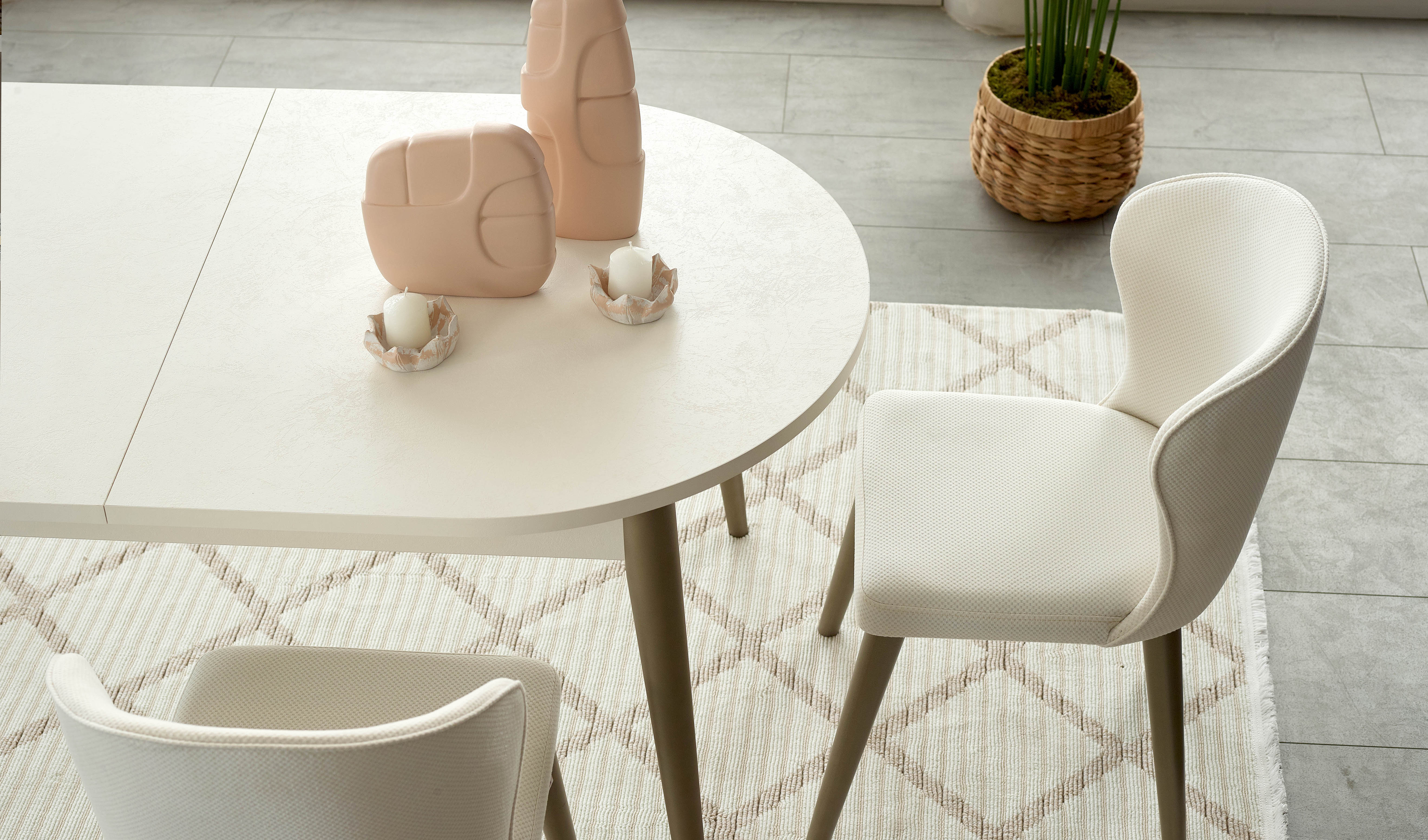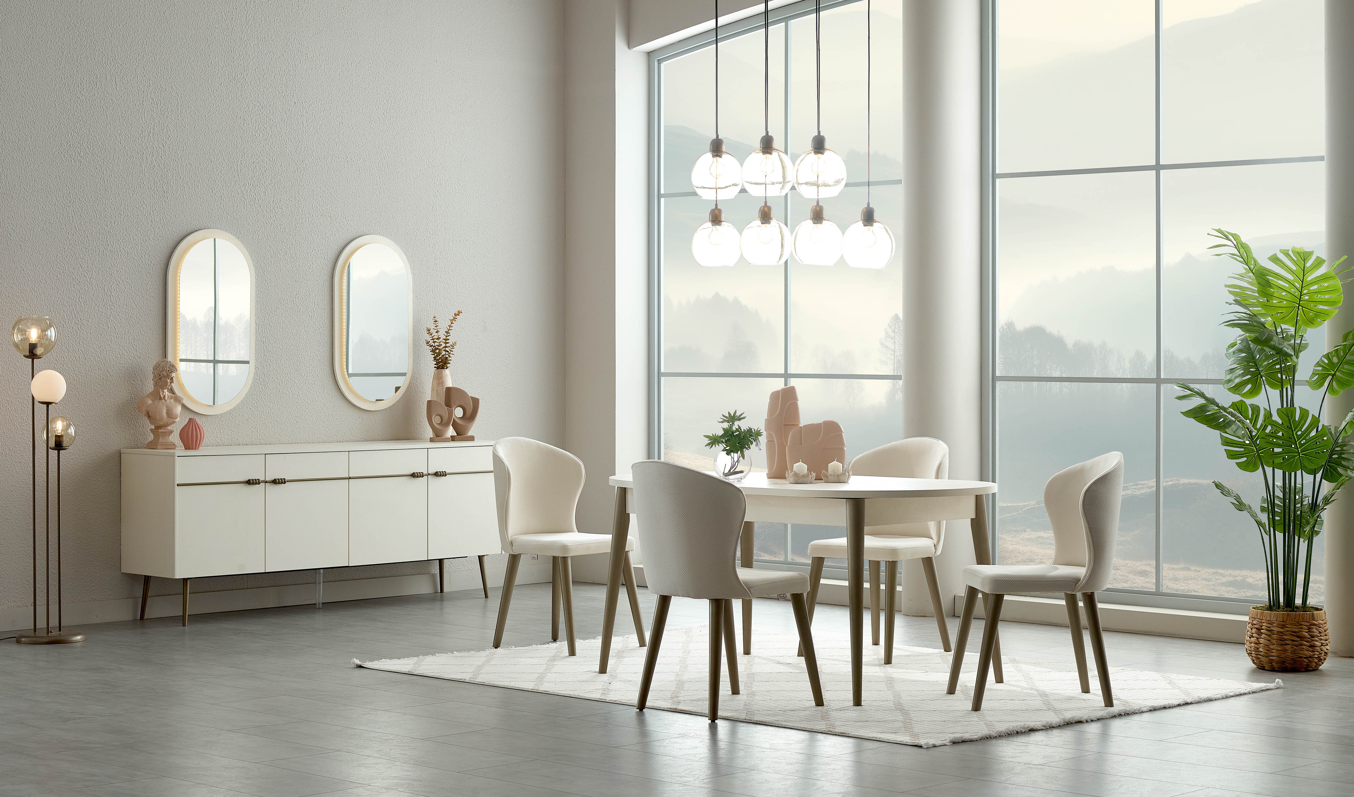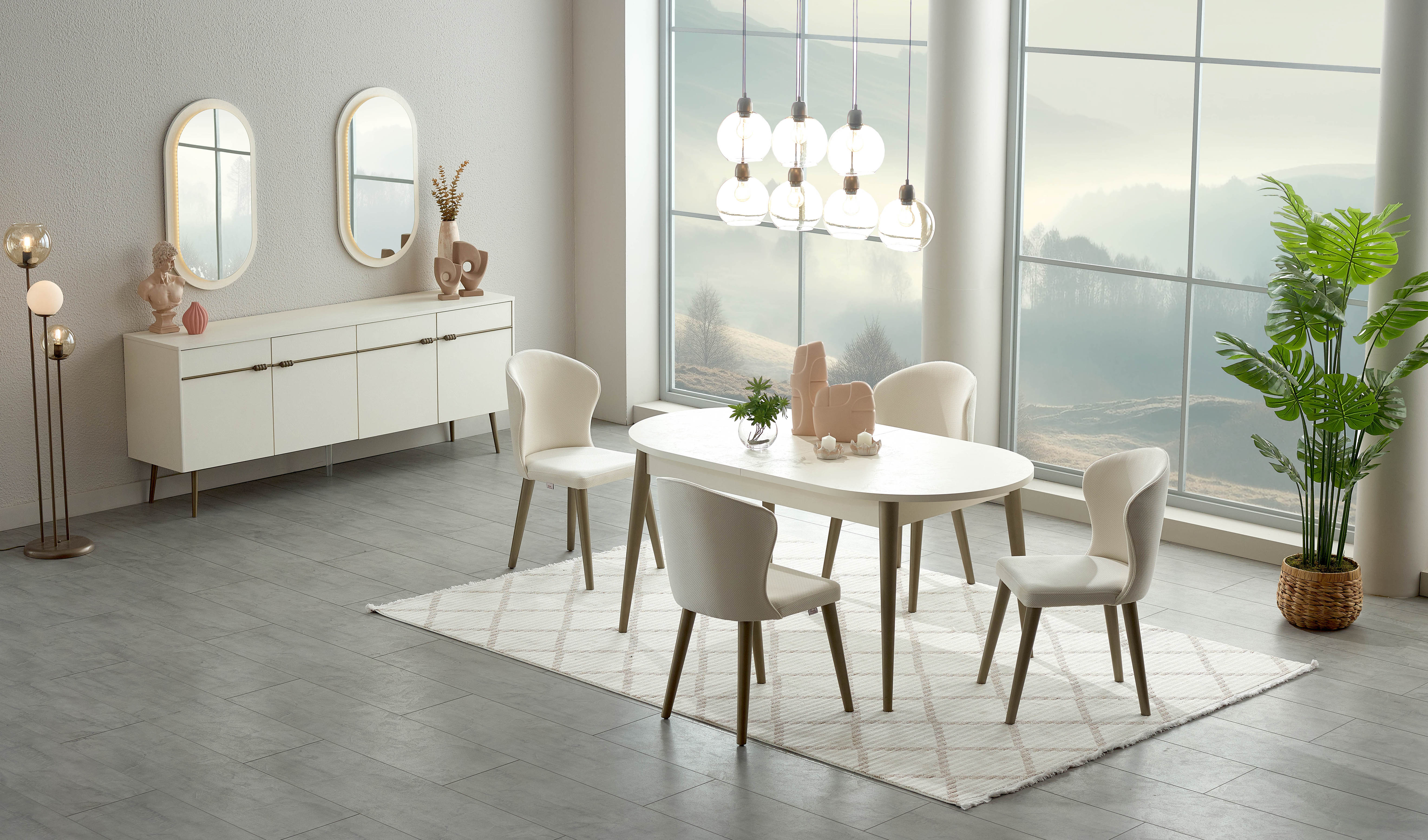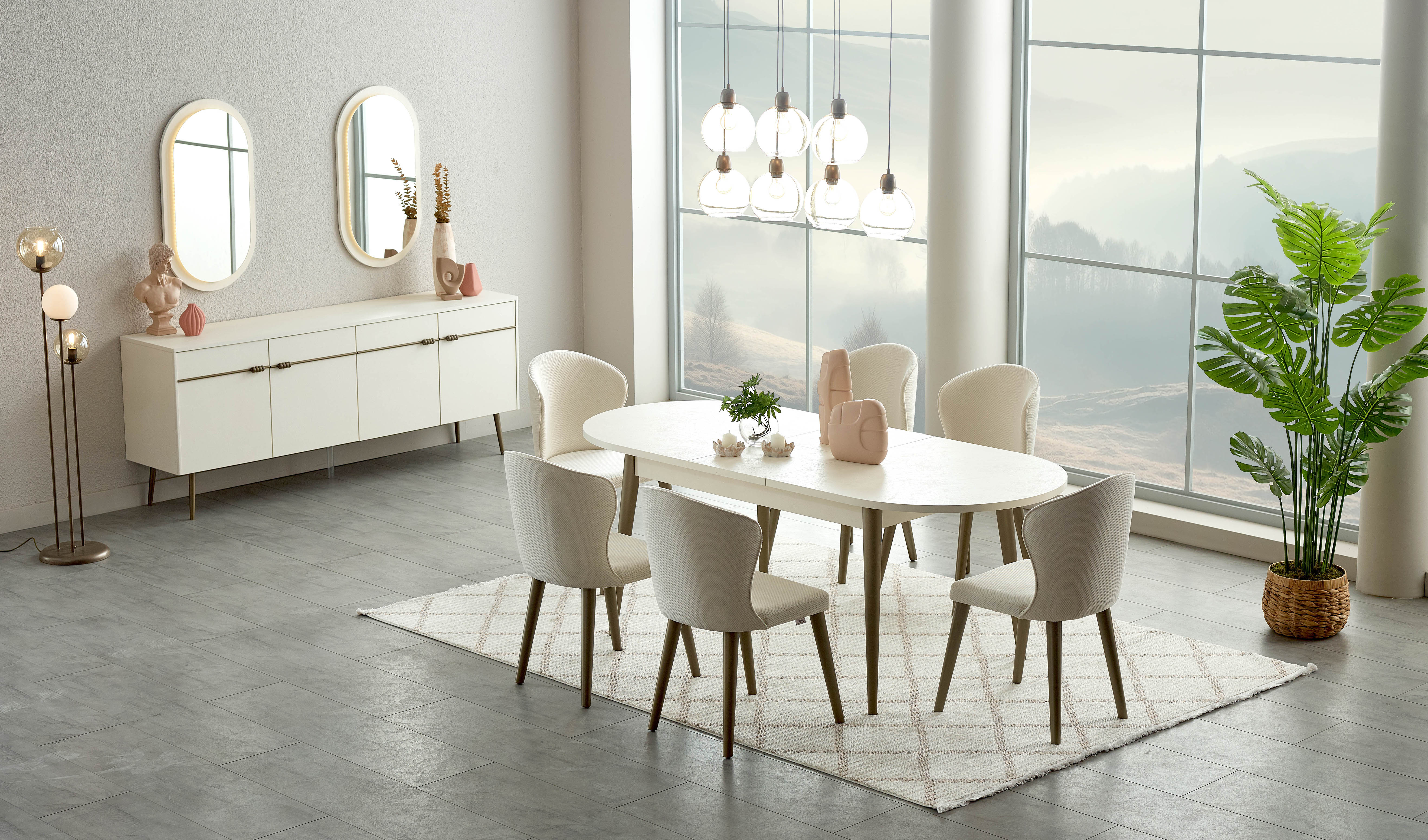 Açılır yemek masası, sevdiklerinizle daha geniş sofralarda buluşmanıza imkan tanırken, ahşap ayak detayı tasarımı güçlendirir. Seri ile uyumlu sandalye tasarımı, takımın bütünlüğünü tamamlayarak hem estetik hem de konforlu bir oturum sunar.