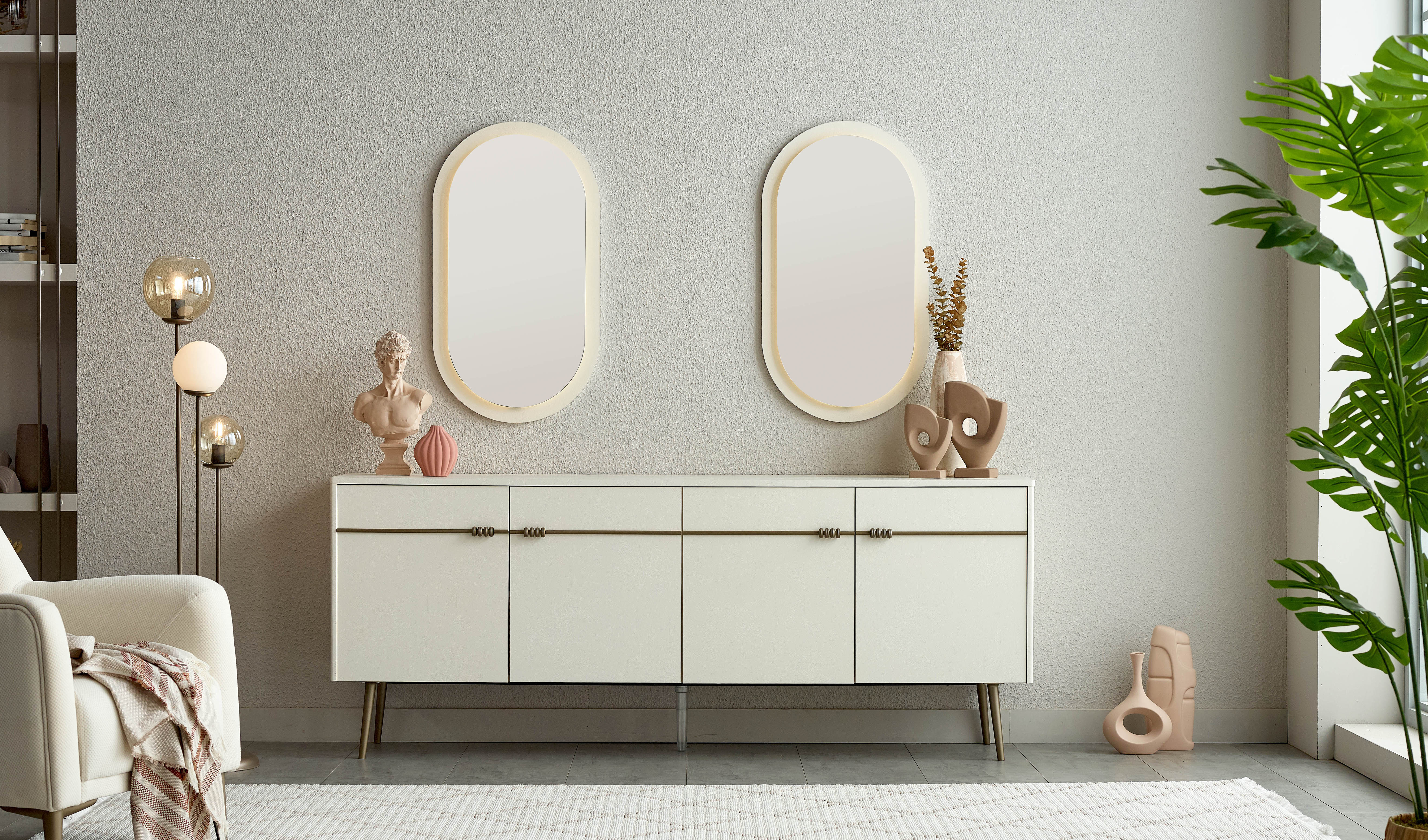 Takımın modüllerinde kullanılan radyüslü köşe detayları ve dekoratif profil uygulamaları, görselliği ön plana çıkarırken güvenli ve zarif bir kullanım sunar. Konsol aynalığı, tekli veya çiftli satın alma imkanıyla farklı ihtiyaçlara uyum sağlar; ayrıca aydınlatma detayı ve düz renk ayna uygulaması ile yemek odanıza modern bir bütünlük katar.