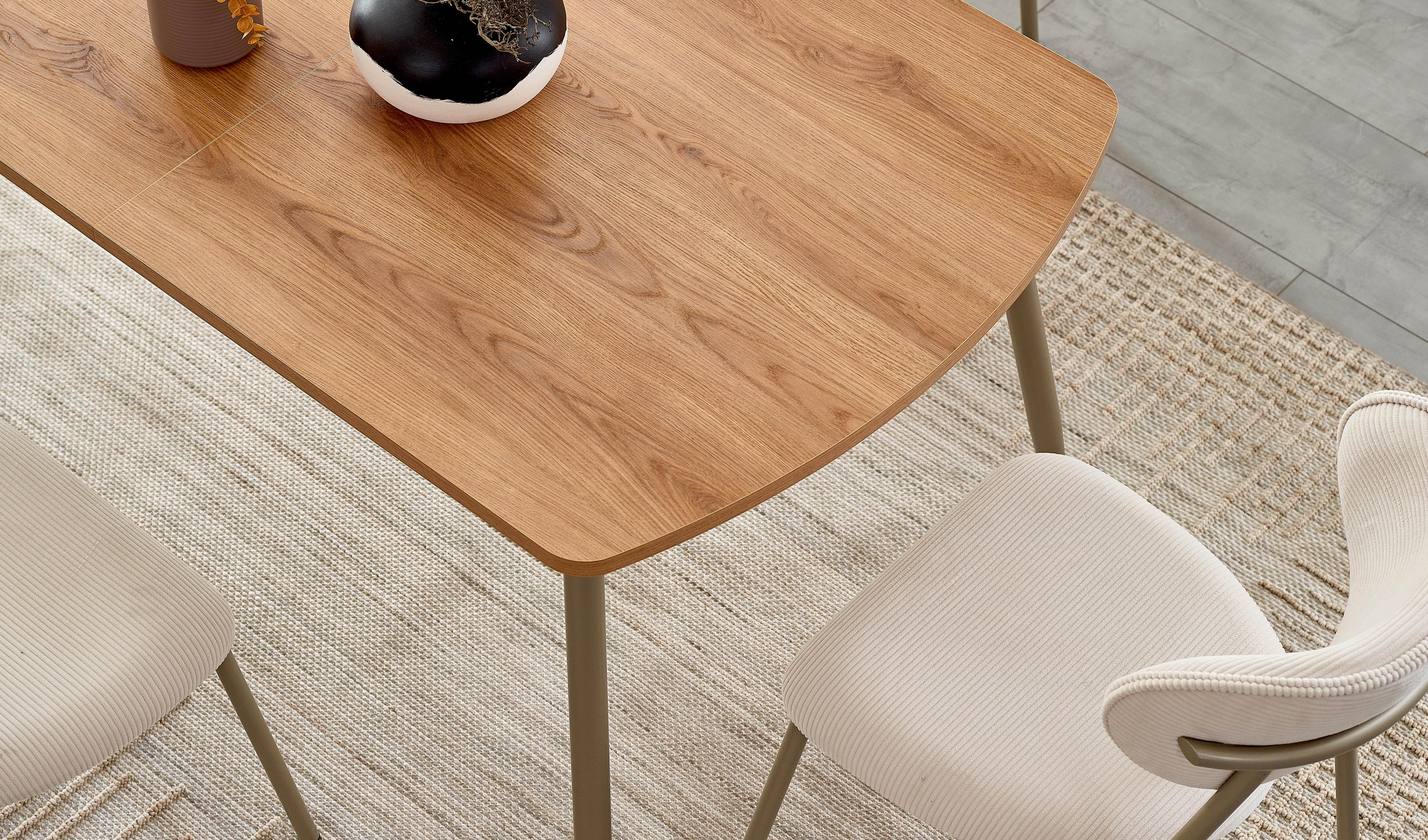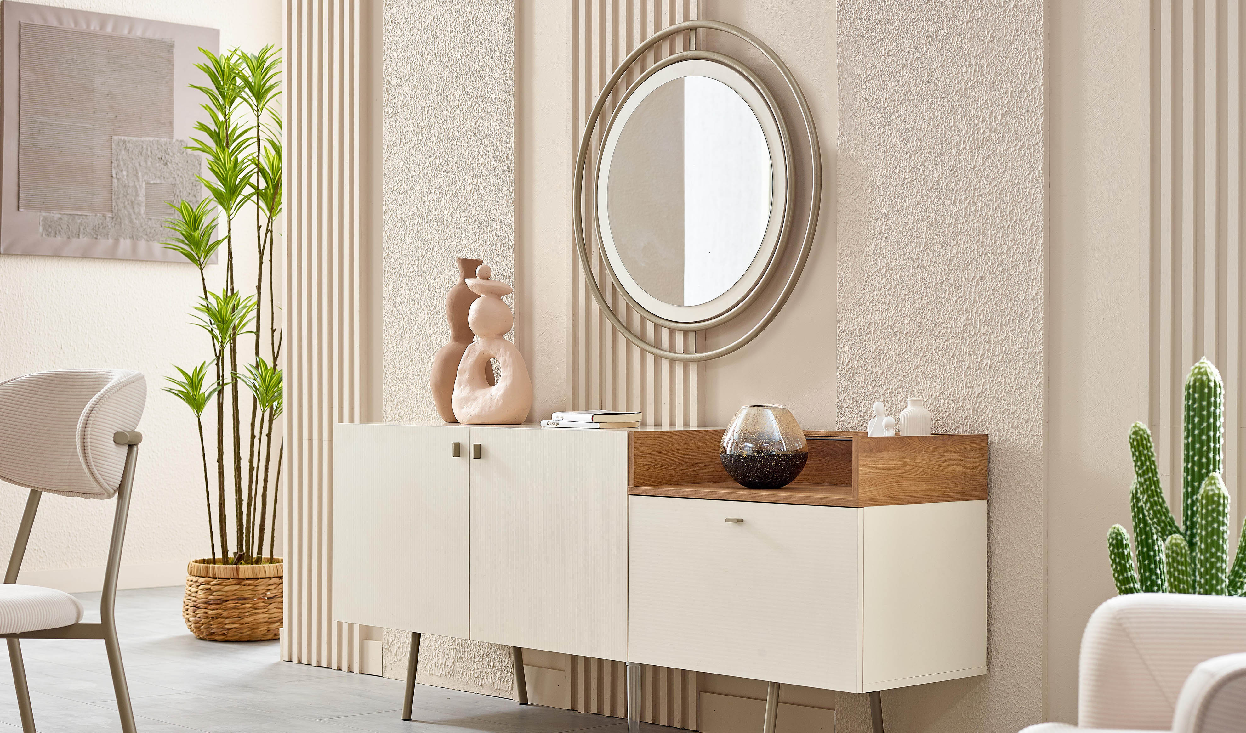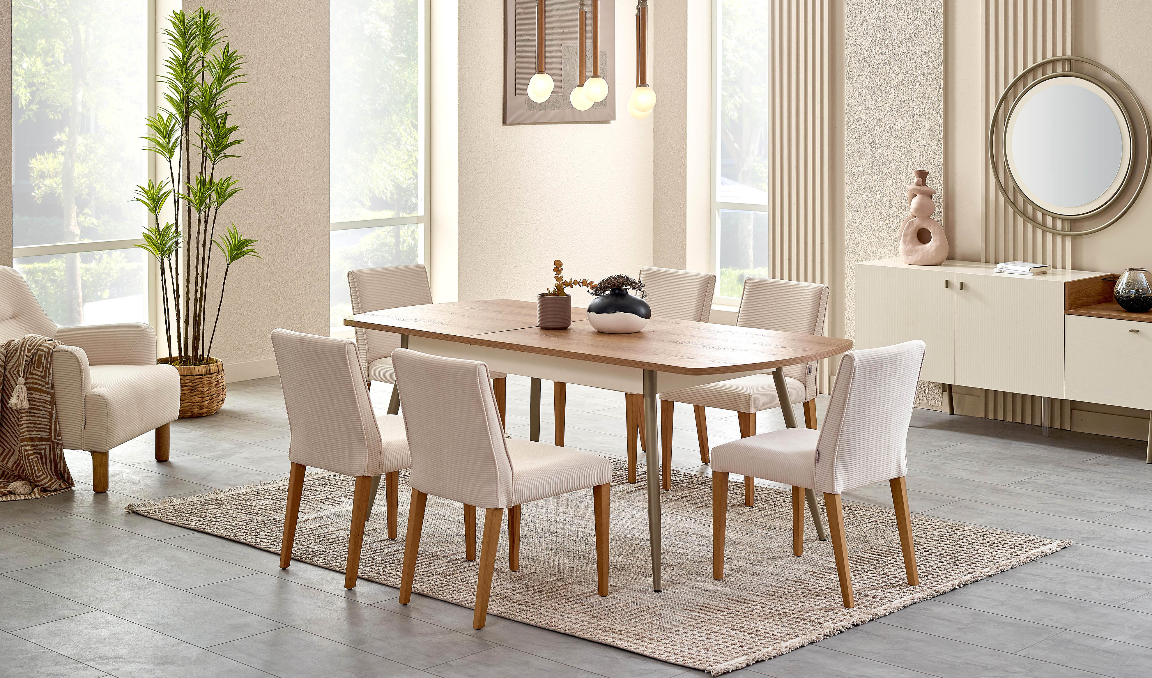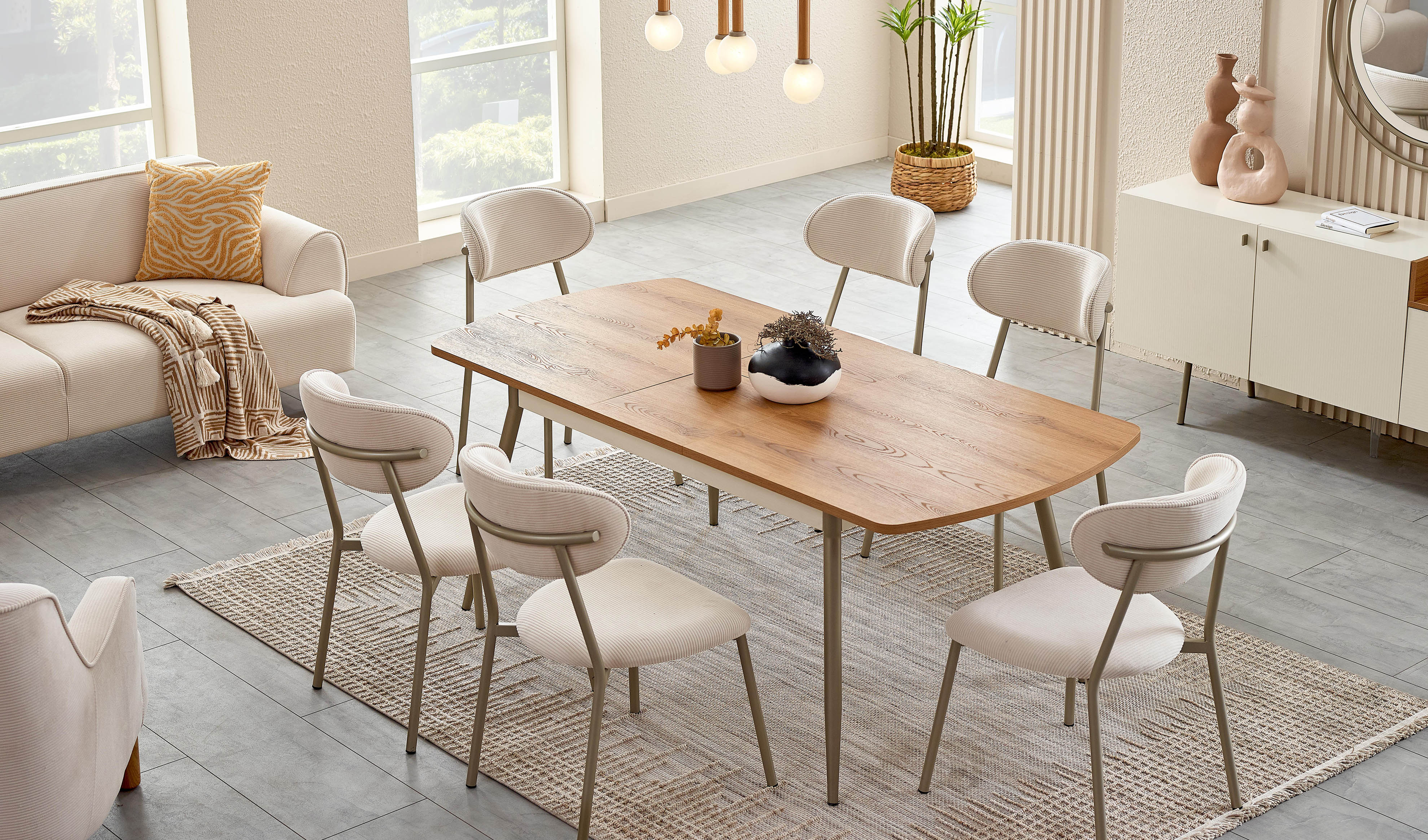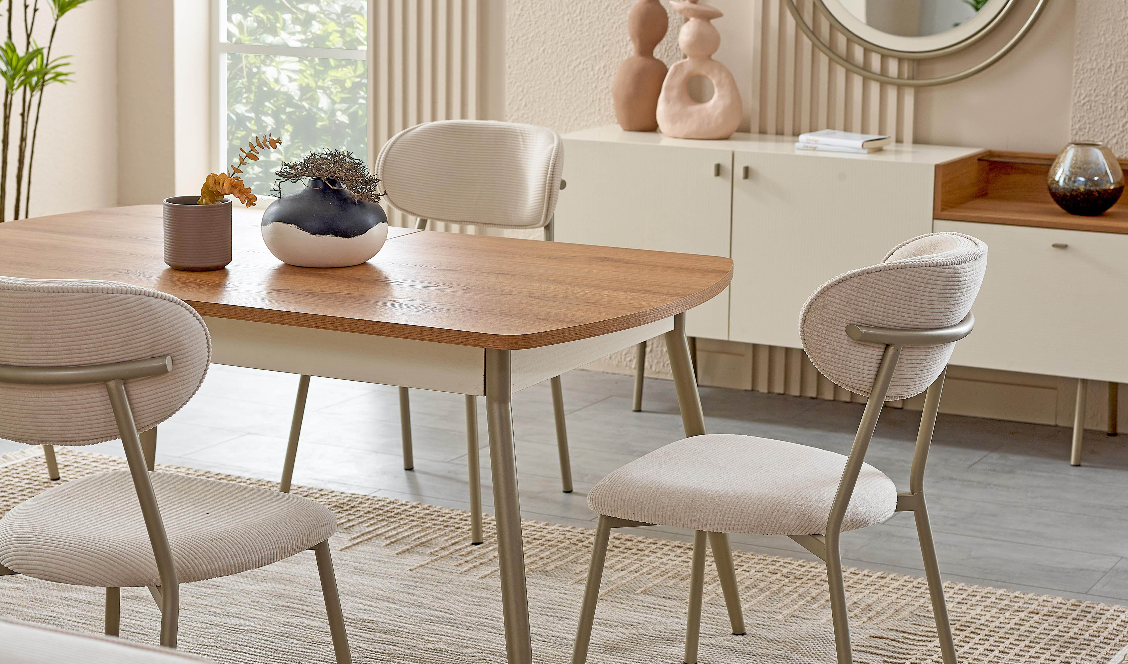 Estivo Yemek Odası Takımı, modern ve zarif tasarımıyla sofralarınıza şıklık katacak. Ay taşı ve Afrika cevizinin doğallığını, seriye özel metal kulp ve ayak detaylarıyla birleştirerek sizler için tasarladık. Konsol aynalığında düz renk ve metal çember uygulamaları ile tasarıma sofistike bir dokunuş yaparak göz zevkinizi bir üst noktaya çıkarmayı amaçlıyoruz. Geniş saklama alanları ve yüksek ayak yapısı ile işlevselliği arttırırken temizlik kolaylığını da unutmadık. Yavaşlatıcılı menteşe sistemi, konforlu bir kullanım sunarken, seriye uyumlu ahşap ve metal ayaklı sandalye seçenekleriyle takımınızı tamamlayabilirsiniz. E-1 kalite standartlarına uygun, sağlığa zararsız malzemelerle üretilen Estivo, zarafet ve fonksiyonelliği bir arada sunuyor.