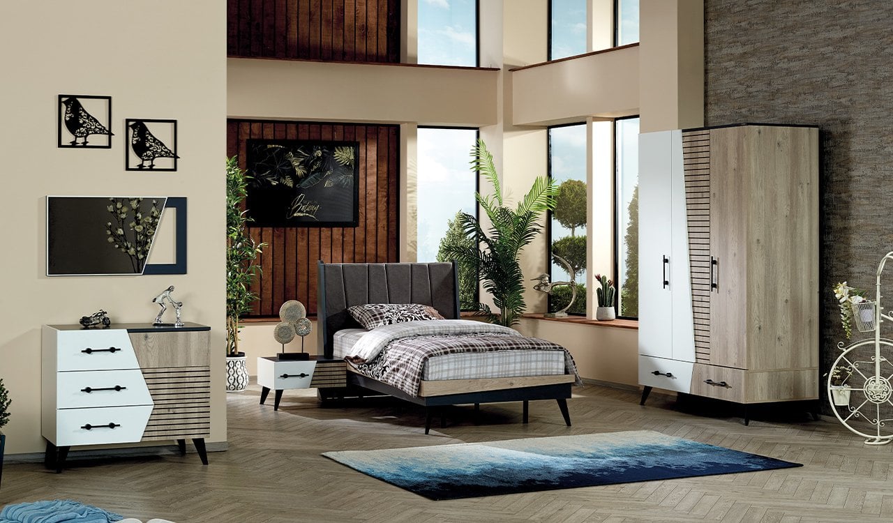 Goya, sana hem stil hem de pratiklik sunuyor. Gardropta çekmece uygulaması, eşyalarını düzenlerken sana kolaylık sağlarken, şifonyerde düz renk ayna uygulaması odanı daha ferah ve aydınlık gösteriyor. Kapaklarda ve çekmecelerde siyah renk kanal uygulaması, modern bir kontrast yaratırken, frenlemeli menteşe özelliği ile sessiz ve güvenli bir kullanım sunuyor. Çalışma masası rafında gizli aydınlatma imkanı, gece çalışmalarını daha keyifli hale getiriyor; karyola başlığında silinebilir kumaş uygulaması ise temizlikte zaman kazandırıyor.