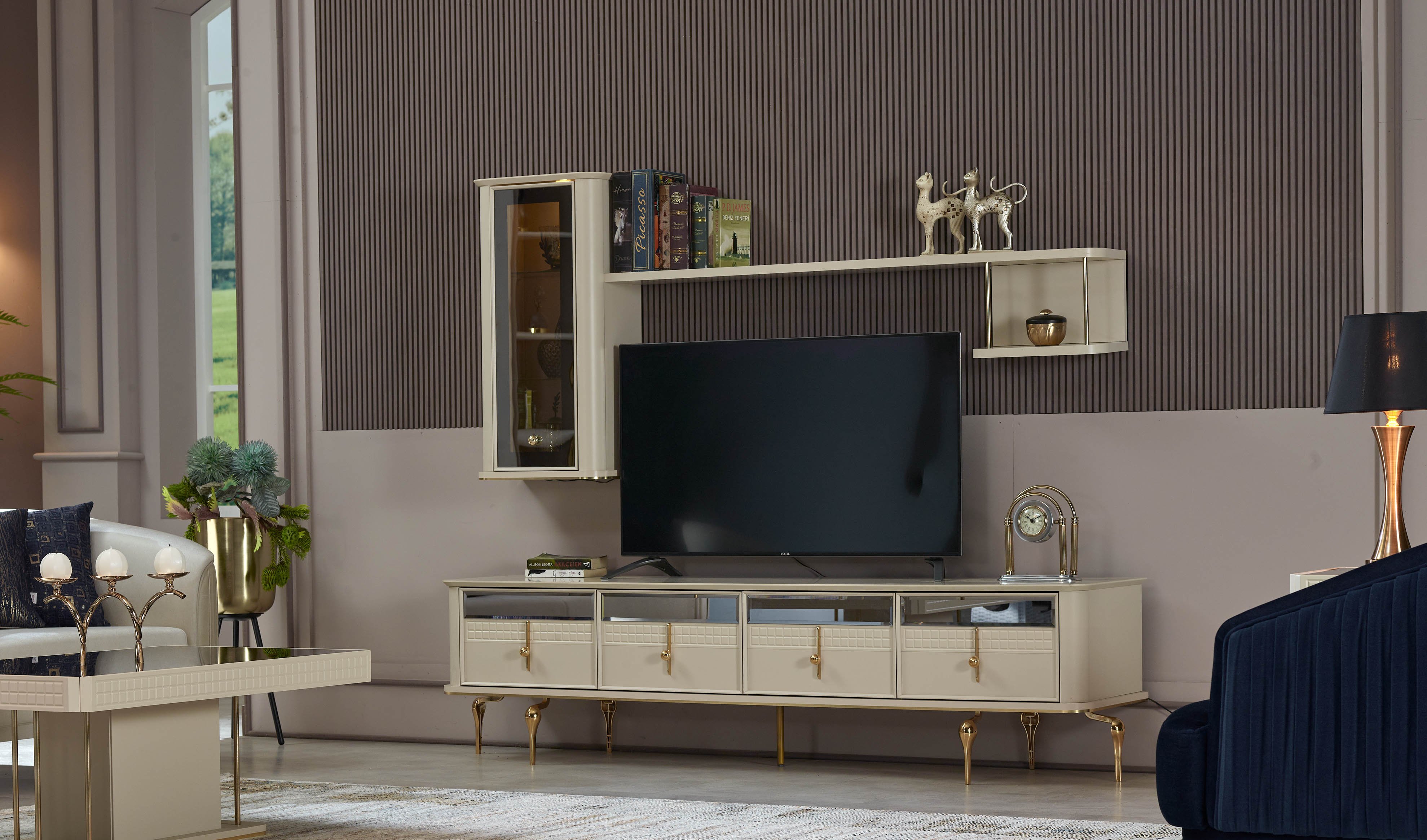 Helenka TV Ünitesi, modern tasarımı, vizon bej ve gold renk kombinasyonu, özel formdaki gold kaplamalı kulpları, çekmecelerdeki CNC işlemeli desenleri ve yavaşlatıcı mekanizmasıyla estetik ve fonksiyonelliği bir araya getiriyor. Yüksek ayak yapısı temizlik ve kullanım kolaylığı sağlarken, çevre dostu E-1 kalite standartlarına uygun malzemelerle üretilen Helenka Tv Ünitesi sizi ve sevdiklerinizi düşünüyor.
