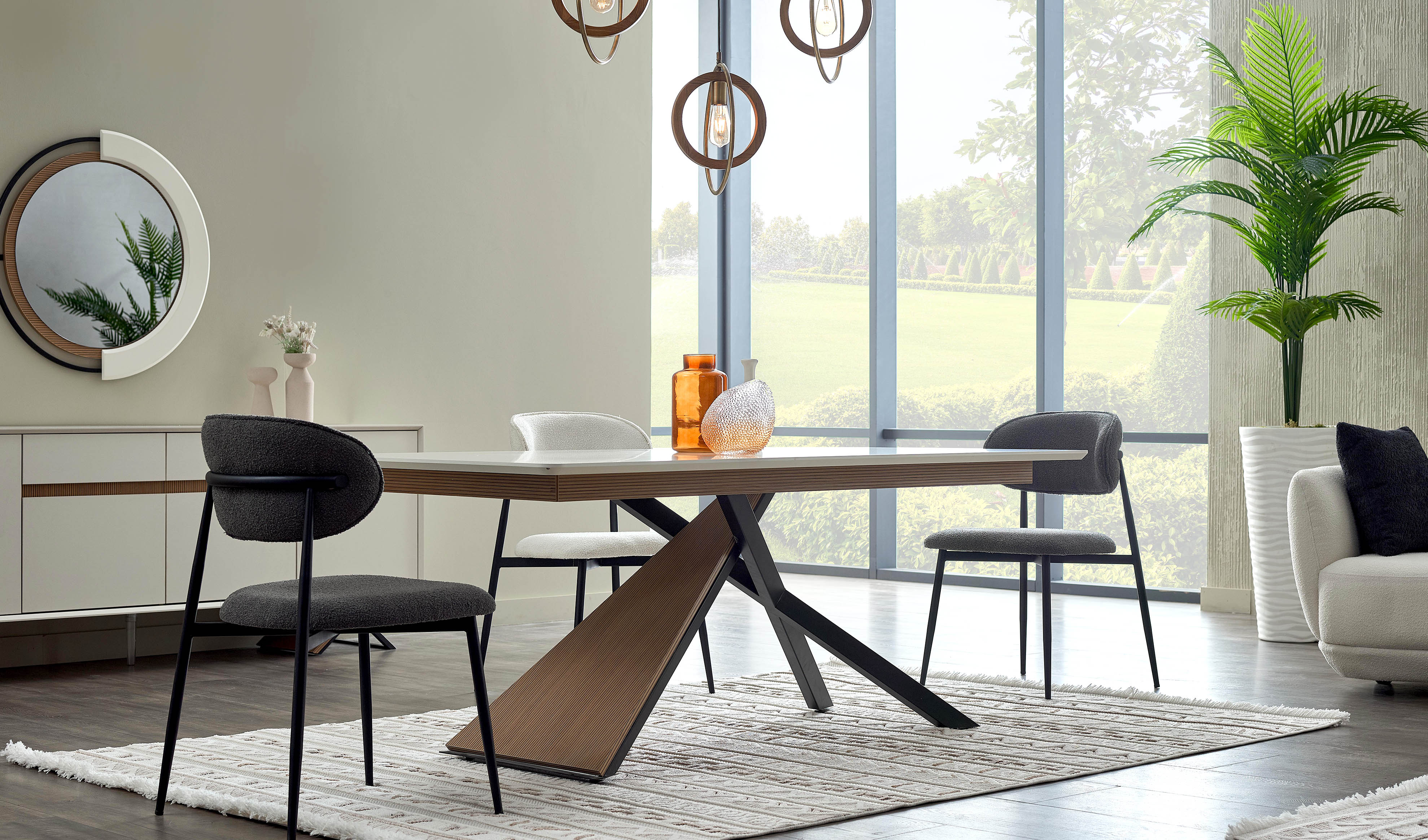 Aytaşı renk kombinasyonu ve özel metal ayak tasarımı ile dikkat çeken bu yemek odası takımı, füme ayna detaylı konsol, geniş saklama alanları ve yavaşlatıcılı mekanizma sistemiyle konforlu ve uzun ömürlü bir kullanım sunarken. Ahşap ve metal ayaklı sandalye seçenekleri ile dekorasyonunuzu tamamlayabilirsiniz. E-1 kalite malzemelerle sağlıklı ve çevre dostu bir deneyim sizi bekliyor.