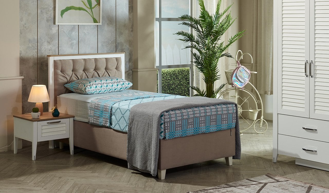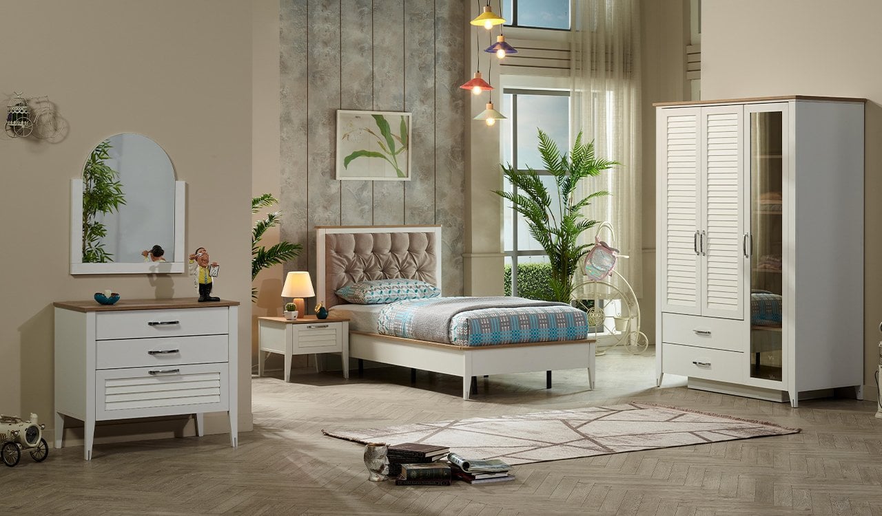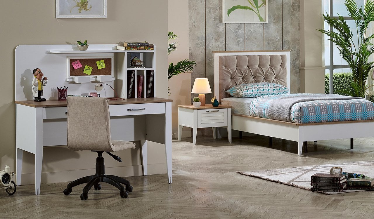 Odanla kendi hikayeni yazmak istiyorsan, Vera Genç Odası tam senin ruhuna göre! Beyaz ve sepet renk kombinasyonu ile odana ferah ve canlı bir hava katarken, ister ders çalışırken motive ol, ister hayallerine dal – Vera seninle yaşıyor. Özel formda kulp tasarımı ve özel formda ayak tasarımı, her detayıyla farkını hissettiriyor; düz renk ayna uygulaması ise odanı daha geniş ve aydınlık gösteriyor.