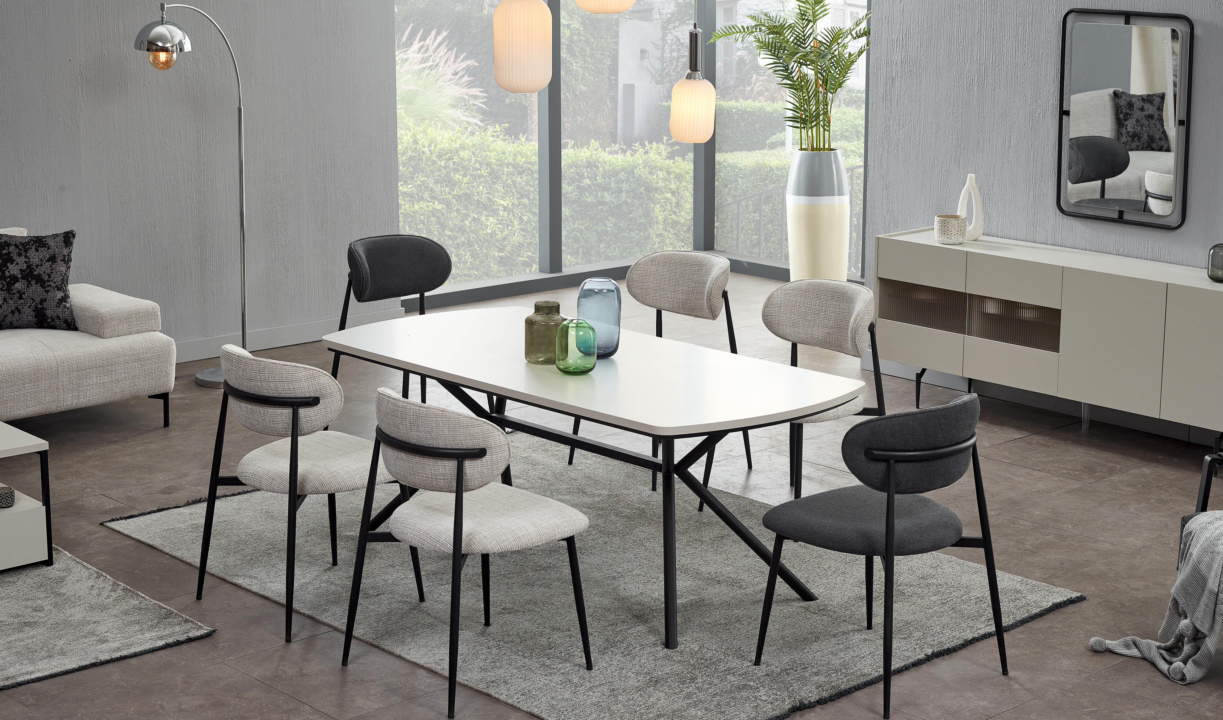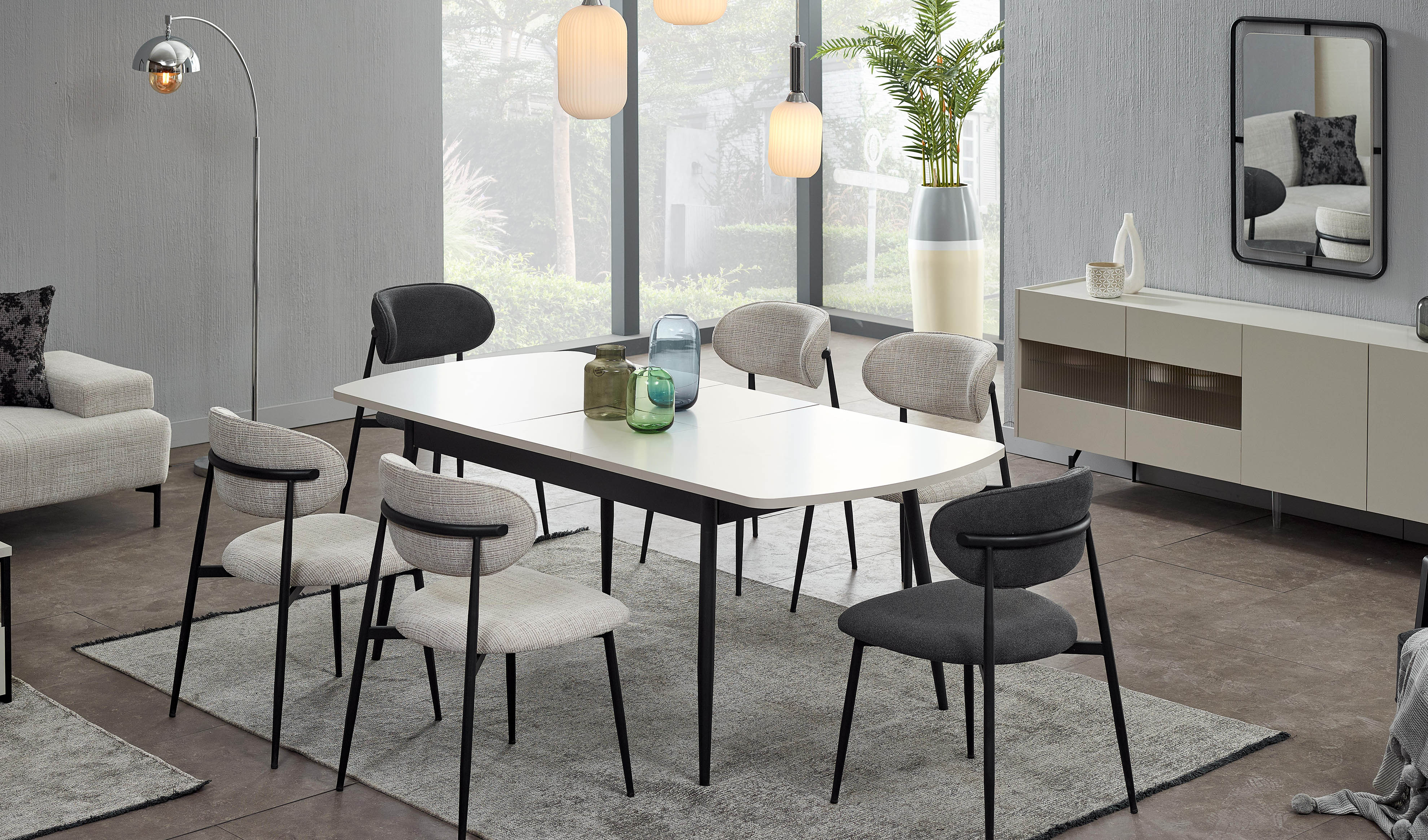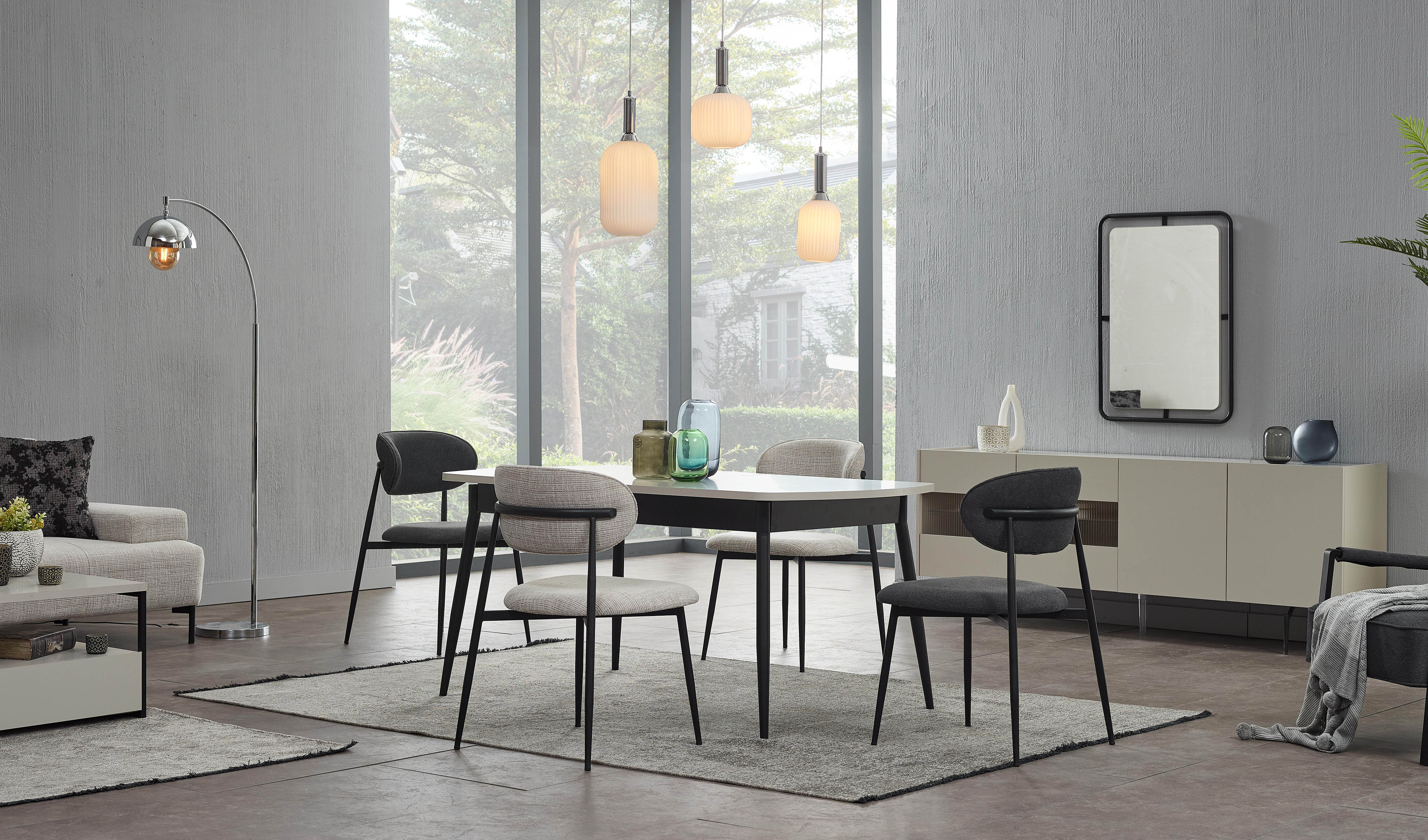 Mozambik ve siyah renk uyumu, nervürlü cam kapaklar ve metal detaylarla şıklığı tamamlıyor. Yavaşlatıcılı mekanizma, uzun ömürlü kullanım sunarken, yüksek ayak yapısı temizliği kolaylaştırıyor. Sabit ve açılır yemek masası seçenekleri ile her ihtiyaca uyum sağlıyor. E-1 kalite standartları ile sağlıklı ve çevre dostu malzemelerle üretilen bu koleksiyon, modern yaşam alanlarına zarif bir dokunuş katıyor.