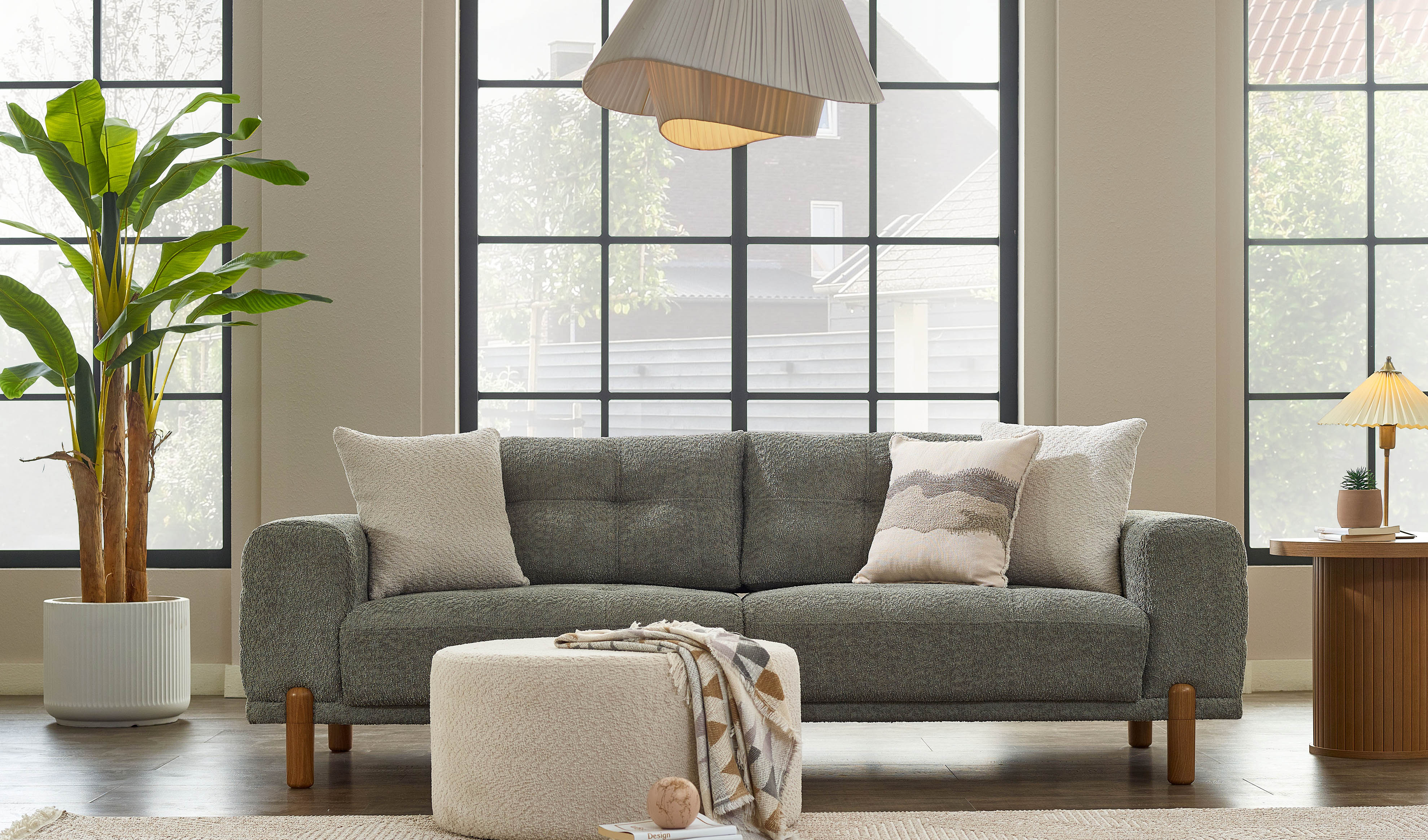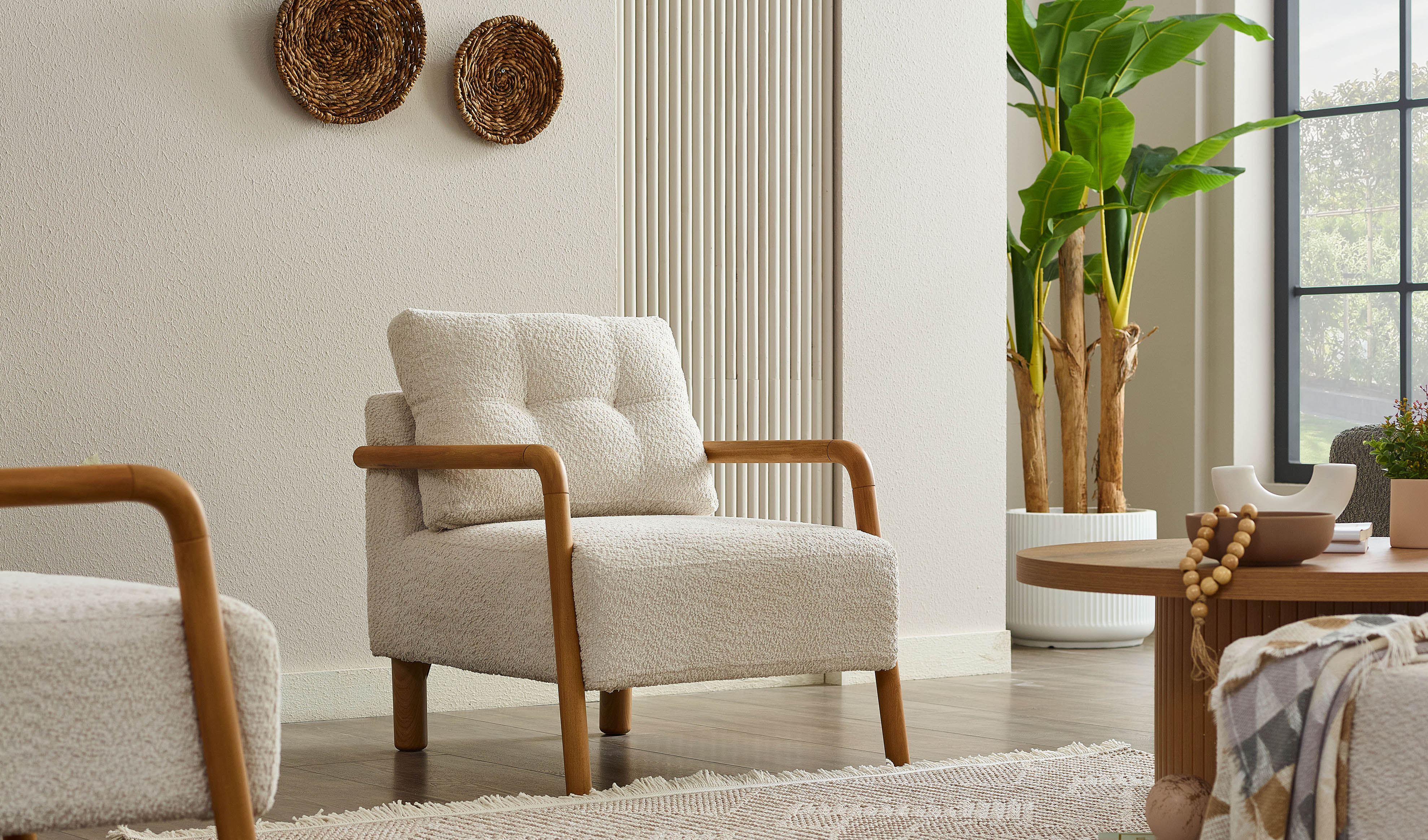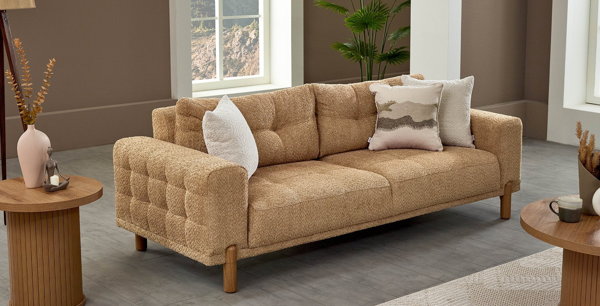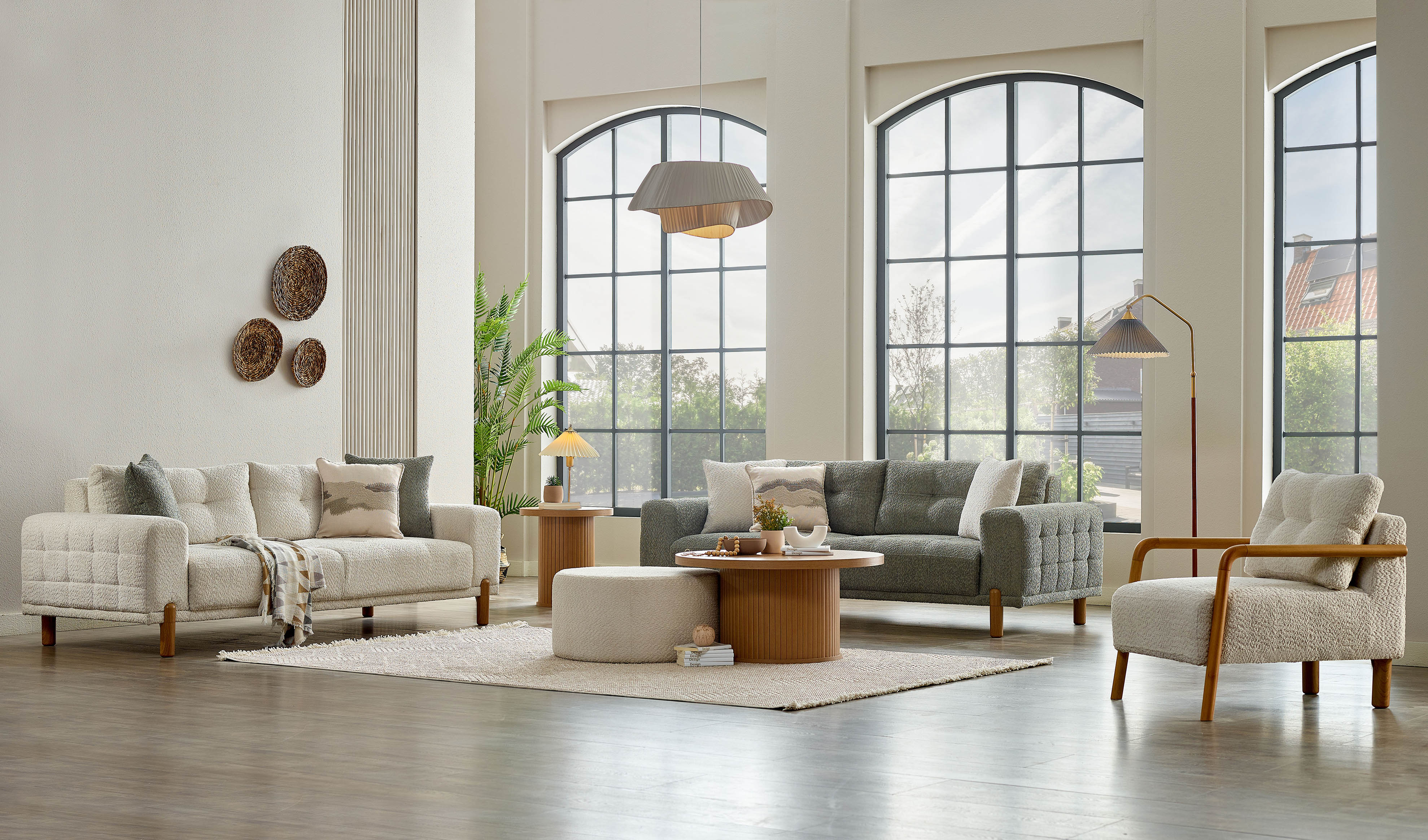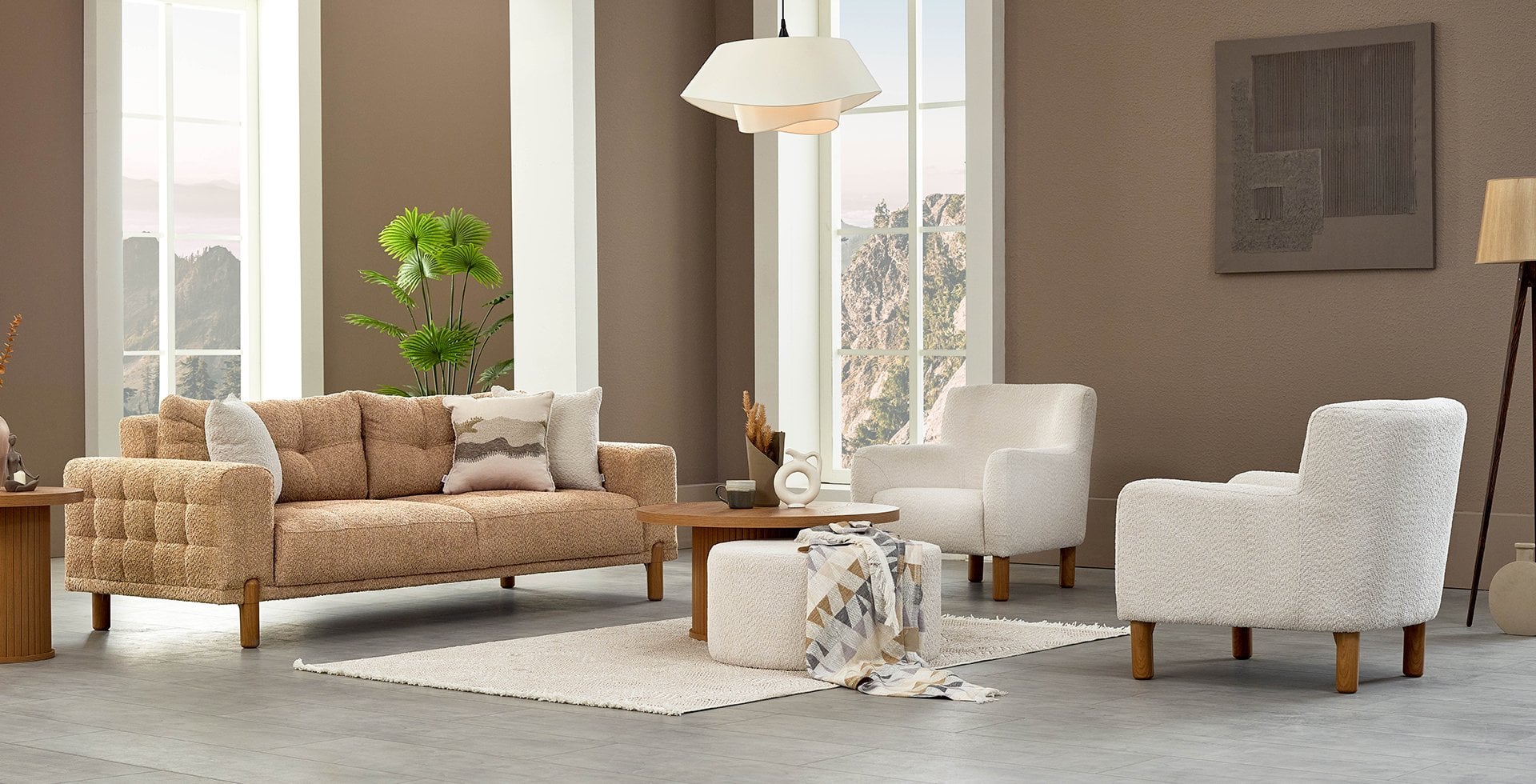 Bohem dokuma kumaşı ve dekoratif punch detayları, özgün bir tarz sunarken, Afrika ceviz renkli ayak tasarımı sıcak ve doğal bir atmosfer yaratır. Kapitone detaylı kol dış yüzeyleri ve farklı oturum seçenekleriyle yaşam alanlarınıza hem şıklık hem de işlevsellik kazandırıyor.