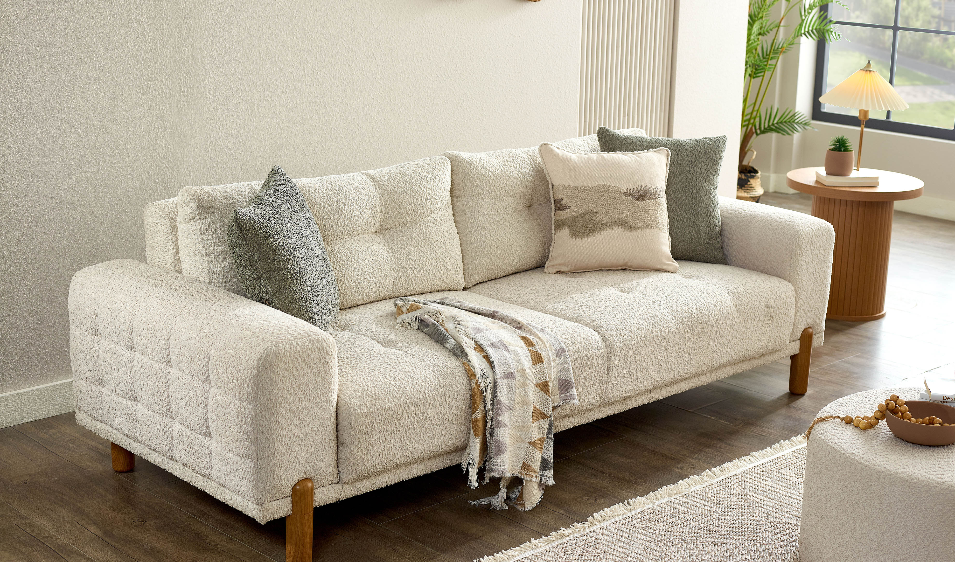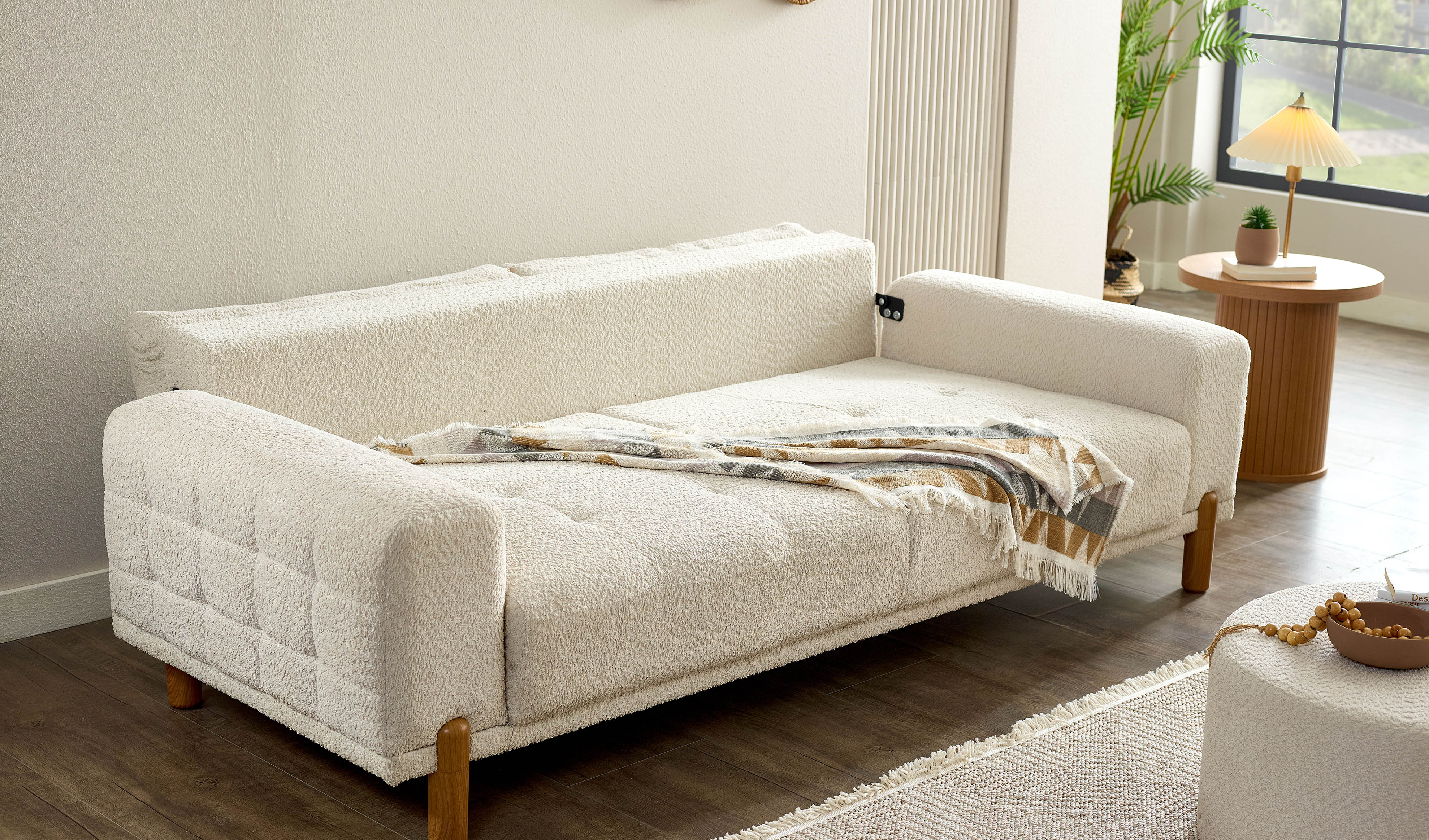 Bohem tarzını modern konforla buluşturan bu özel tasarım, takla açılır sırt mekanizması sayesinde kolayca yatak olabilme özelliği sunar. Özel dikiş detayları, sabit sırt minderi ve çektirme uygulaması estetik bir dokunuş katarken, S yaylı ve katmanlı sünger yapısı uzun süreli konfor sağlar.