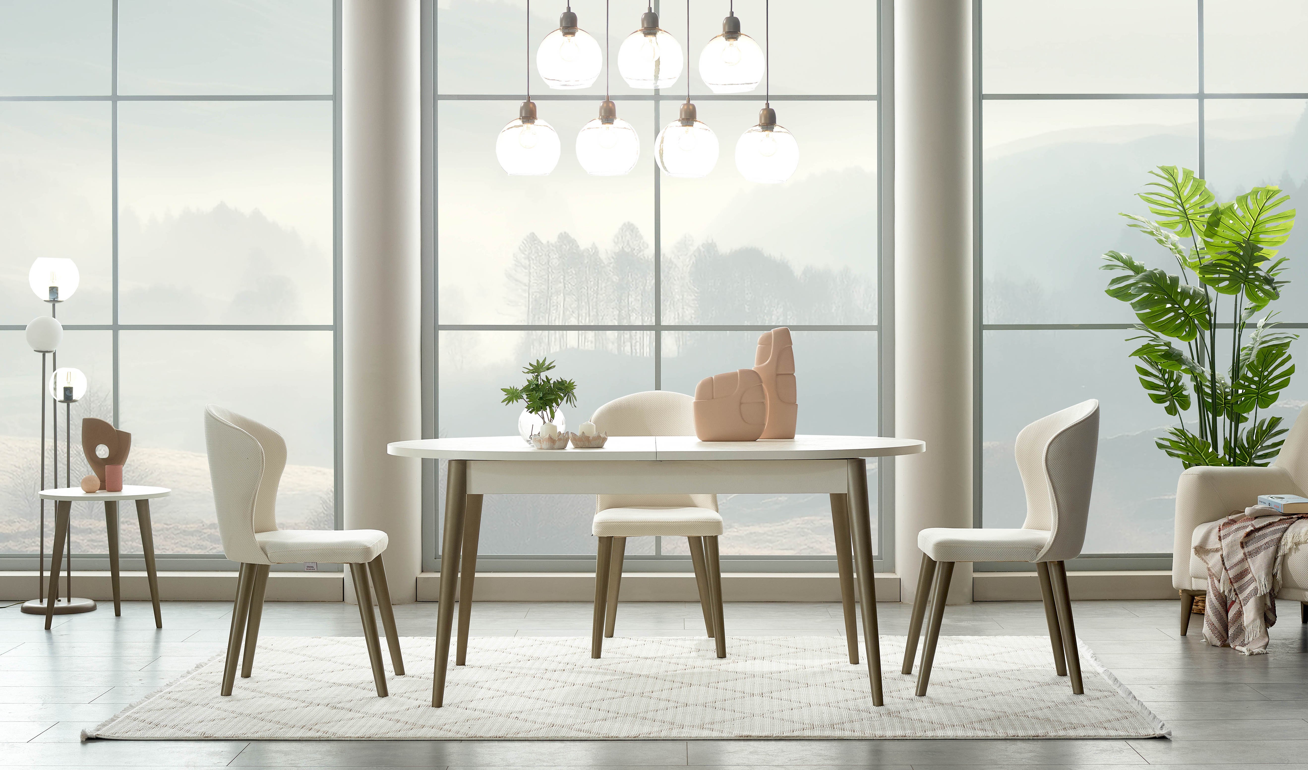 Açılır yemek masası, sevdiklerinizle daha geniş sofralarda buluşmanıza imkan tanırken, ahşap ayak detayı tasarımı güçlendirir. Seri ile uyumlu sandalye tasarımı, takımın bütünlüğünü tamamlayarak hem estetik hem de konforlu bir oturum sunar.