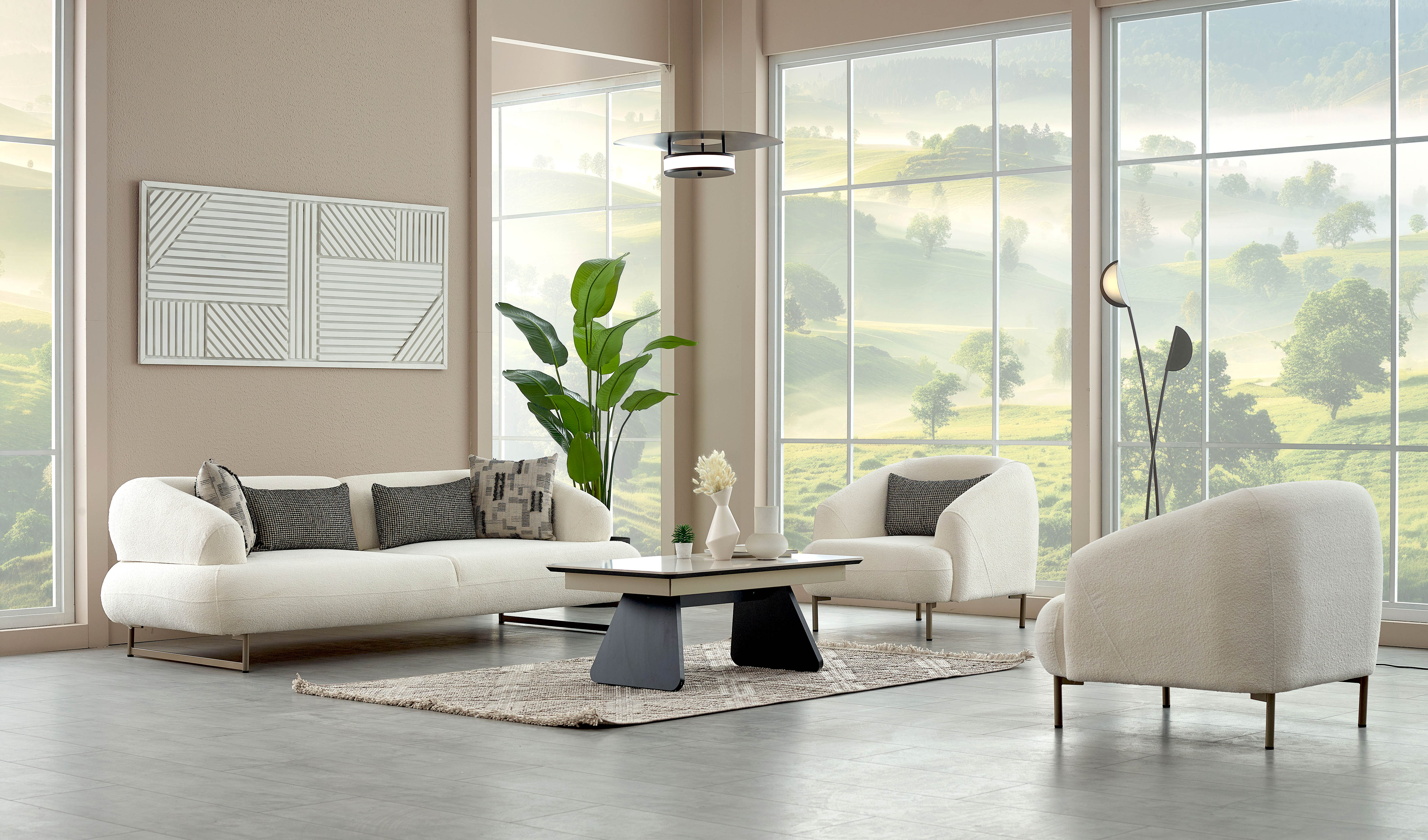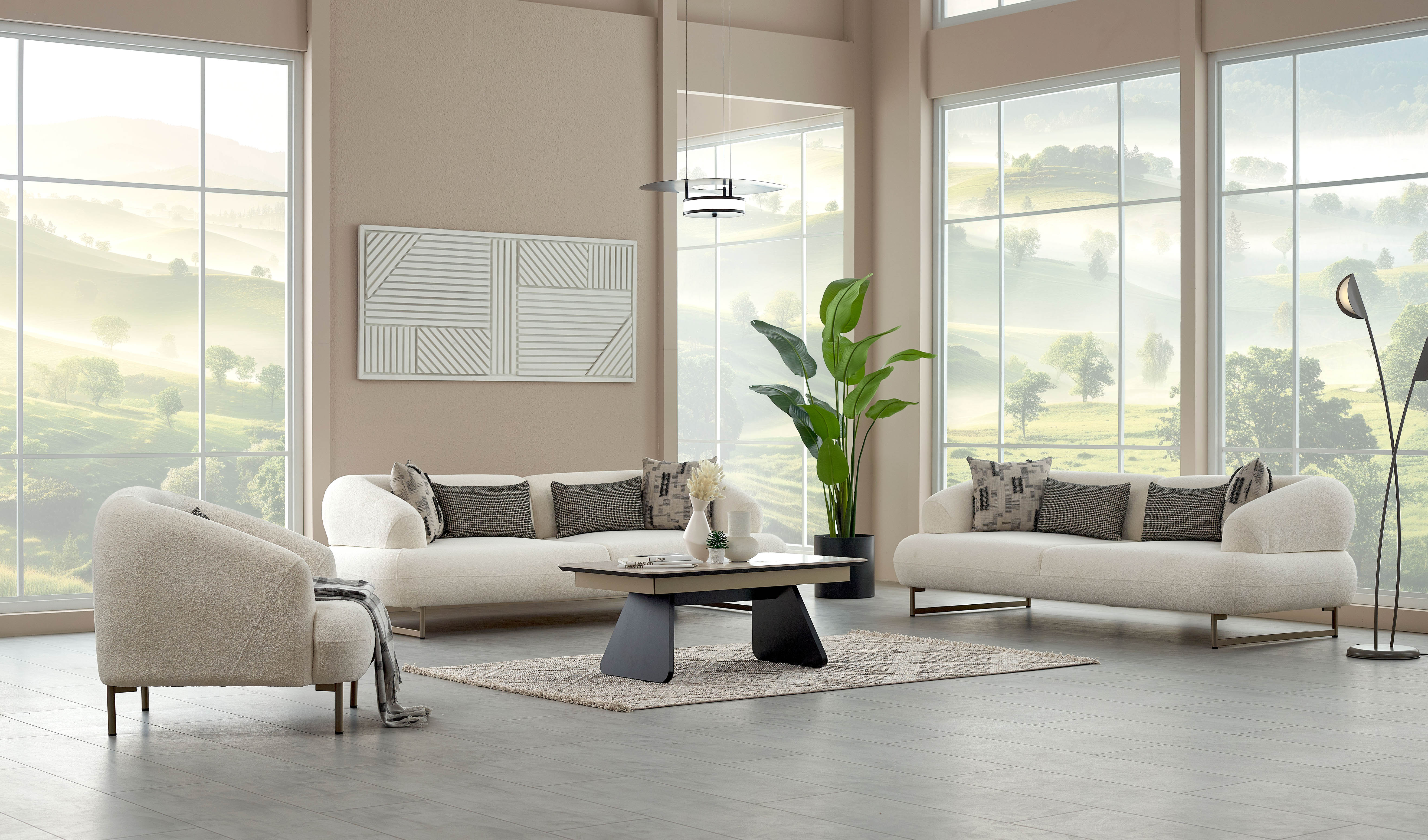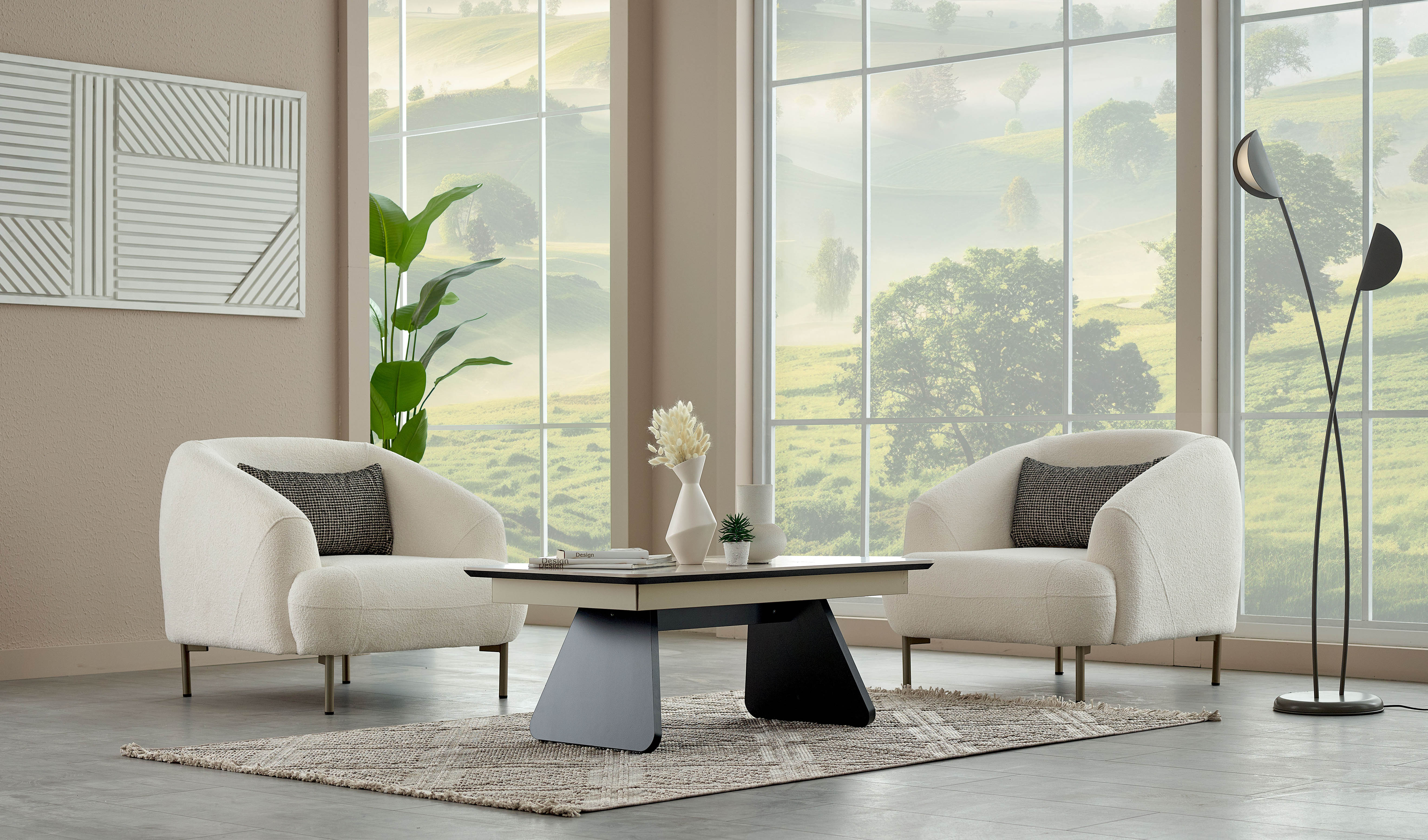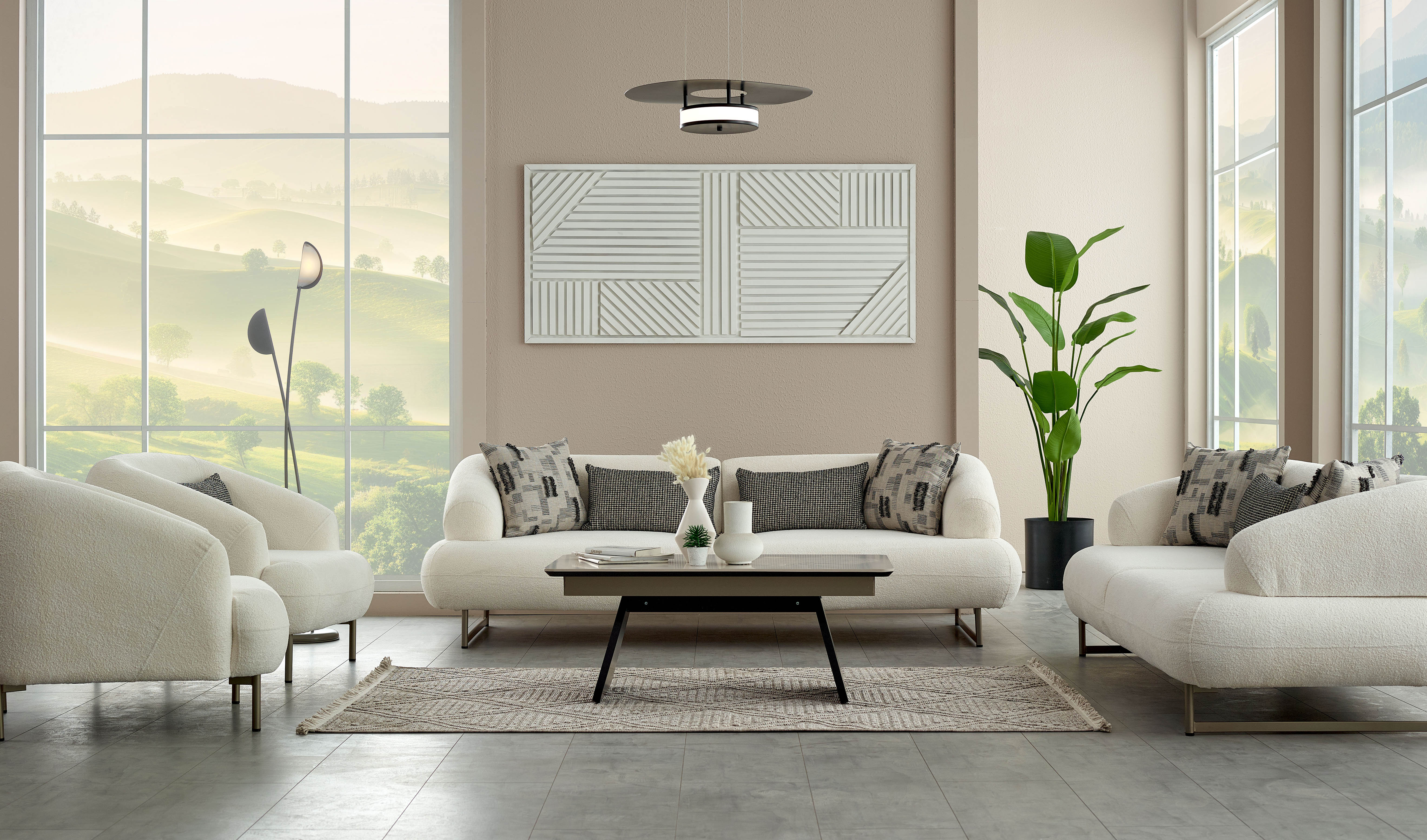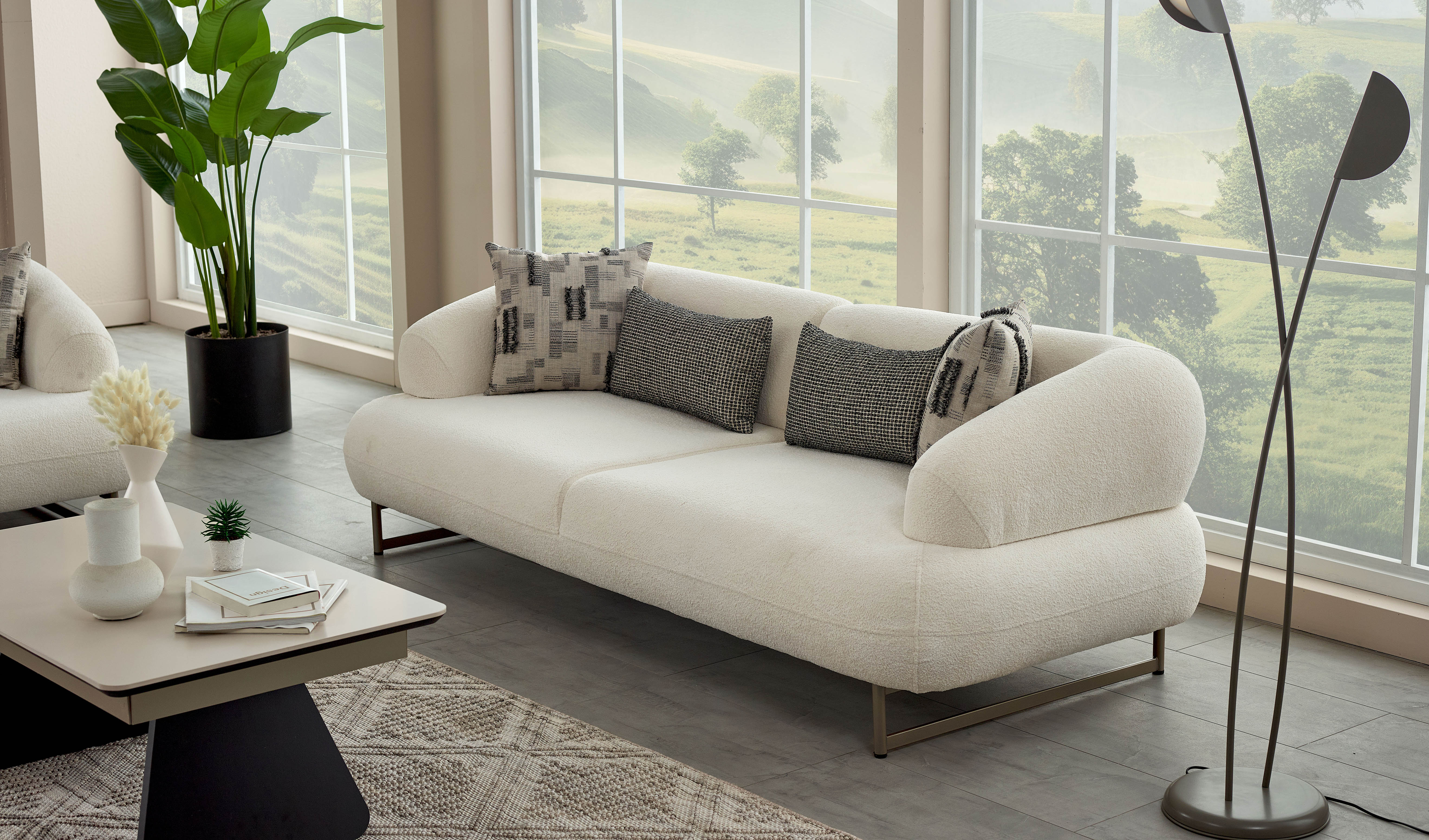 Modern tasarım çizgileriyle öne çıkan bu model, şönil kumaş uygulaması ile yumuşak dokunuşlar sunarken, desenli ve düz kırlent kombinasyonu estetik bir denge sağlıyor.
