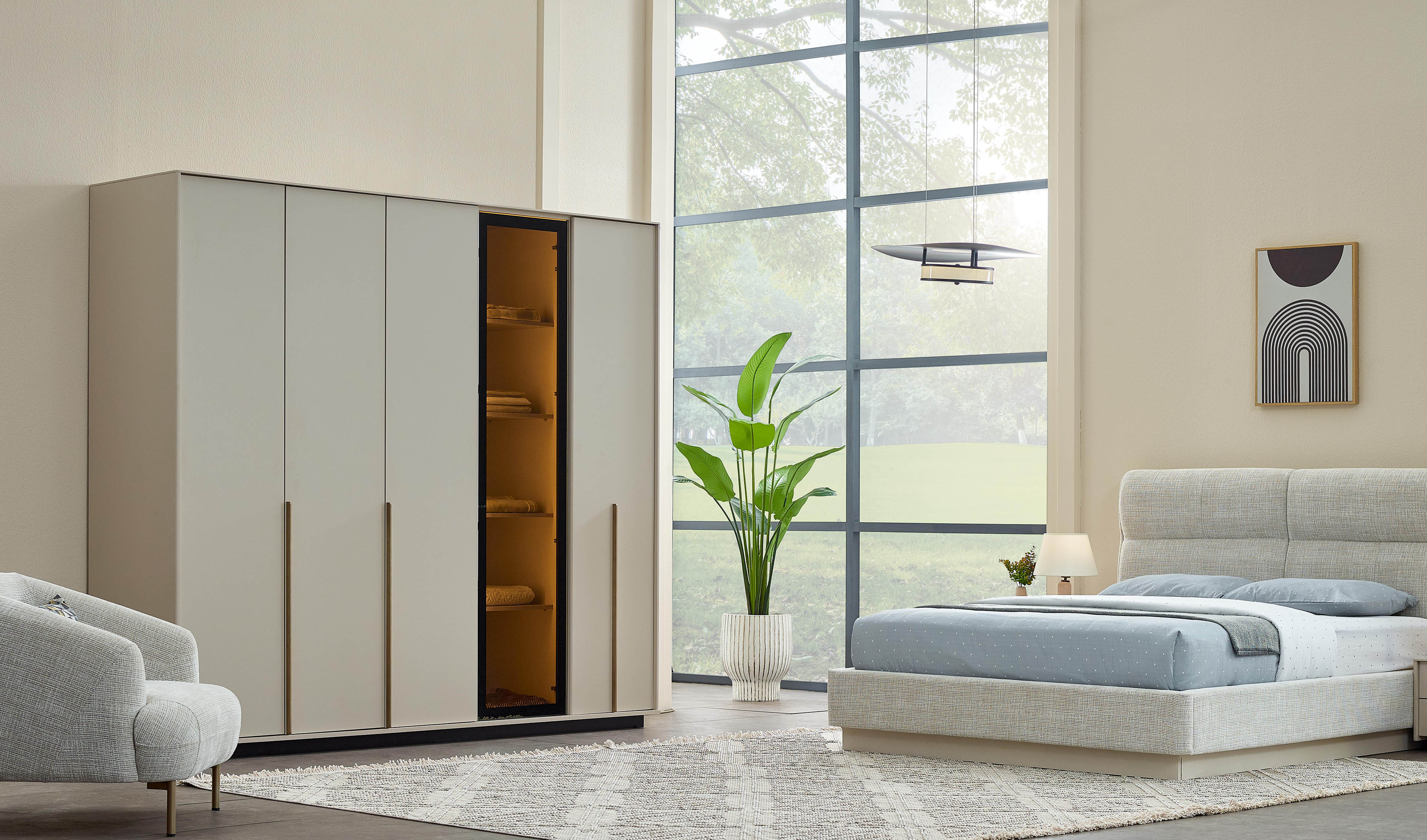 Modern tasarımı ve dolunay rengi ile zarif bir atmosfer sunan bu takım, takımla bütünleşen kulp ve ayak tasarımı ile estetiği tamamlıyor. Gardırop çekmeceleri, aydınlatma detayları ve reflekte cam uygulamaları modern bir dokunuş sağlarken, yavaşlatıcılı mekanizma ve yüksek ayak yapısı kullanım kolaylığı sunuyor.
