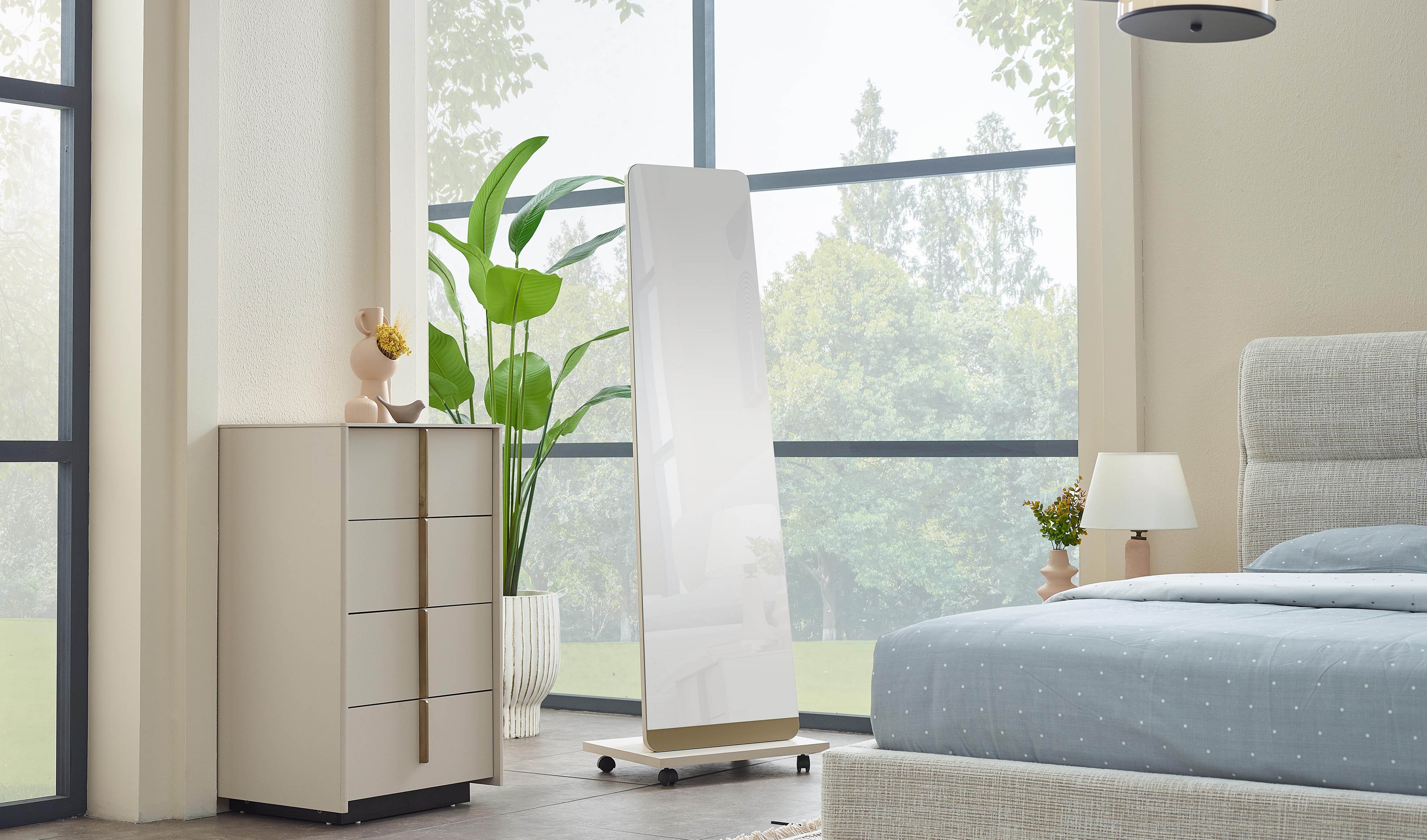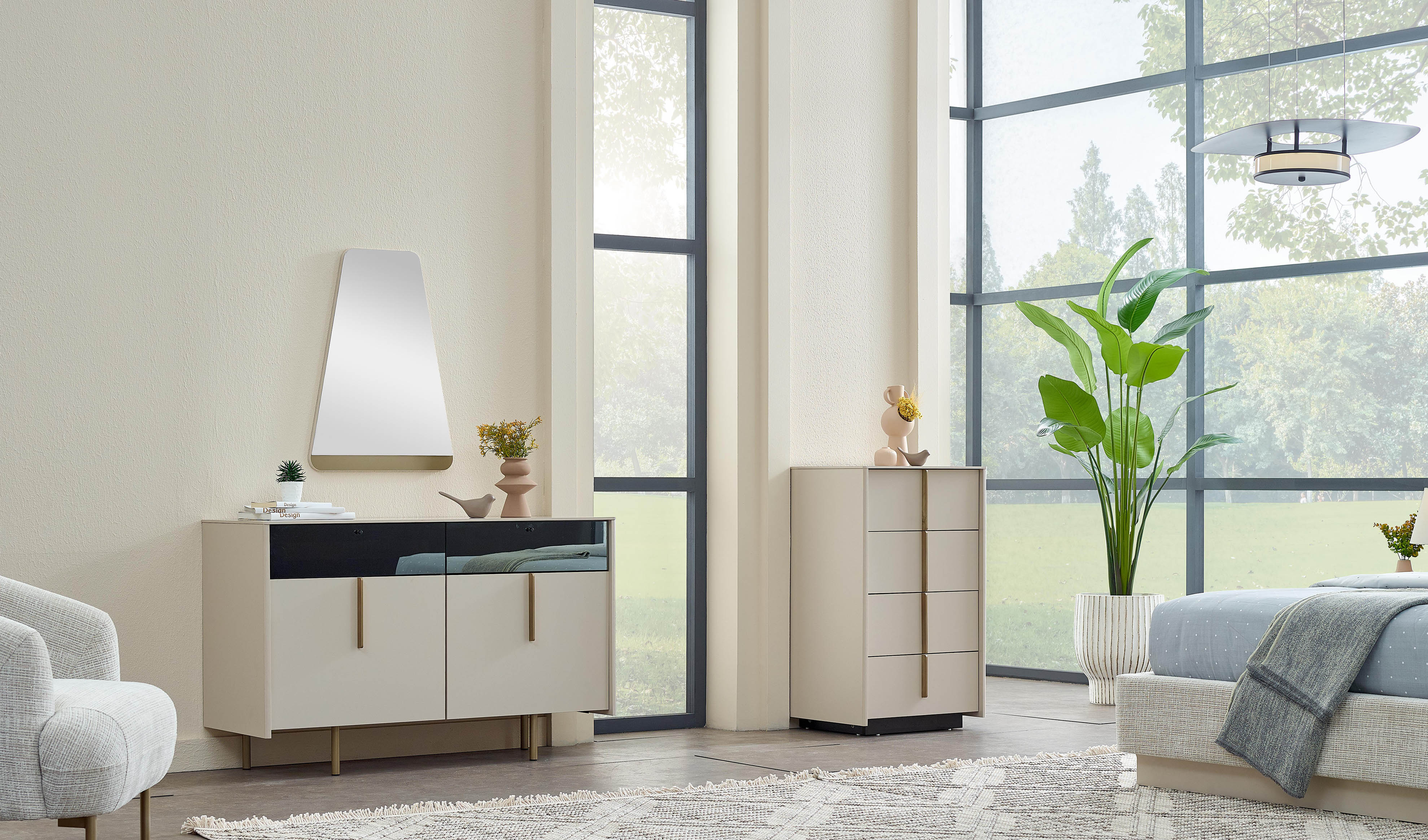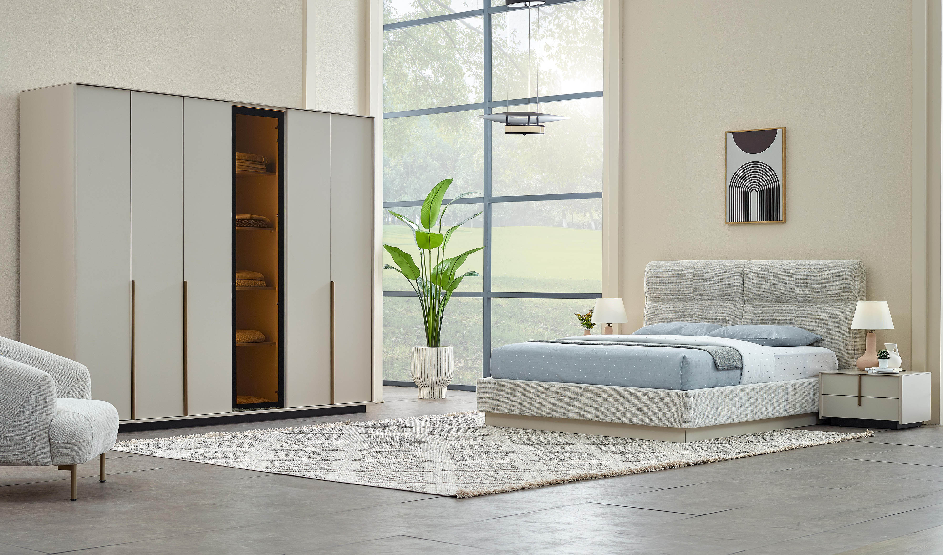 Modern tasarımı ve dolunay rengi ile zarif bir atmosfer sunan bu takım, takımla bütünleşen kulp ve ayak tasarımı ile estetiği tamamlıyor. Gardırop çekmeceleri, aydınlatma detayları ve reflekte cam uygulamaları modern bir dokunuş sağlarken, yavaşlatıcılı mekanizma ve yüksek ayak yapısı kullanım kolaylığı sunuyor.