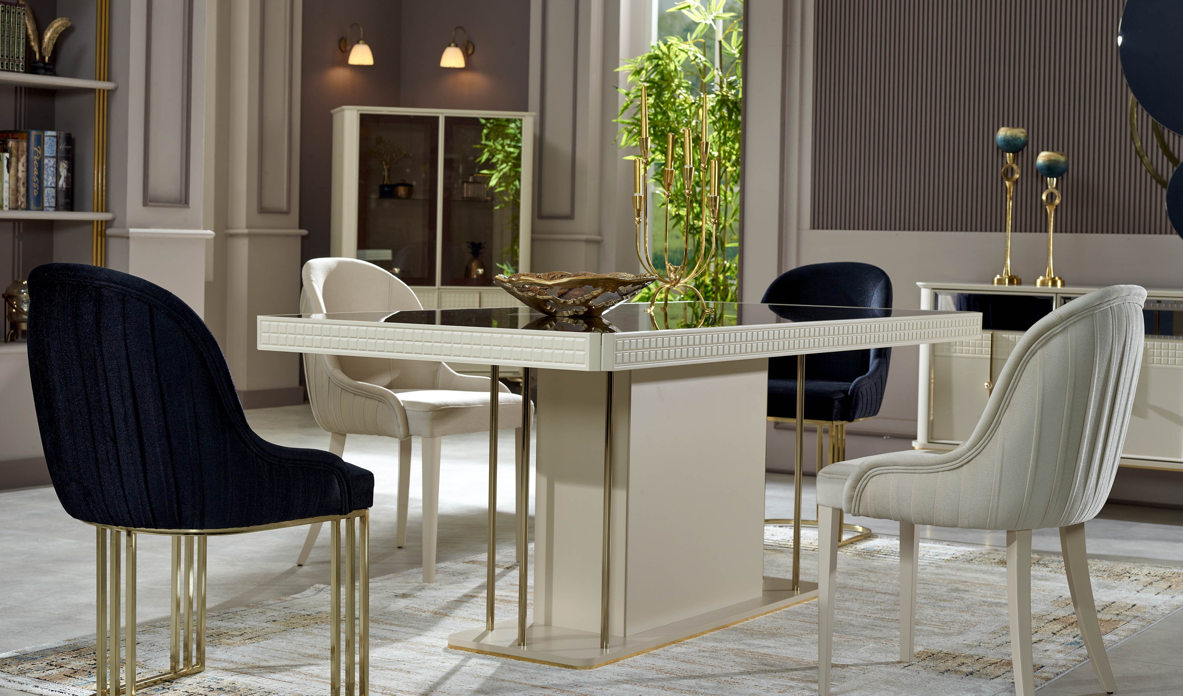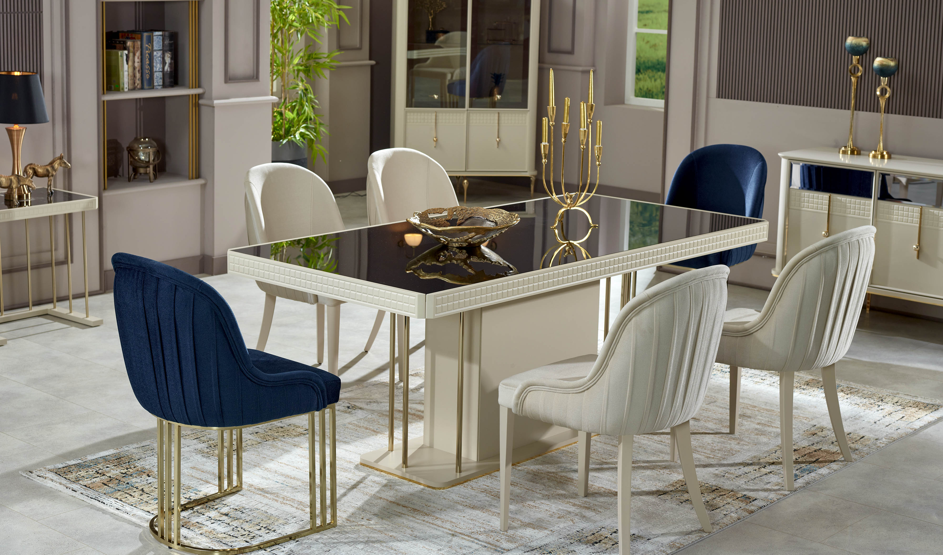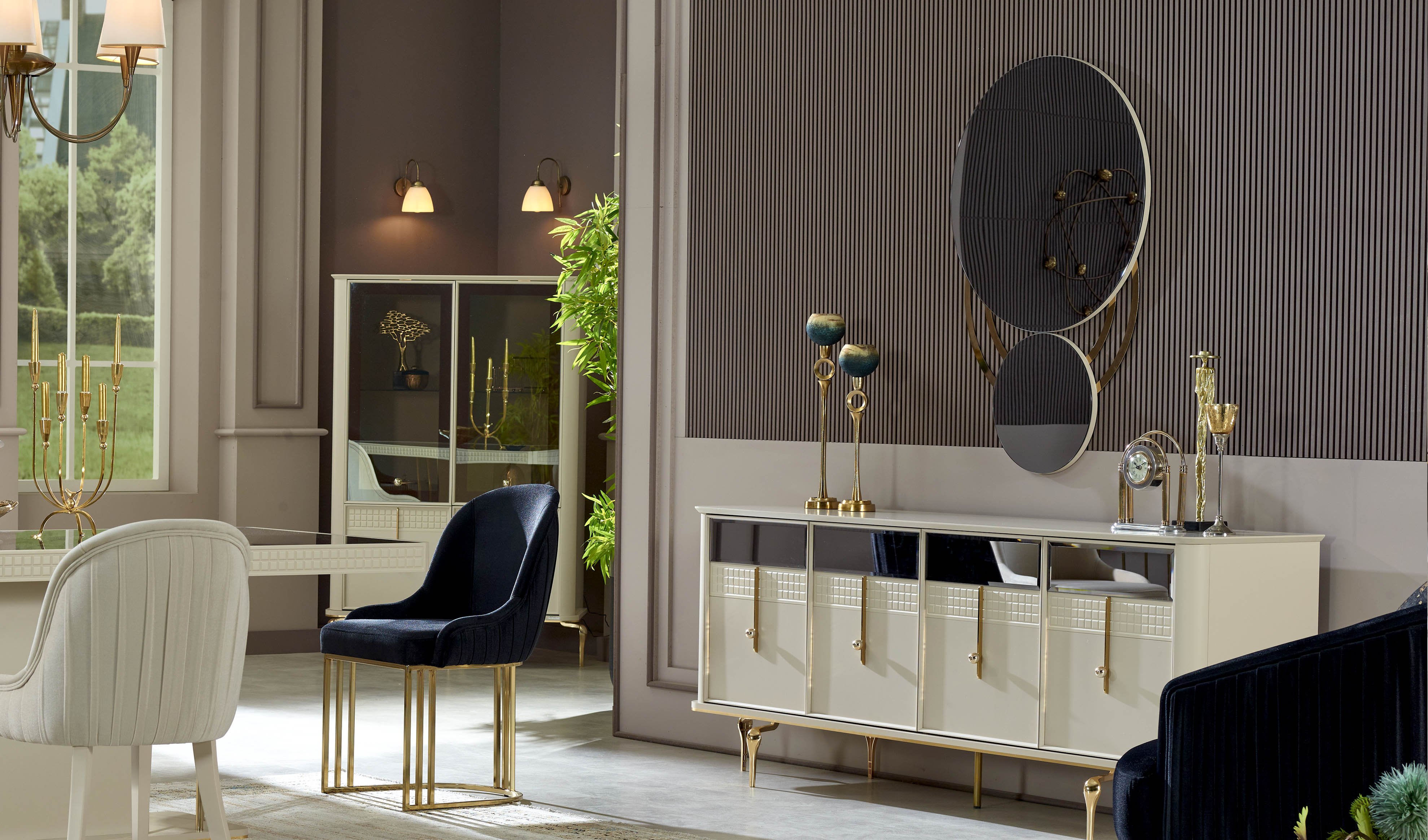 Sofranızda modern ve gösterişli bir atmosfer yaratmanın yolu Helenka Yemek Odasıyla mümkün. Seriye özel gold kaplamalı kulplar ve ayaklar, kapaklarda CNC işlemeli desenler ve konsol aynasındaki lazer kesim altın renk metal uygulamalar evinize lüks bir dokunuş katacak.