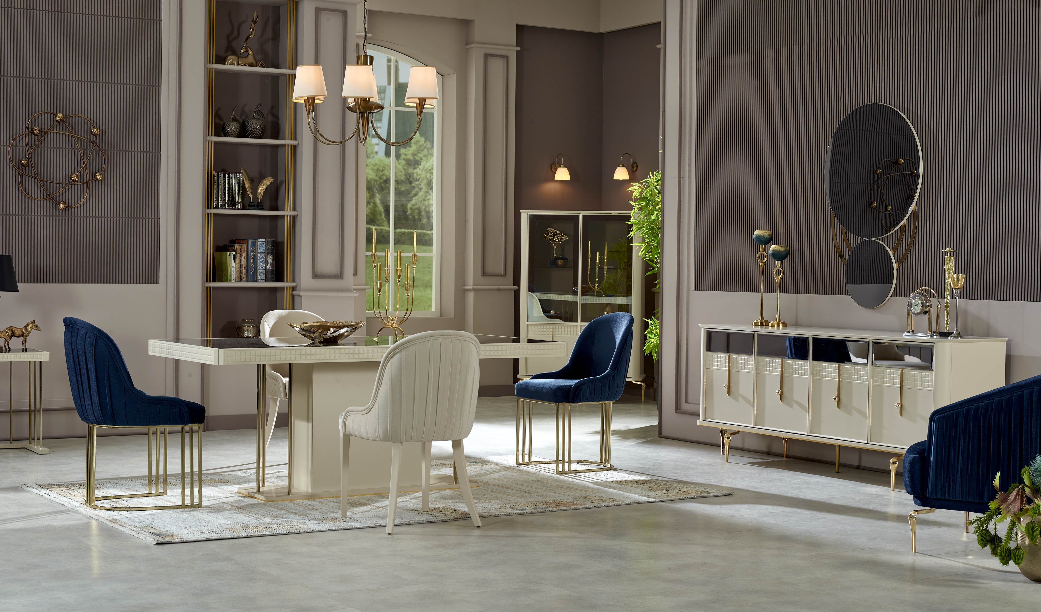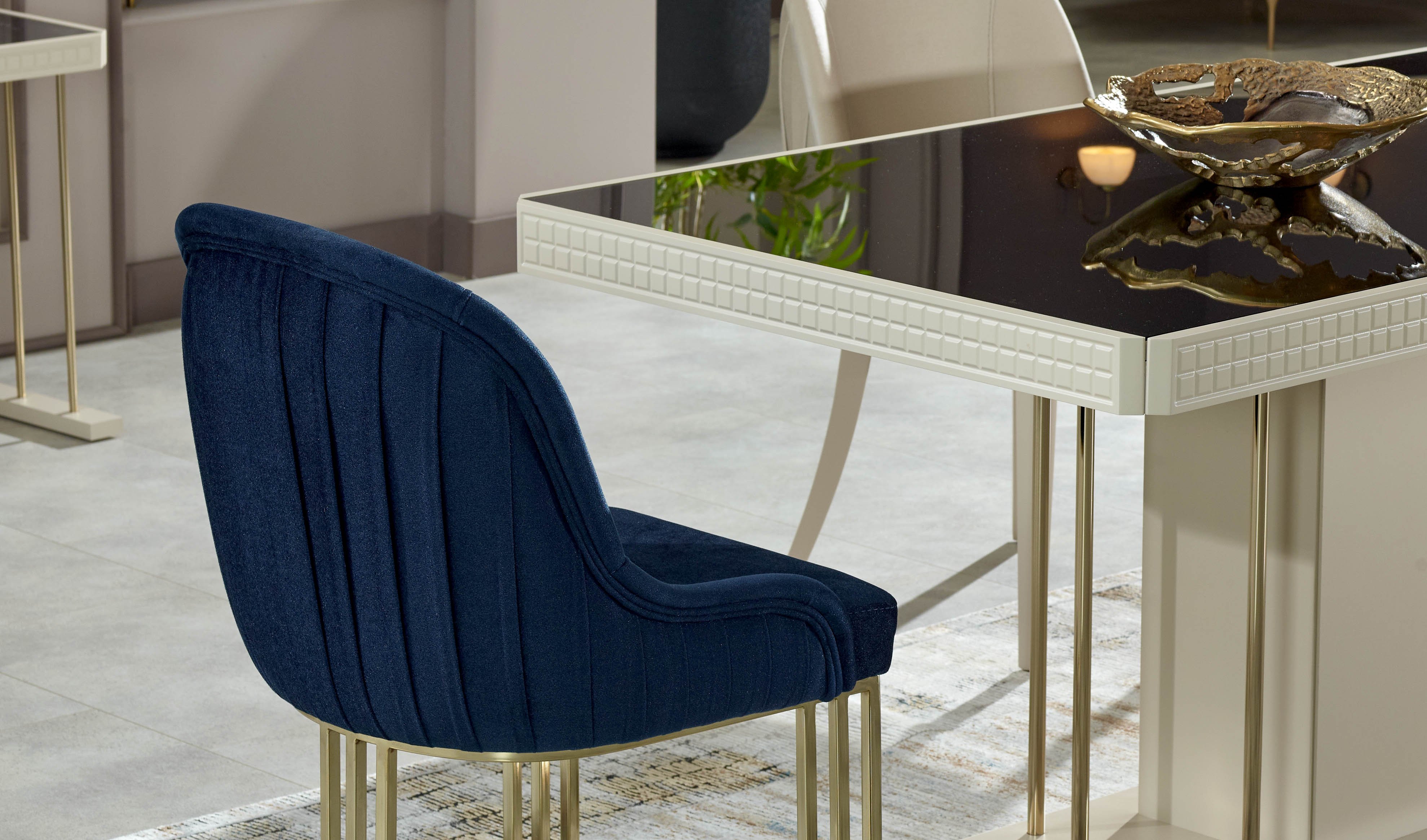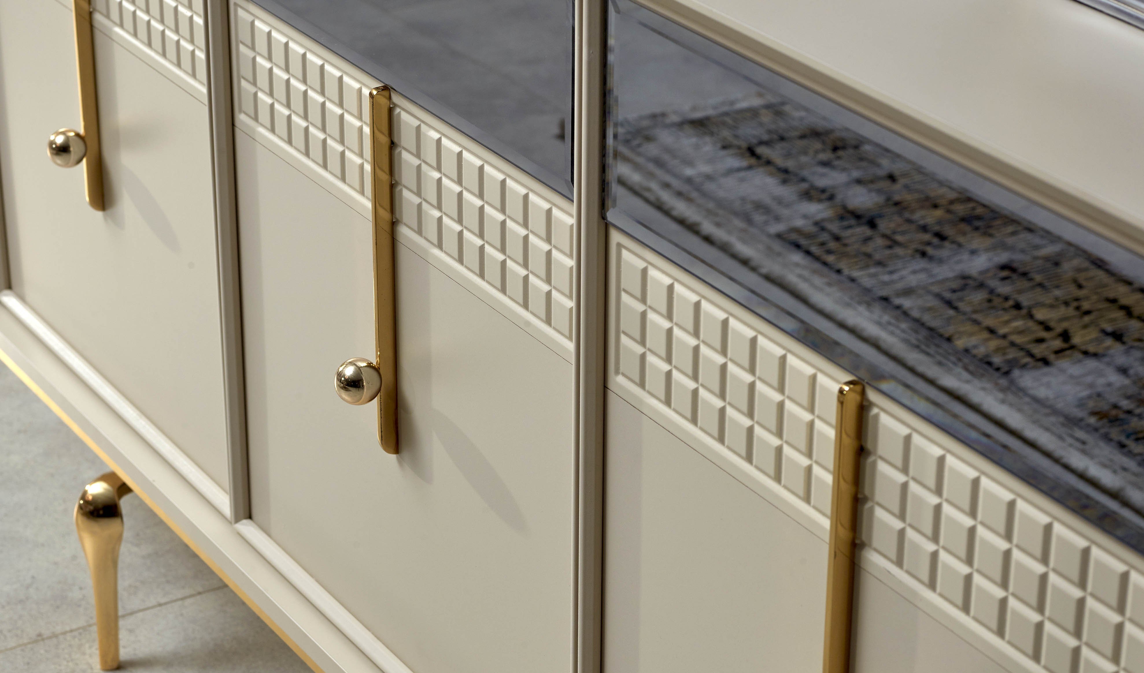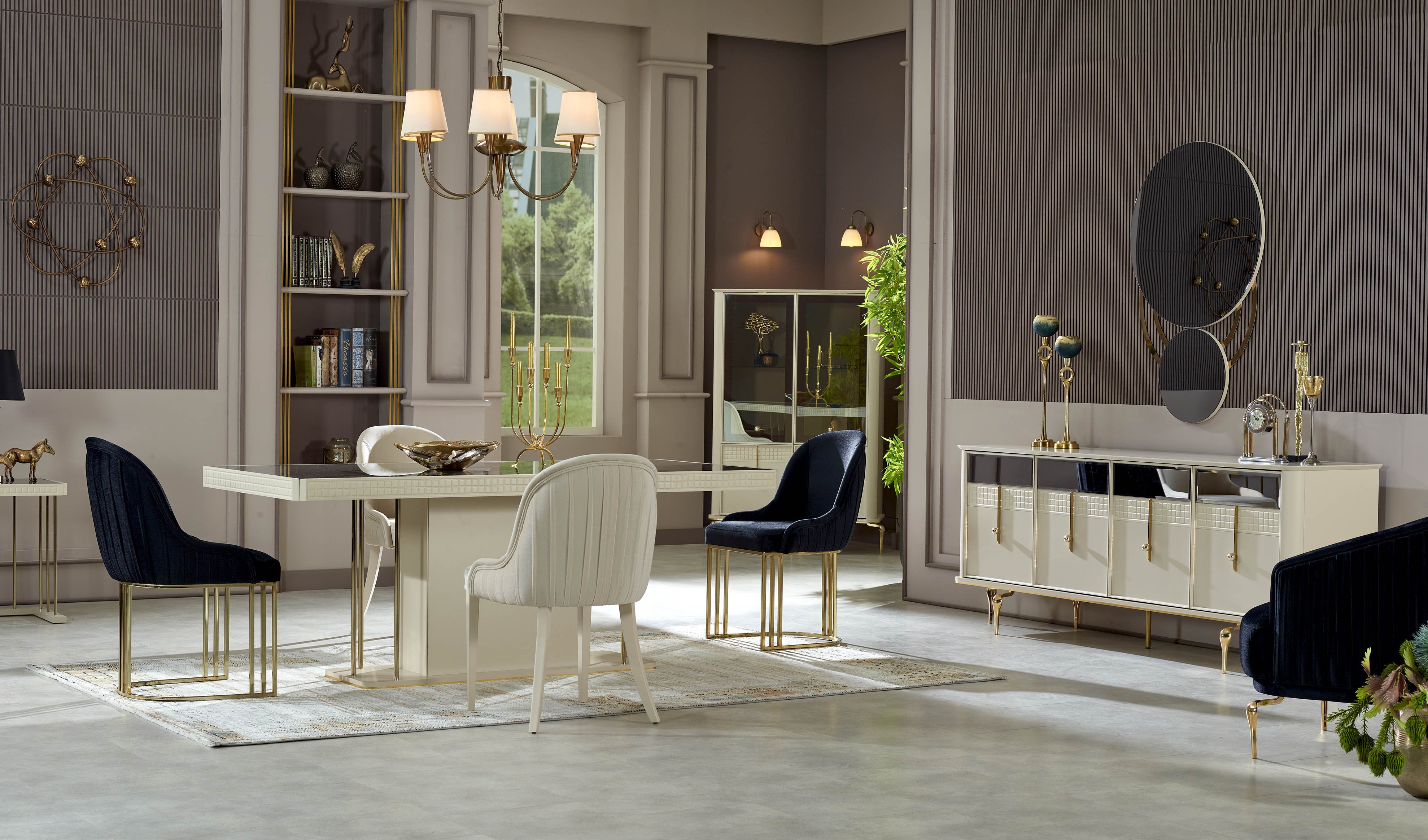 Sofranızda modern ve gösterişli bir atmosfer yaratmanın yolu Helenka Yemek Odasıyla mümkün. Seriye özel gold kaplamalı kulplar ve ayaklar, kapaklarda CNC işlemeli desenler ve konsol aynasındaki lazer kesim altın renk metal uygulamalar evinize lüks bir dokunuş katacak.