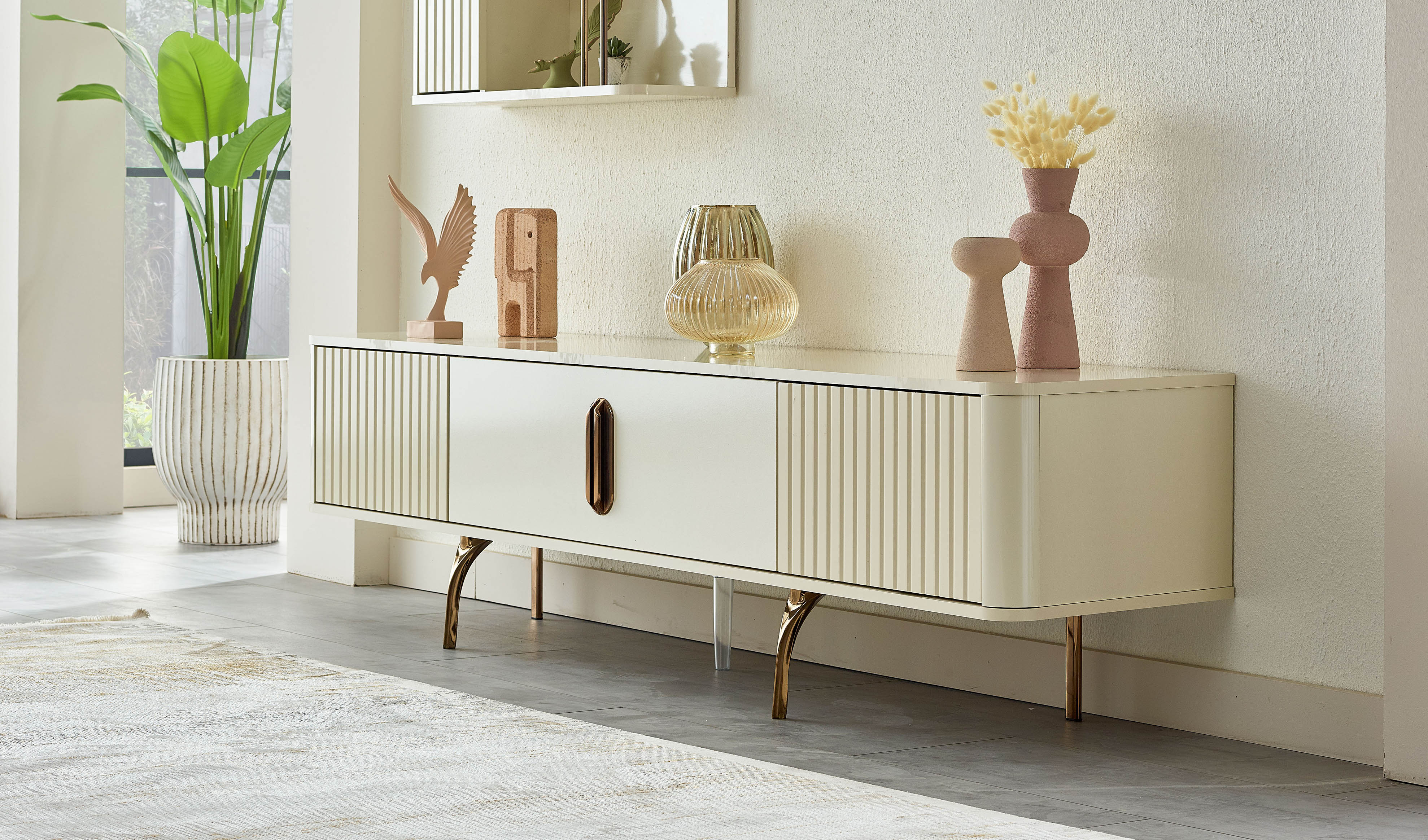 Metalik ekru ve bronz renk kombinasyonu ile modern bir duruş sergileyen bu TV ünitesi, seriye özel bronz kaplamalı kulp ve ayak tasarımı, CNC desenler ve ahşap profil detaylarıyla şıklığı tamamlıyor.
