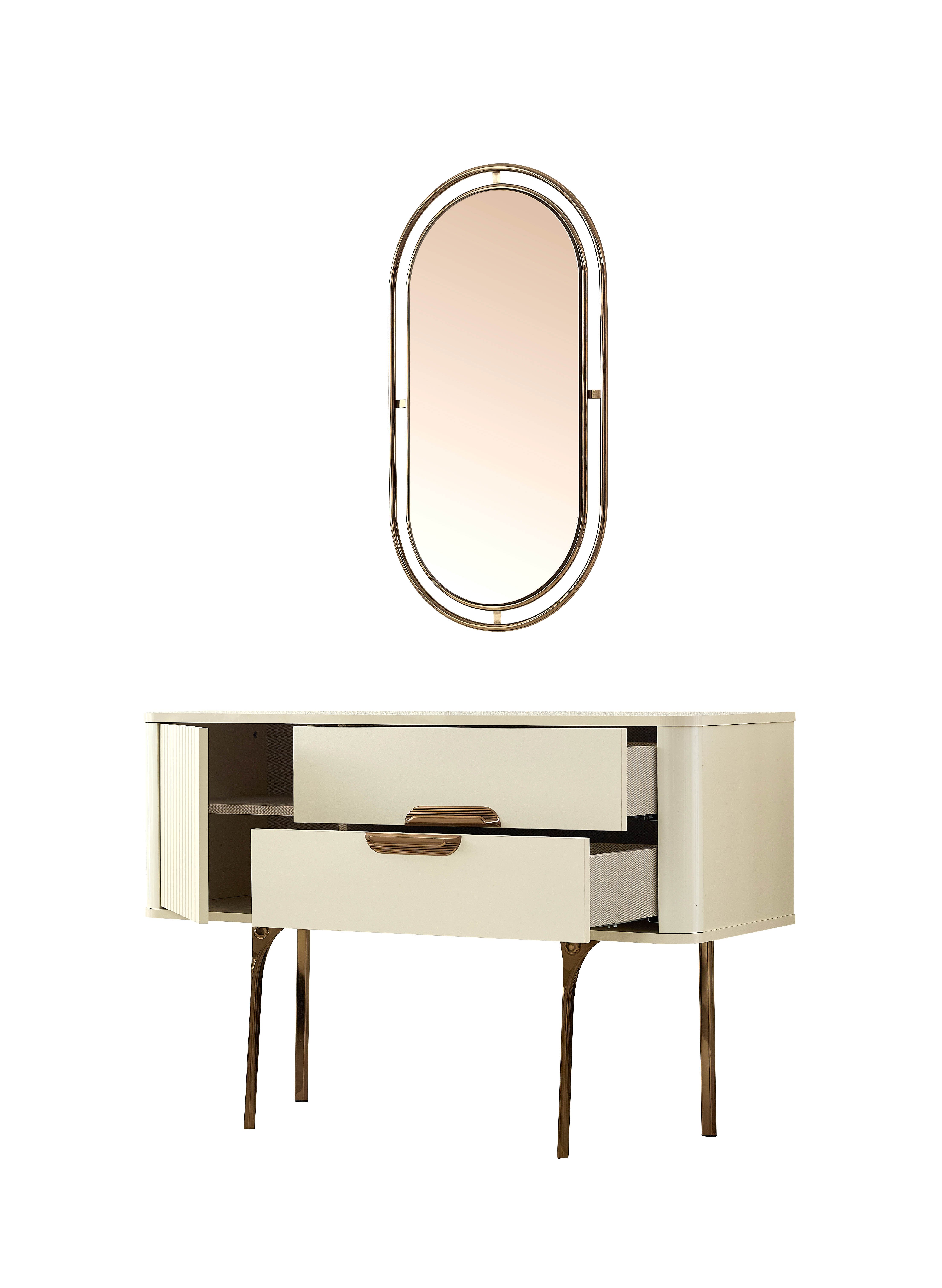 Metalik ekru ve bronz renk kombinasyonu ile modern bir dokunuş sunan bu özel seri, bronz kaplamalı kulp ve ayak tasarımı, CNC desen işçiliği ve ahşap profil detaylarıyla şıklığı ön plana çıkarıyor.