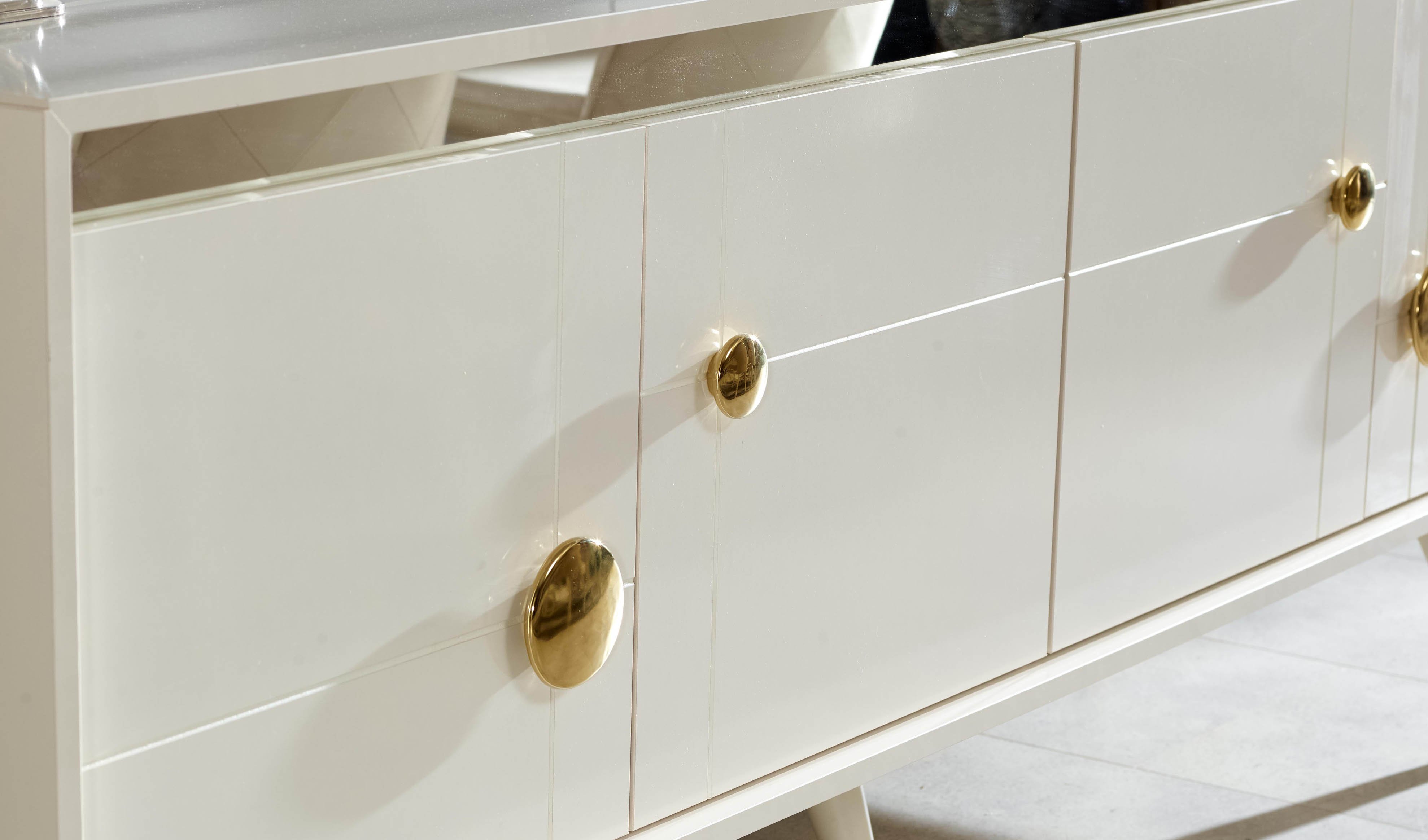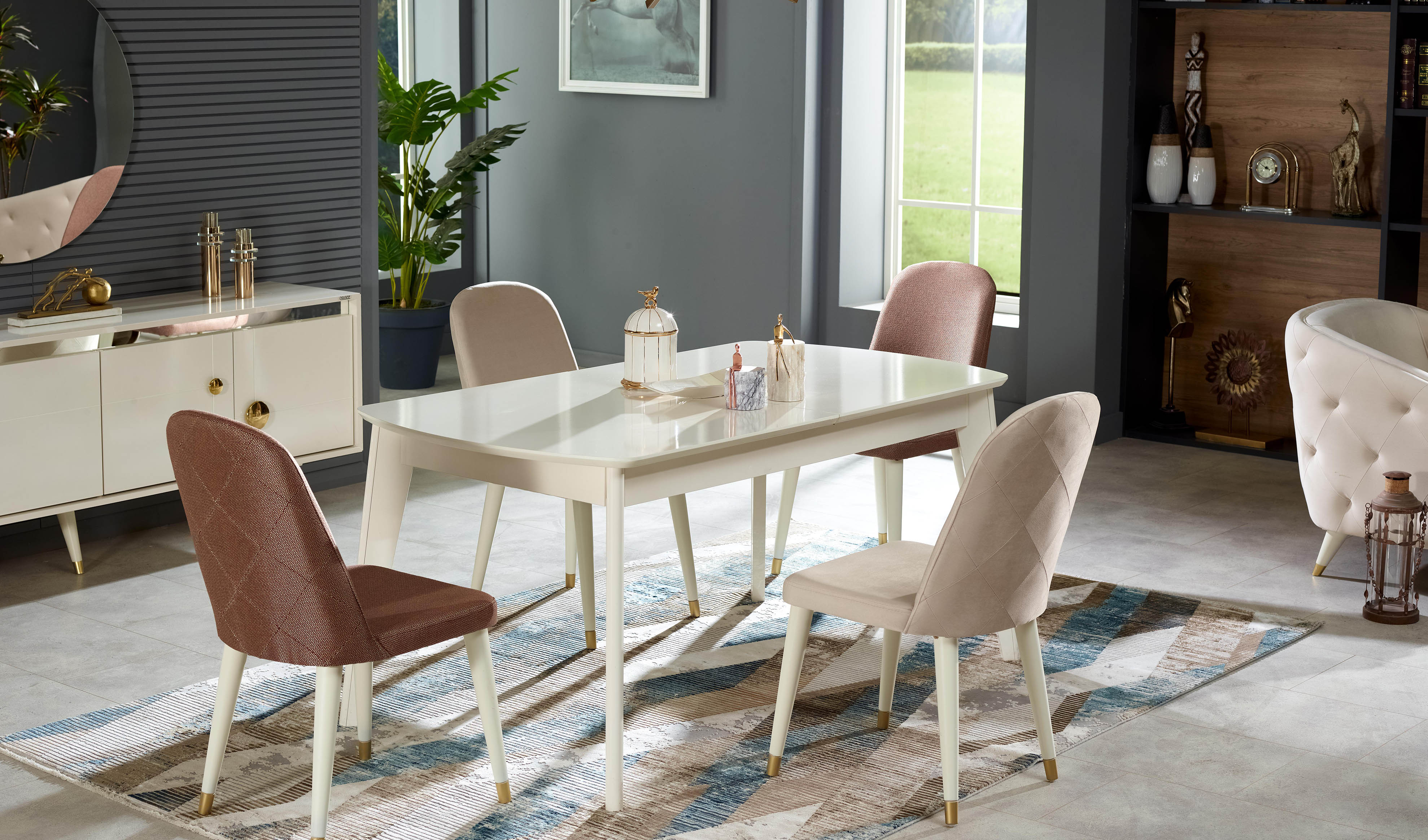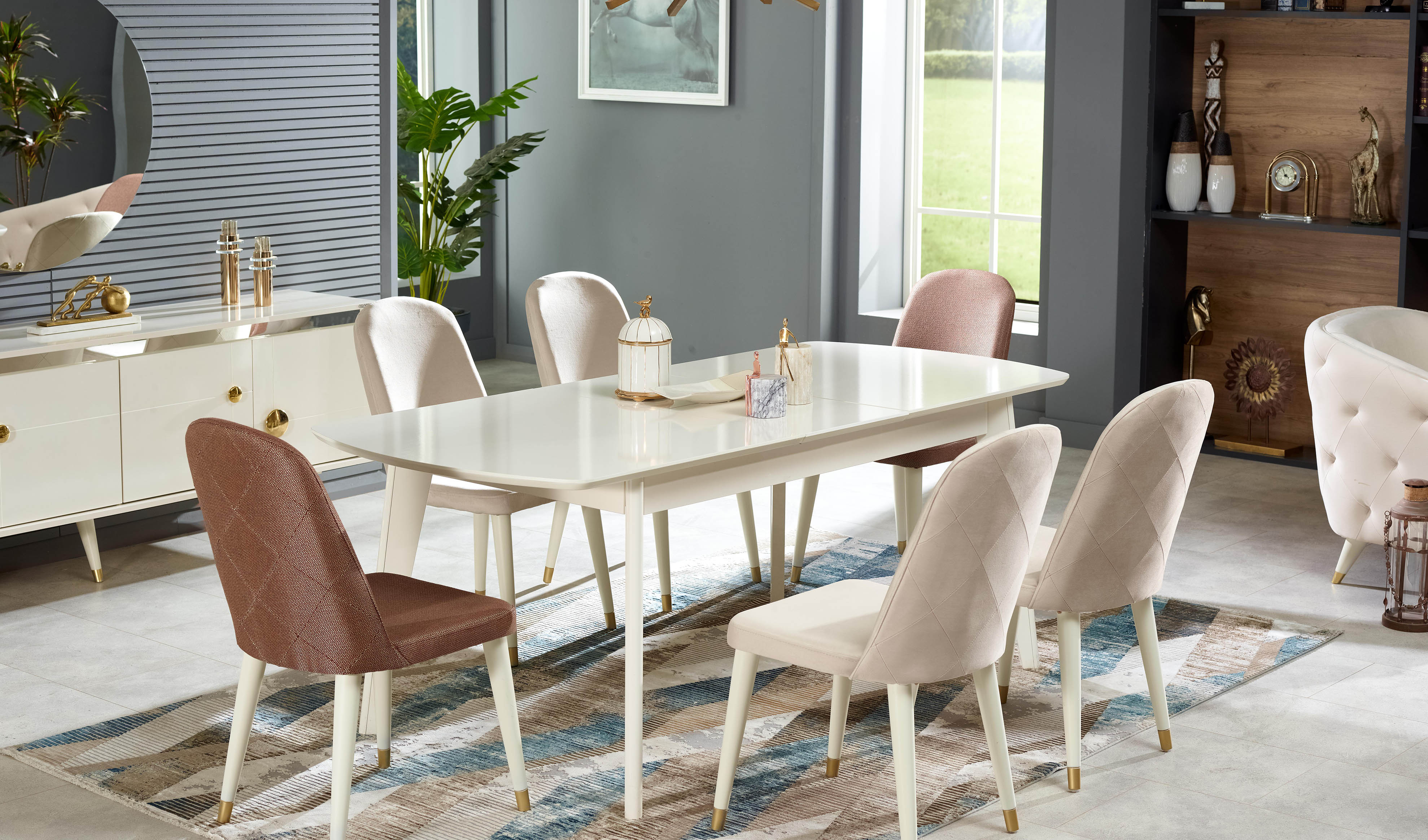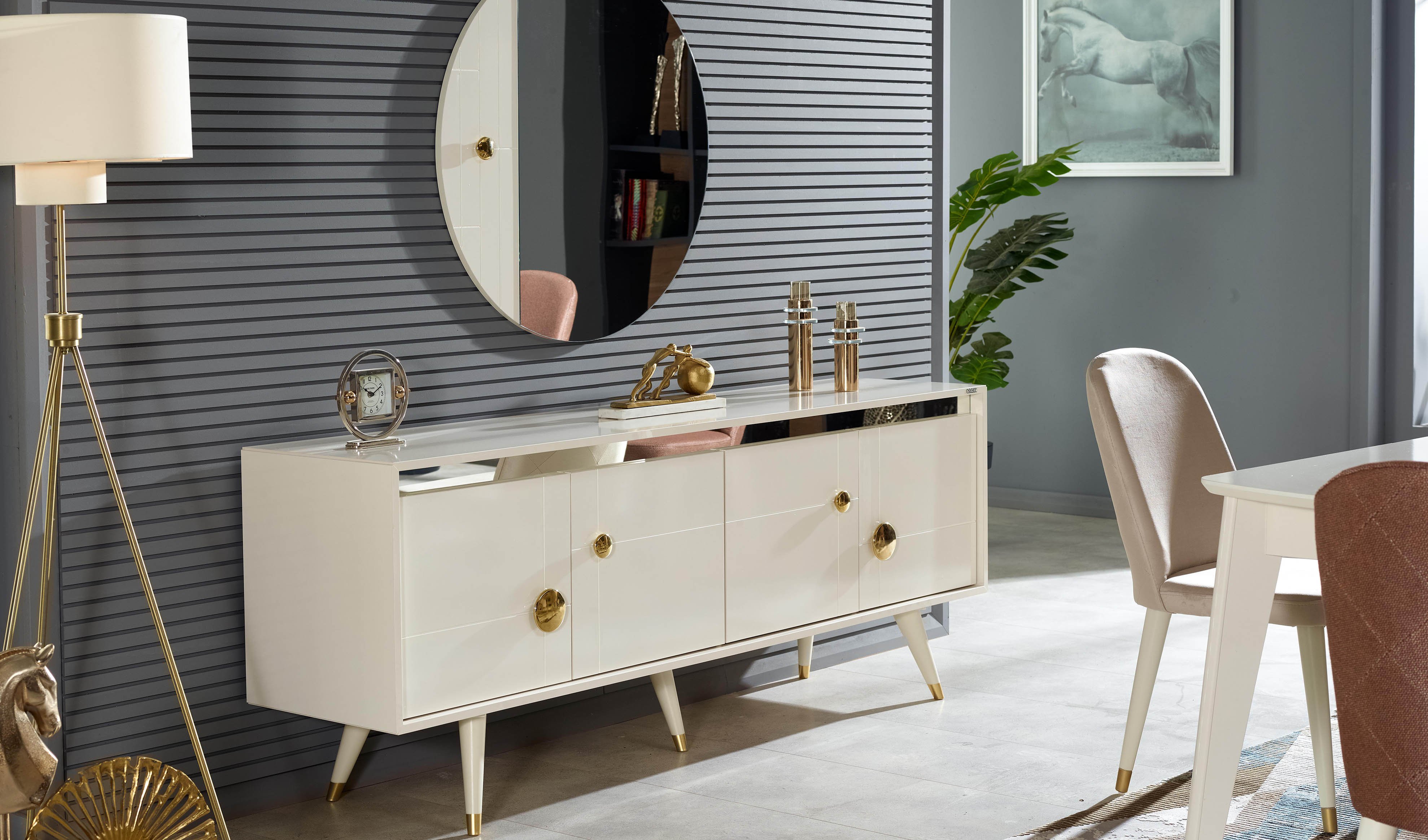 Bu yemek odası seti, modern çizgilerle şekillenen zarif tasarımı ve üstün işlevselliğiyle evinize benzersiz bir şıklık getiriyor. Modern ve şık tasarım anlayışıyla üretilen ürün, metalik ekru ve bronz renk kombinasyonu sayesinde sofistike bir görünüm sunar. Ürün detaylarında, seriye özel formda bronz renk kaplamalı kulp tasarımı ile seriye özel formda bronz renk kaplamalı ayak tasarımı özenle işlenmiştir. Ayrıca, modüllerde uygulanan ahşap profil ve cnc desen detayları, sıcak ve doğal dokunuşları mekanınıza taşır. Modül köşelerindeki soft işleme detayları zarafeti tamamlayan ince dokunuşlar sunarken, dekoratif ögeler arasında yer alan bronz renk ayna ve konsol aynalıkta modern metal çerçeve uygulaması, odanıza çağdaş bir lüks katar.