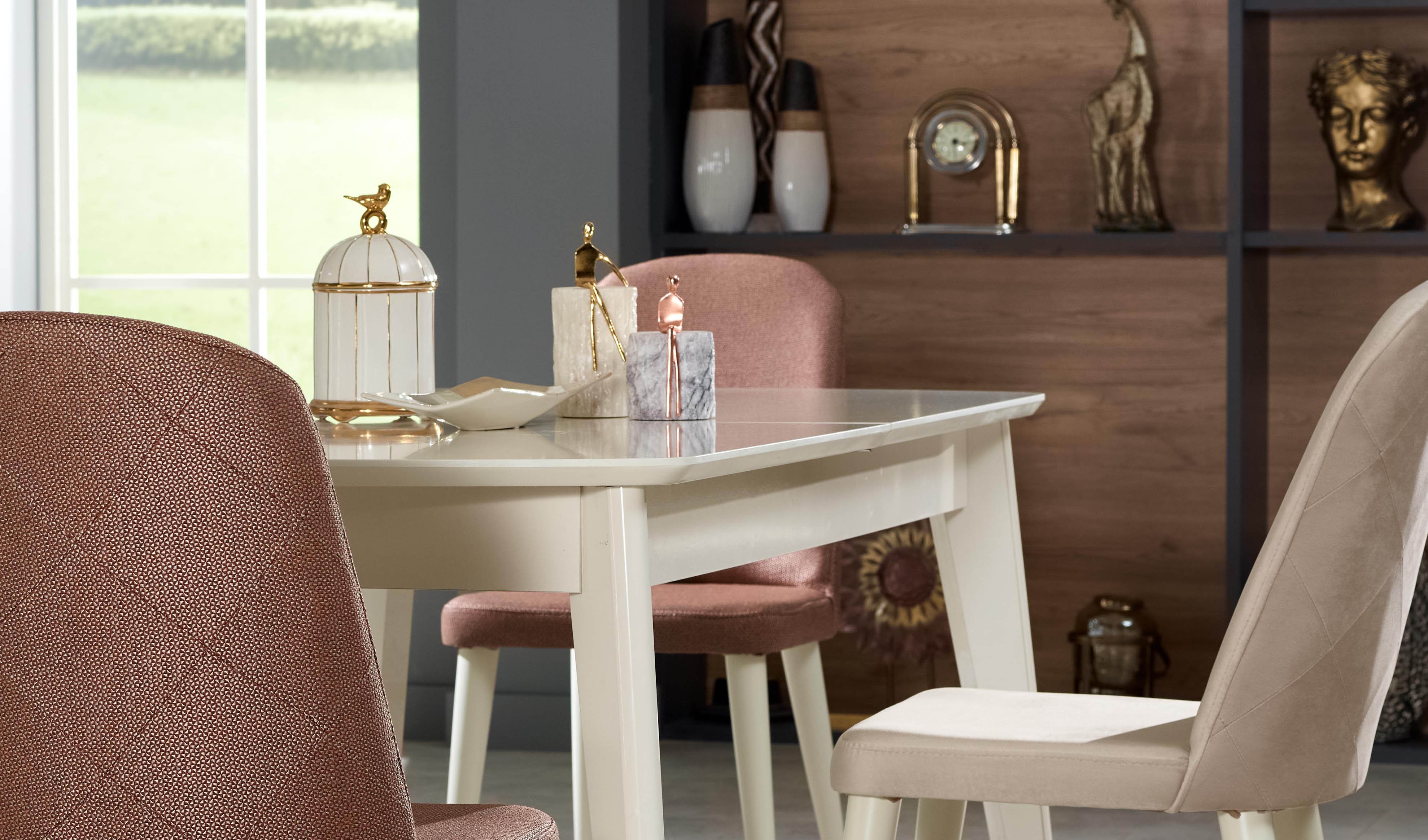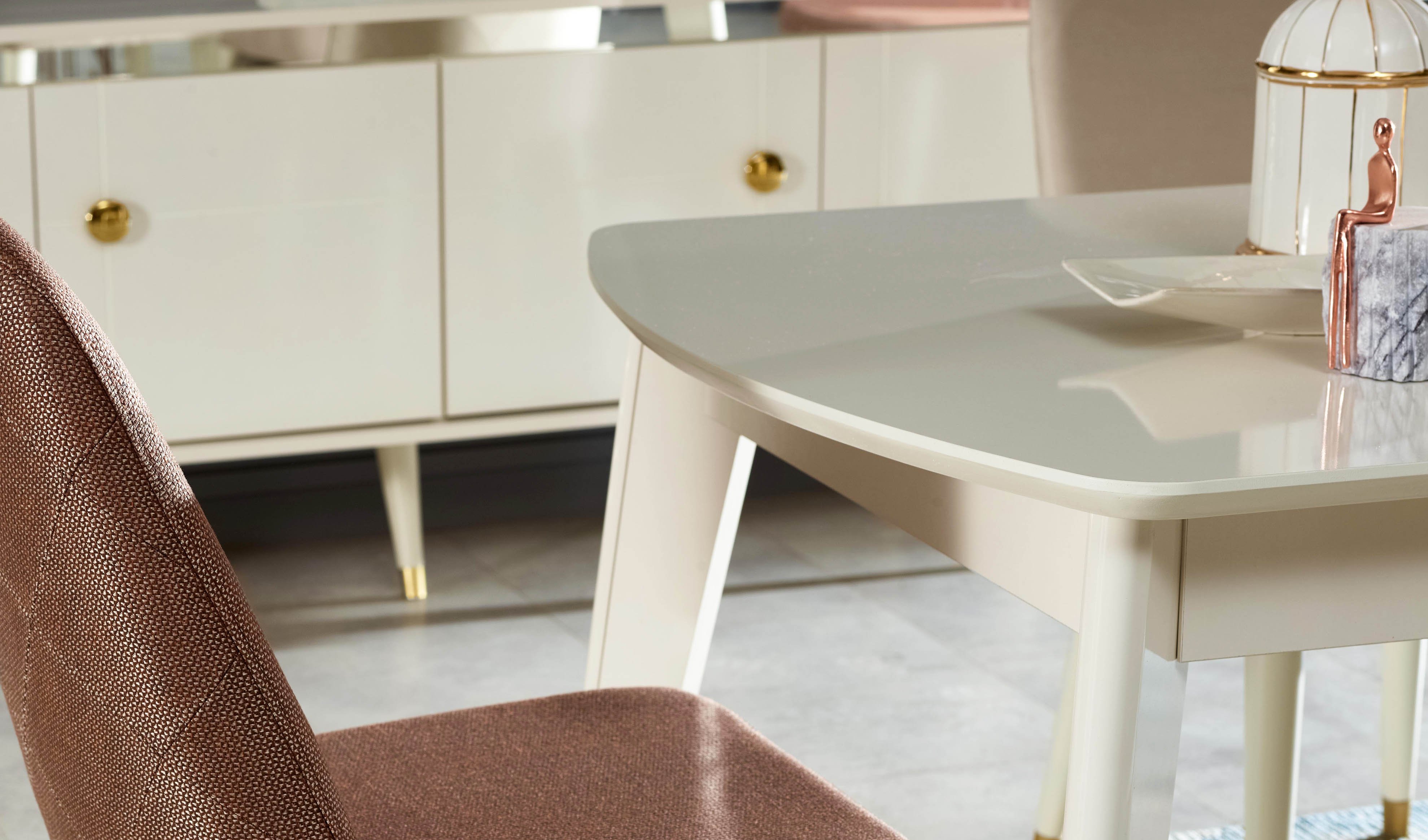 Yemek masası ise, sabit ve açılır modül seçeneği ile esnek kullanım imkanı sağlar. Açılır yemek masasındaki bronz kaplamalı metal ayak detayı ve sabit yemek masasındaki balık sırtı ayak uygulaması, hem görsel hem de fonksiyonel olarak öne çıkar. Üstelik, temizliği kolaylaştıran yüksek ayak yapısı ve kapaklarda uygulanan yavaşlatıcılı mekanizma sayesinde kullanım kolaylığı ve ürün ömrü maksimize edilir. Seriyle uyumlu ahşap ve bronz kaplamalı metal ayaklı sandalye tasarımı, yemek odanızı tamamlayarak konfor ve şıklığı bir araya getirir. Tüm bu detaylar, çevre ve insan sağlığına duyarlı E-1 kalite standartlarında, kanserojen madde içermeyen malzemelerle üretilmiştir.