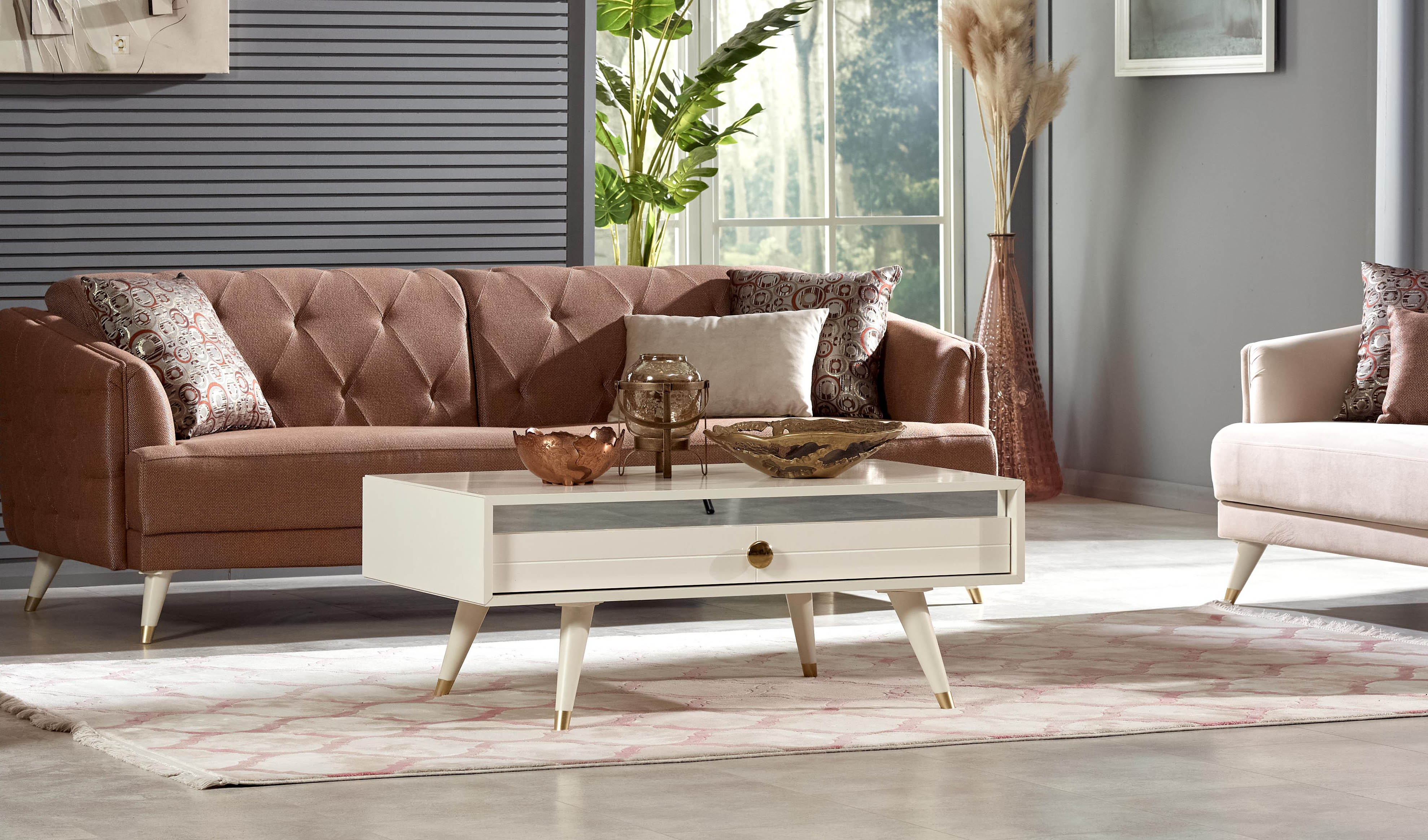 Bu sehpa, modern ve şık tasarımı ile yaşam alanlarınıza estetik ve işlevselliği bir arada sunuyor. Metalik ekru ve bronz renk kombinasyonu, zarif ve lüks bir atmosfer oluştururken, seriye özel formda bronz renk kaplamalı ayak tasarımı detaylardaki inceliği gözler önüne seriyor. Modül köşelerinde soft işleme detayları, tasarıma zarif bir dokunuş katarken, kolay temizlenme ve taşınabilme özelliği, kullanım konforunu maksimum seviyeye çıkarıyor. Ayrıca, E-1 kalite standartlarına uygun, insan sağlığına ve çevreye zarar vermeyen malzemeler kullanılarak üretilmiştir.