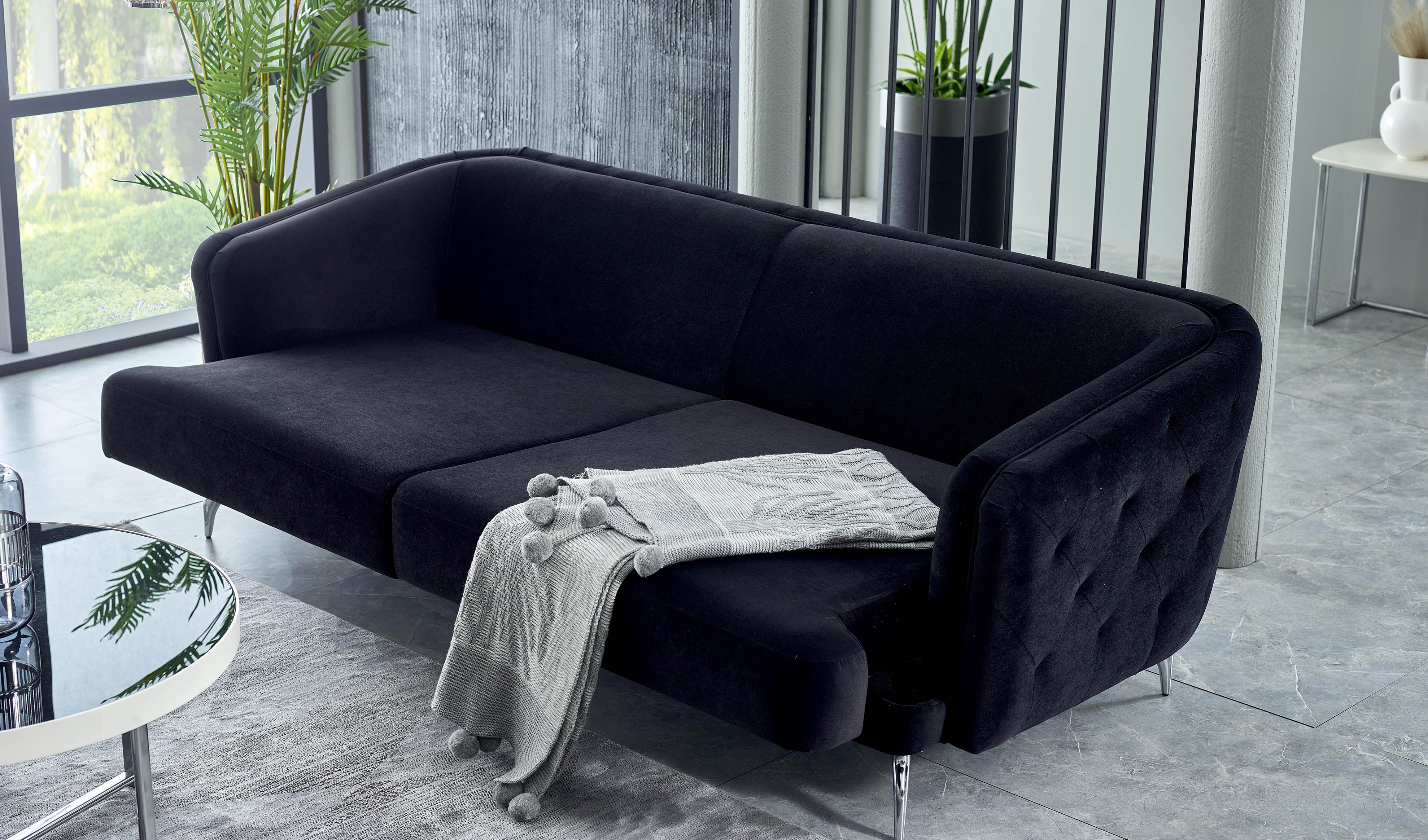 Kadife dokulu örme kumaş yapısı, kolay temizlenebilir özellikte olup, yerden yüksek ayakları sayesinde pratik bir temizlik deneyimi sunuyor.