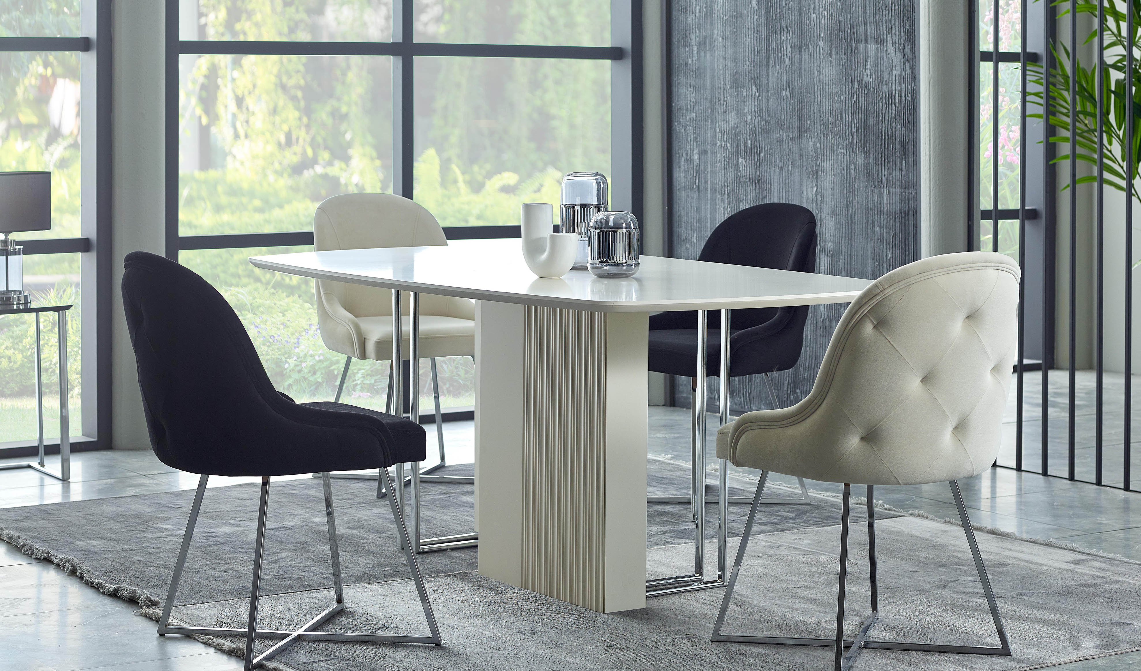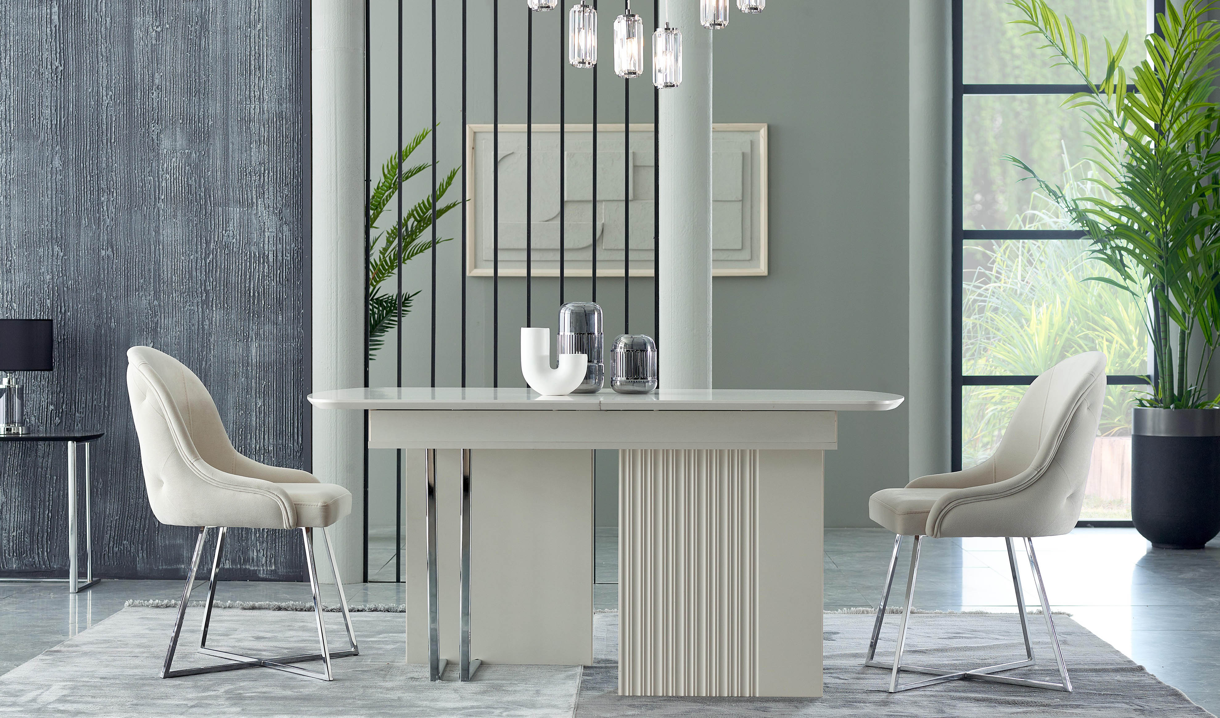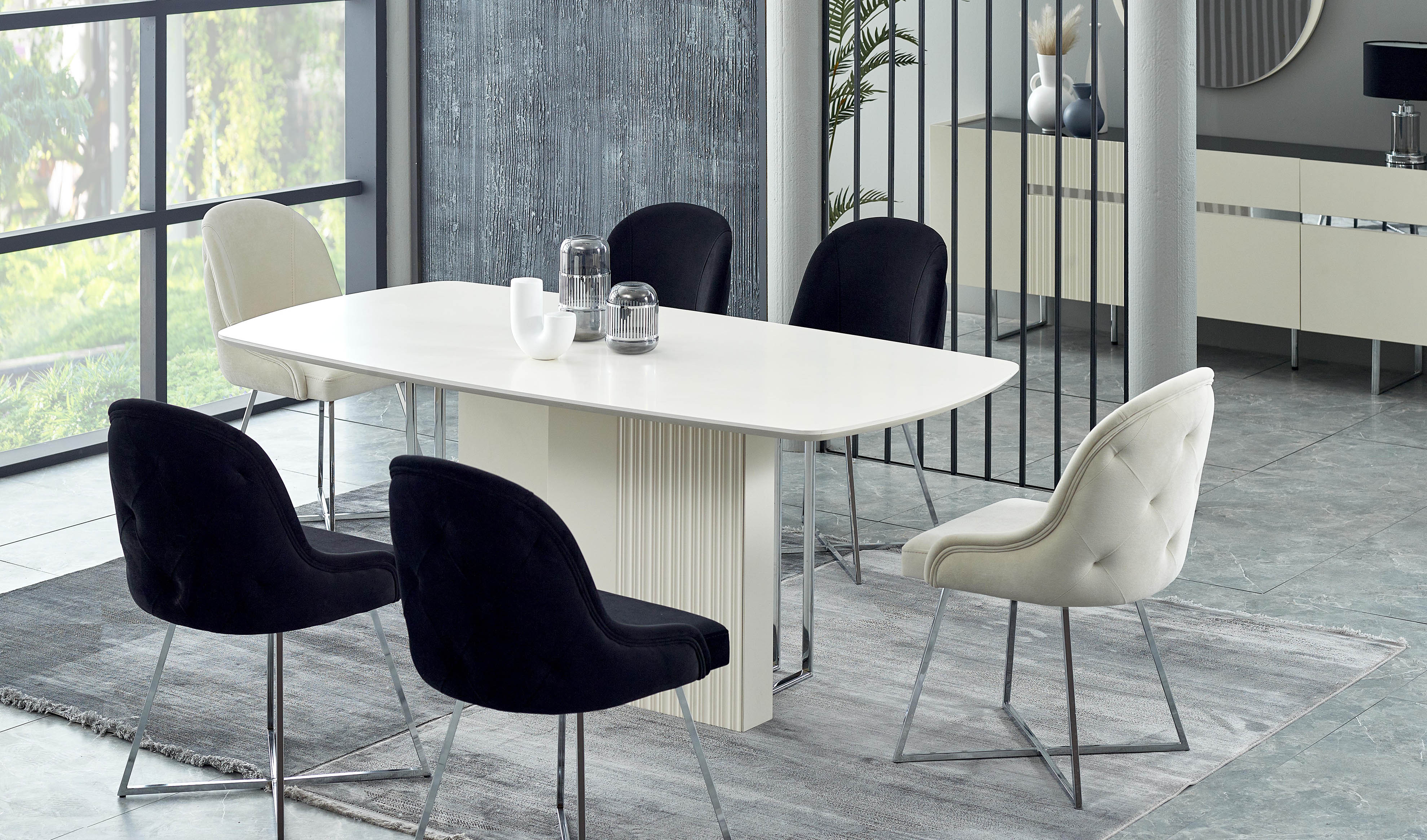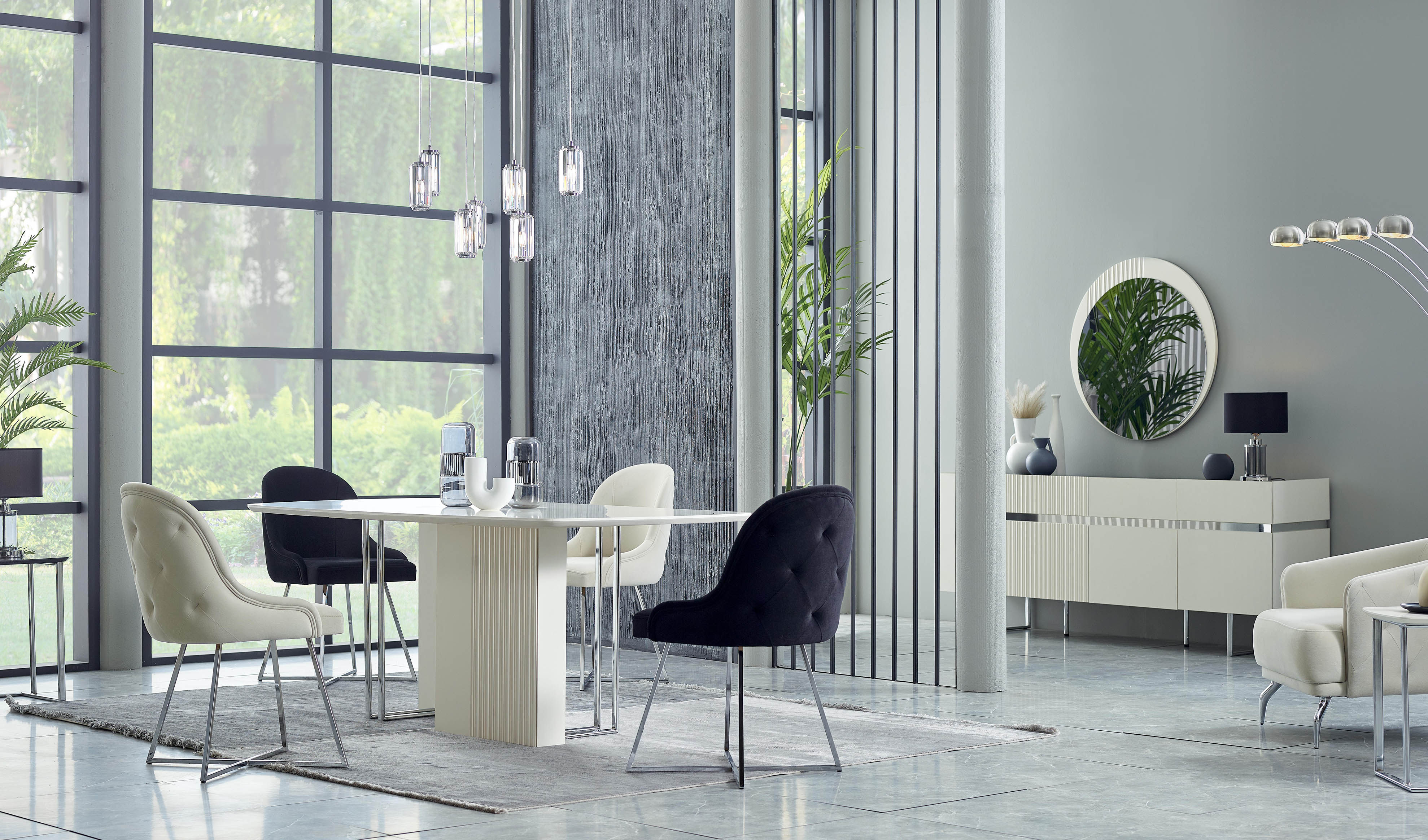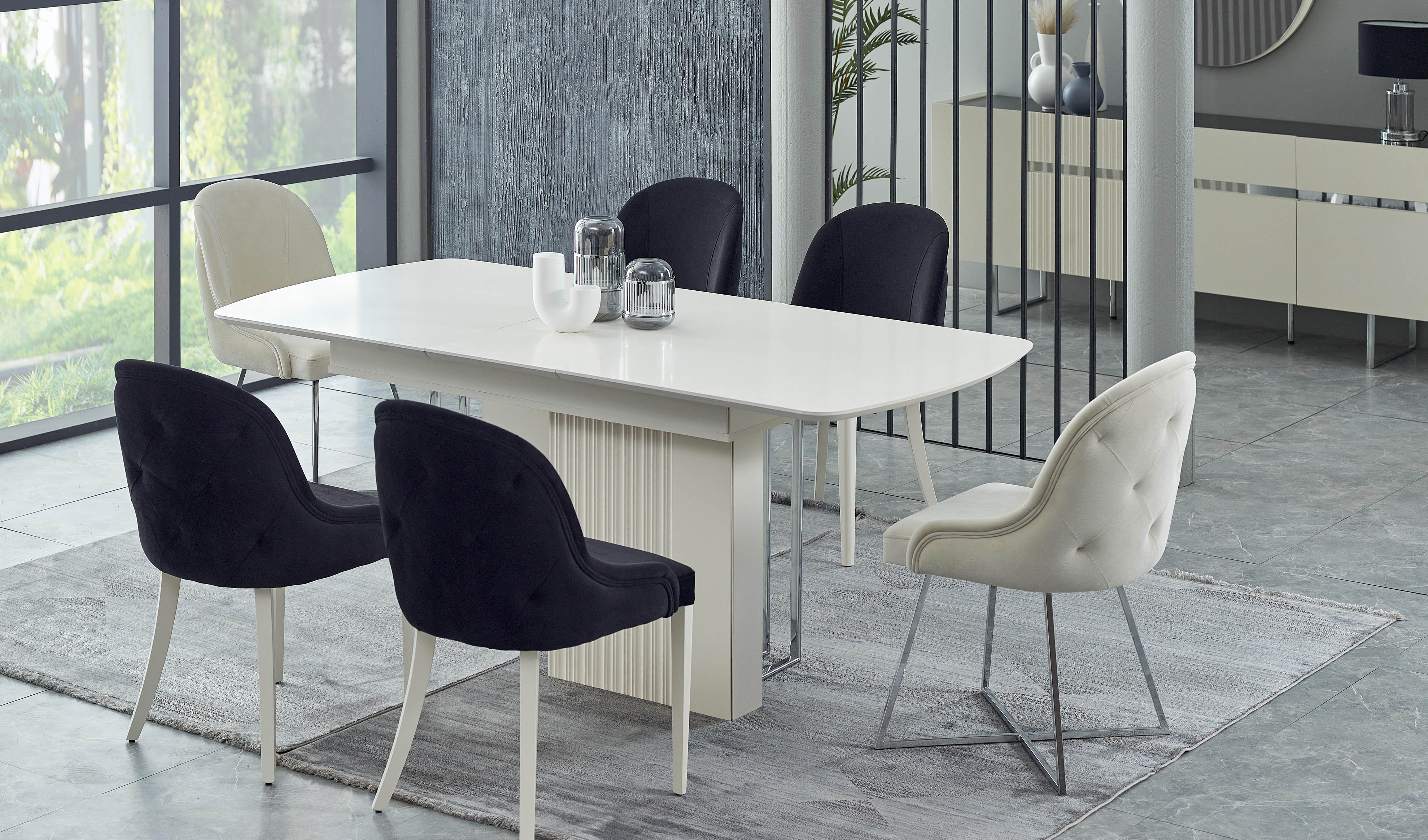 Matias Yemek Odası, mat aytaşı rengi metal detaylarla buluşarak sofralarınıza benzersiz bir zarafet katıyor. Sabit ve açılır masa alternatifleriyle her tarz ev için şıklık vadeden Matias Yemek Odası, zengin renkleriyle sofralarınızı son moda mobilya trendleriyle buluşturuyor.