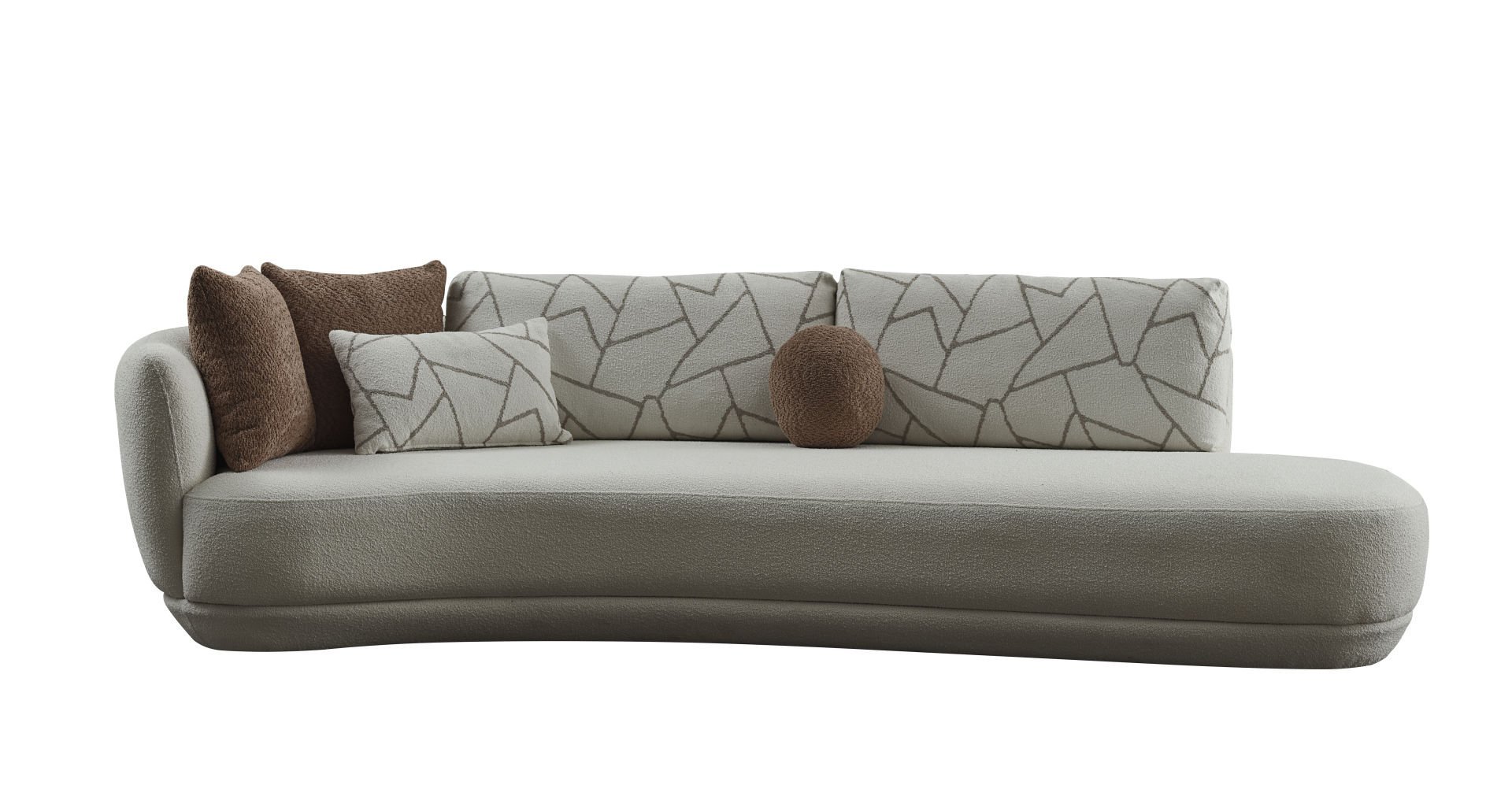 Bukle kumaş dokusuyla zarafeti, sırt minderli yapısı ve katmanlı sünger konforu ile rahatlığı bir araya getiren bu özel seri, çizgisel desenli sırt minderleri ve dekoratif dokuma kırlentleriyle şık bir duruş sergiliyor.