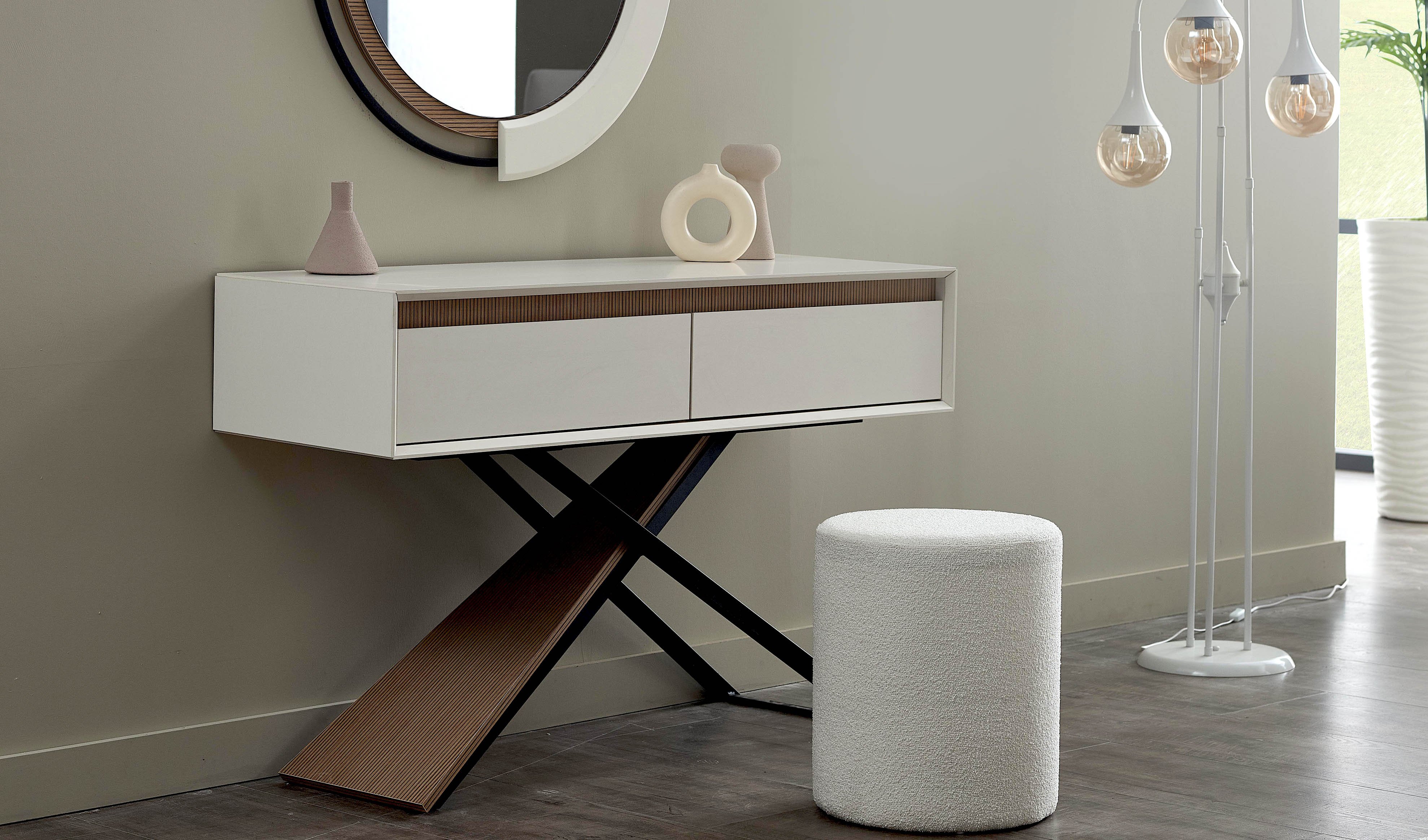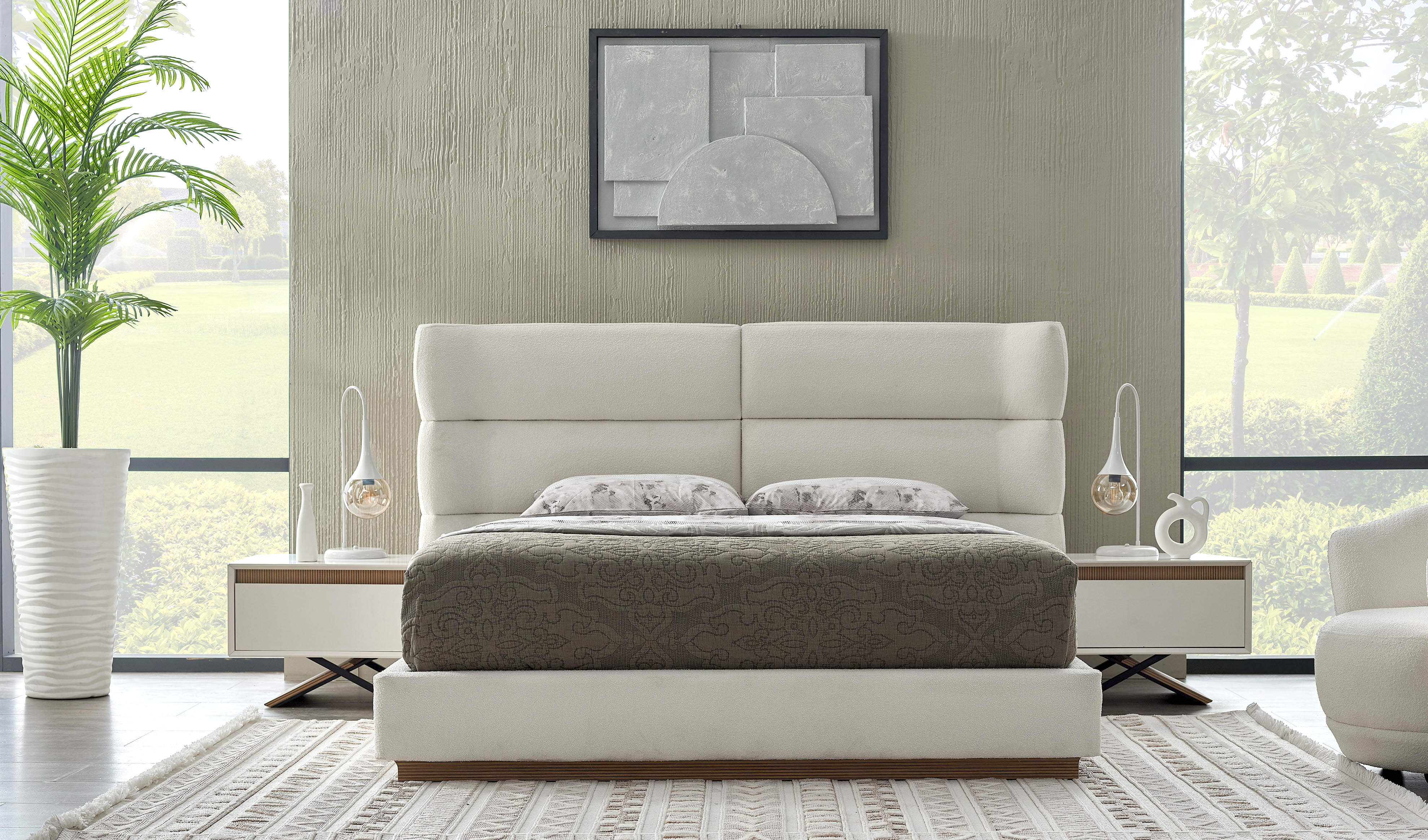 Aytaşı renkleri ve özel metal ayak tasarımı ile zarif bir duruş sergileyen bu yatak odası takımı, geniş saklama alanları, bazalı karyola ve füme ayna detaylarıyla estetiği ve işlevselliği bir araya getiriyor.