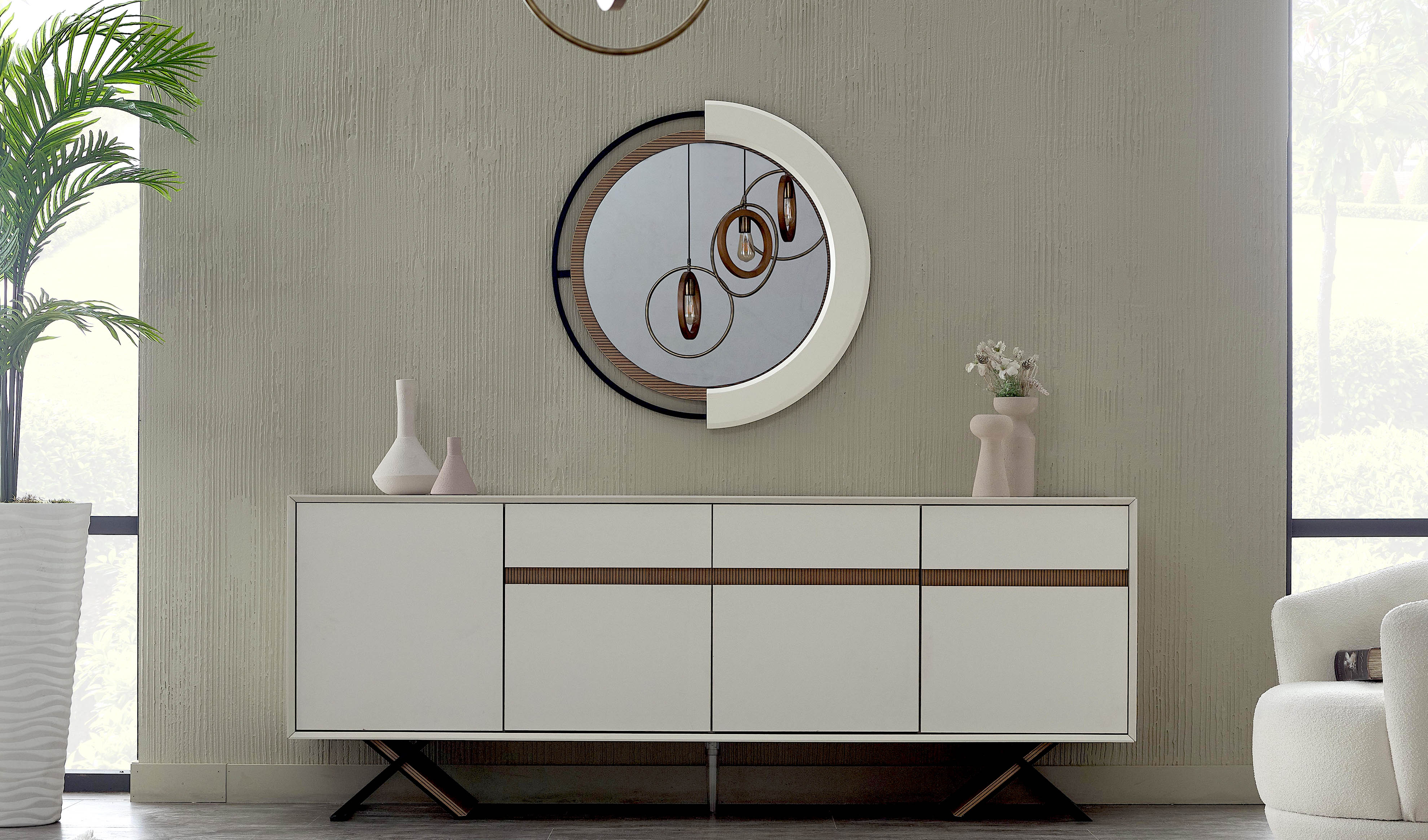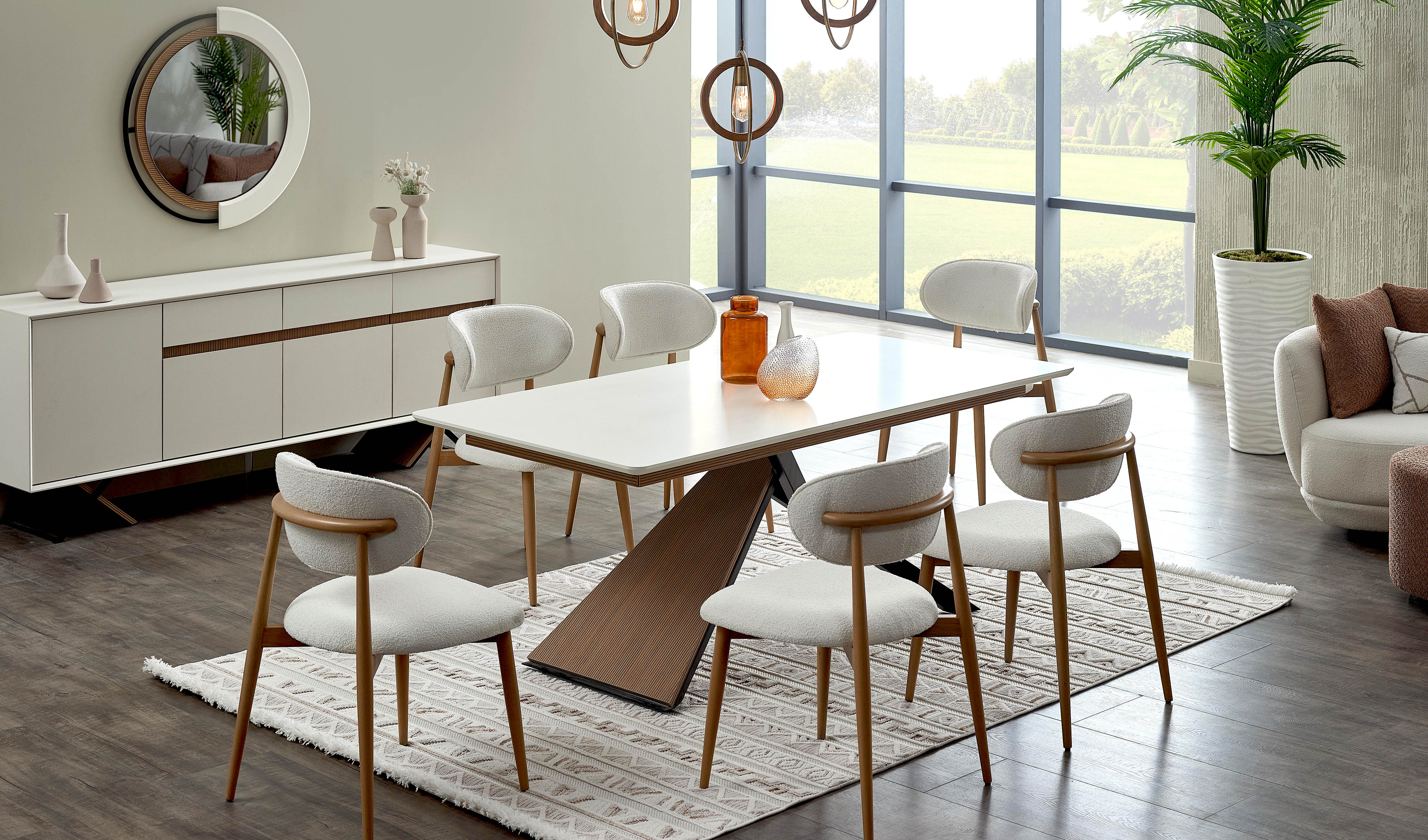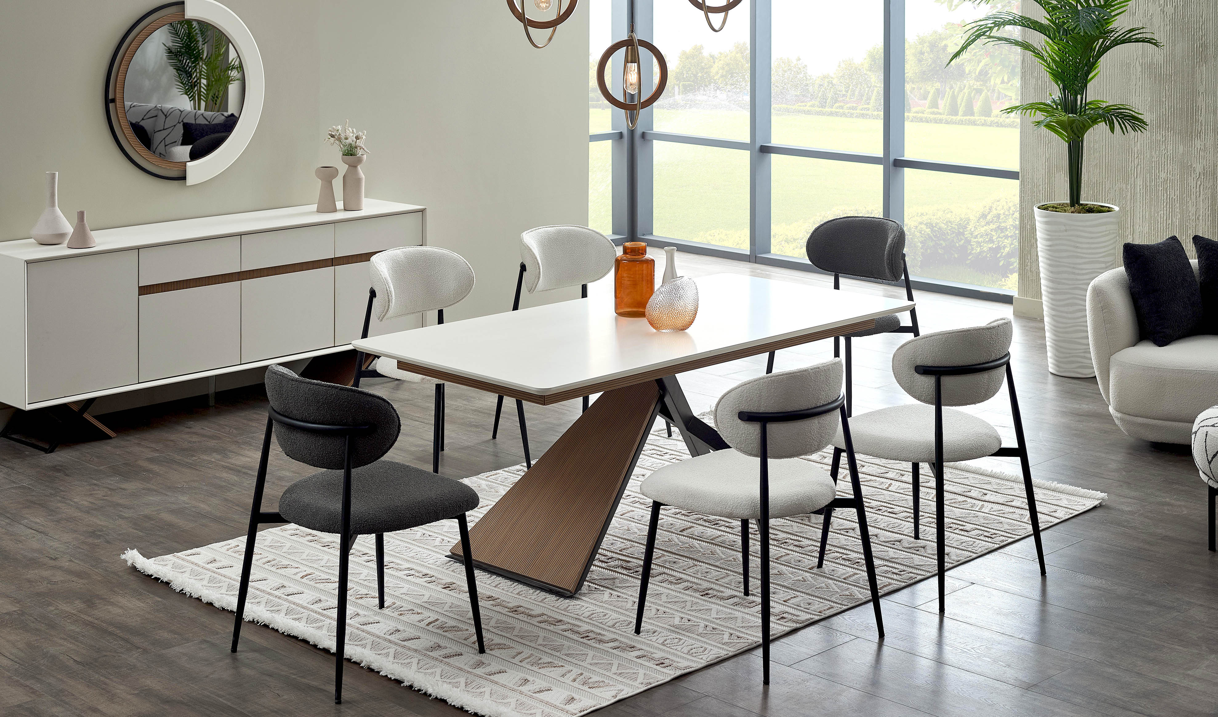 Aytaşı renk kombinasyonu ve özel metal ayak tasarımı ile dikkat çeken bu yemek odası takımı, füme ayna detaylı konsol, geniş saklama alanları ve yavaşlatıcılı mekanizma sistemiyle konforlu ve uzun ömürlü bir kullanım sunarken. Ahşap ve metal ayaklı sandalye seçenekleri ile dekorasyonunuzu tamamlayabilirsiniz. E-1 kalite malzemelerle sağlıklı ve çevre dostu bir deneyim sizi bekliyor.
