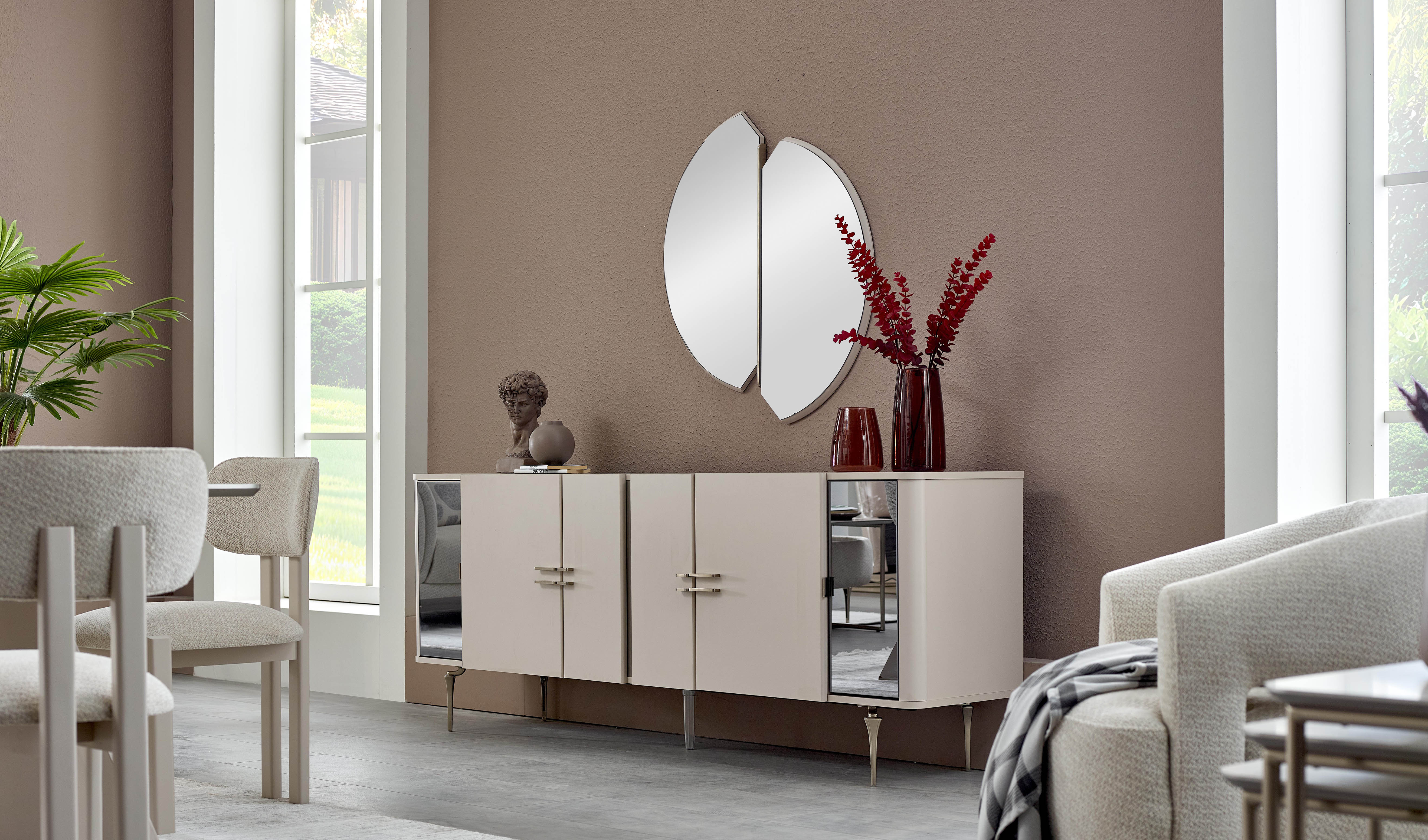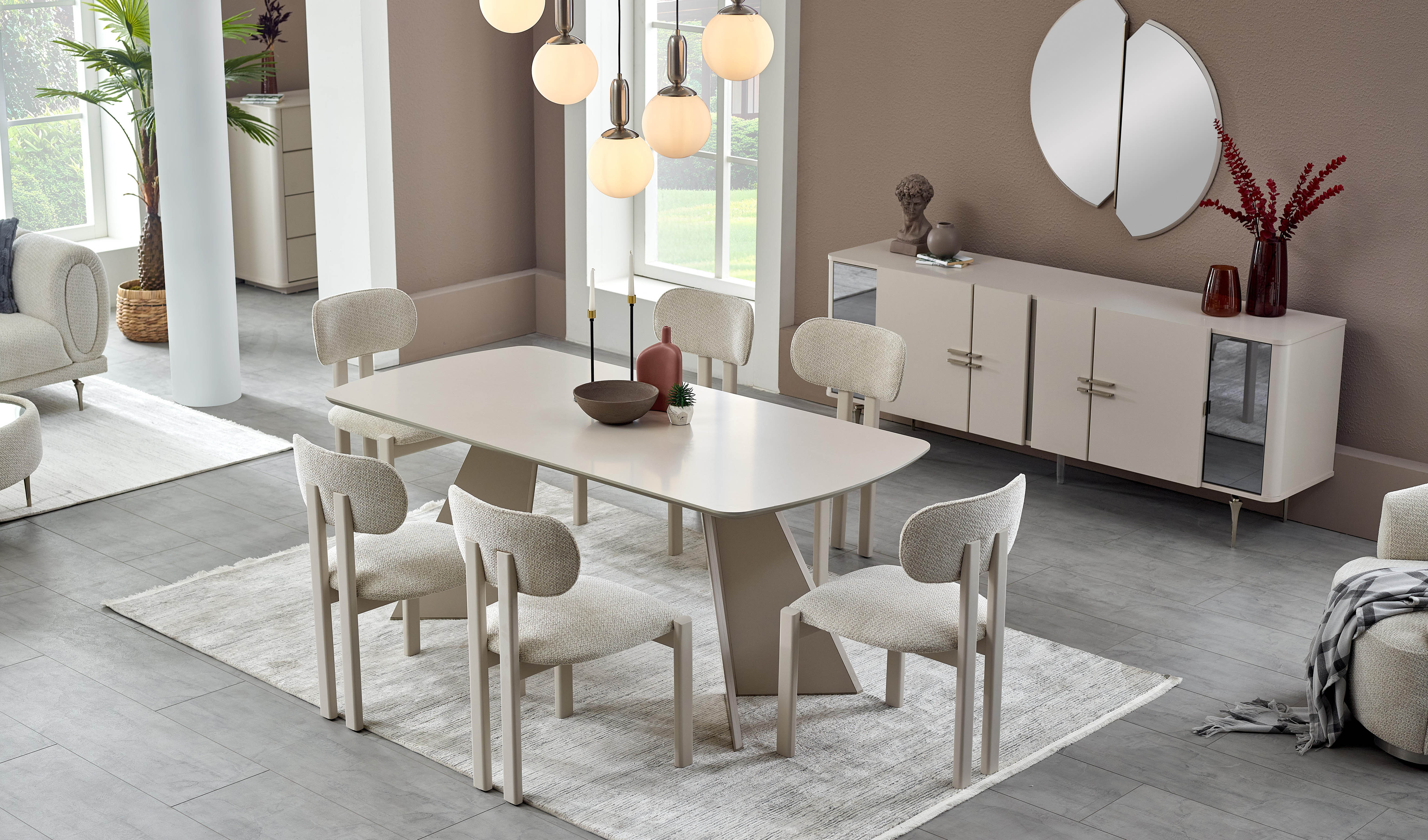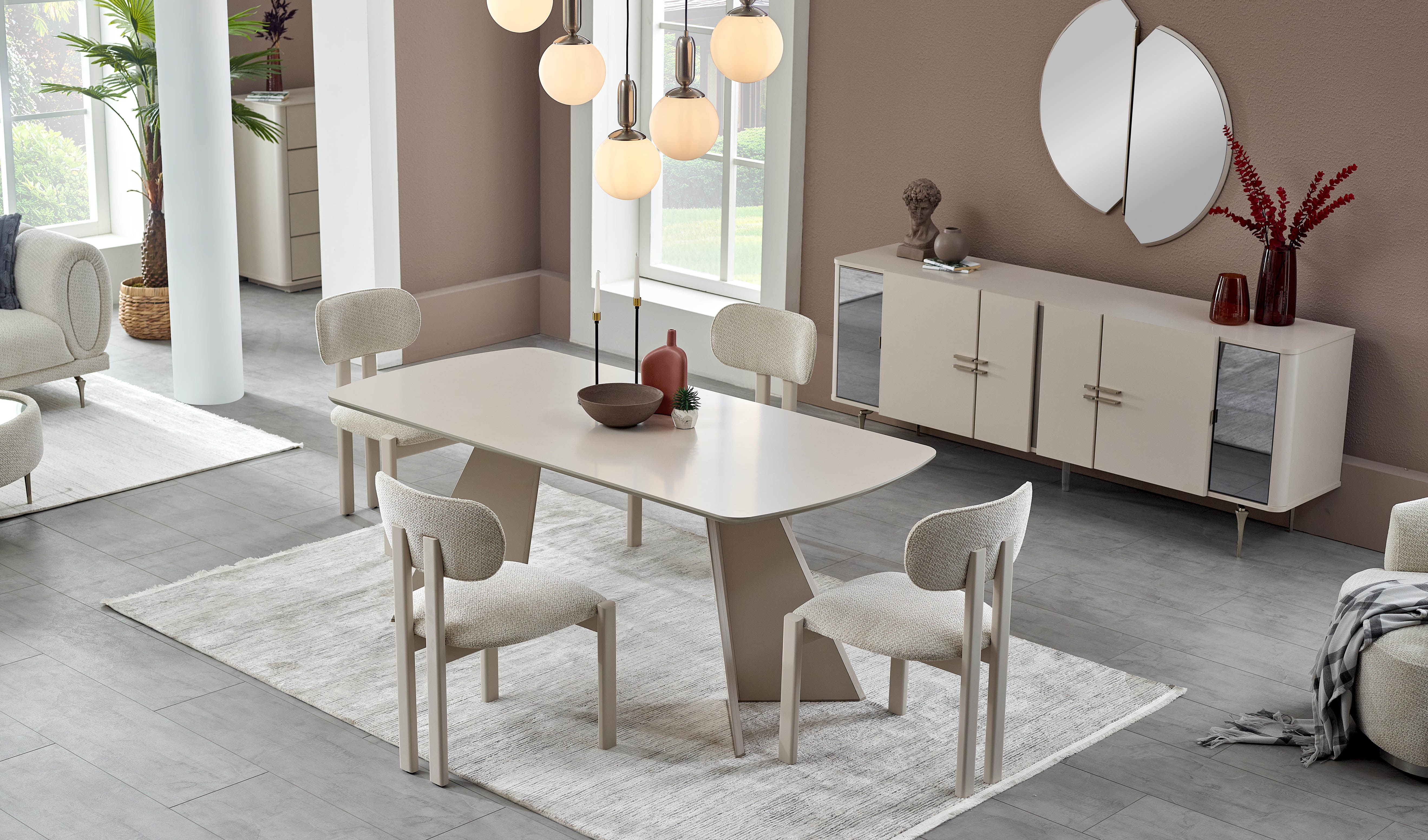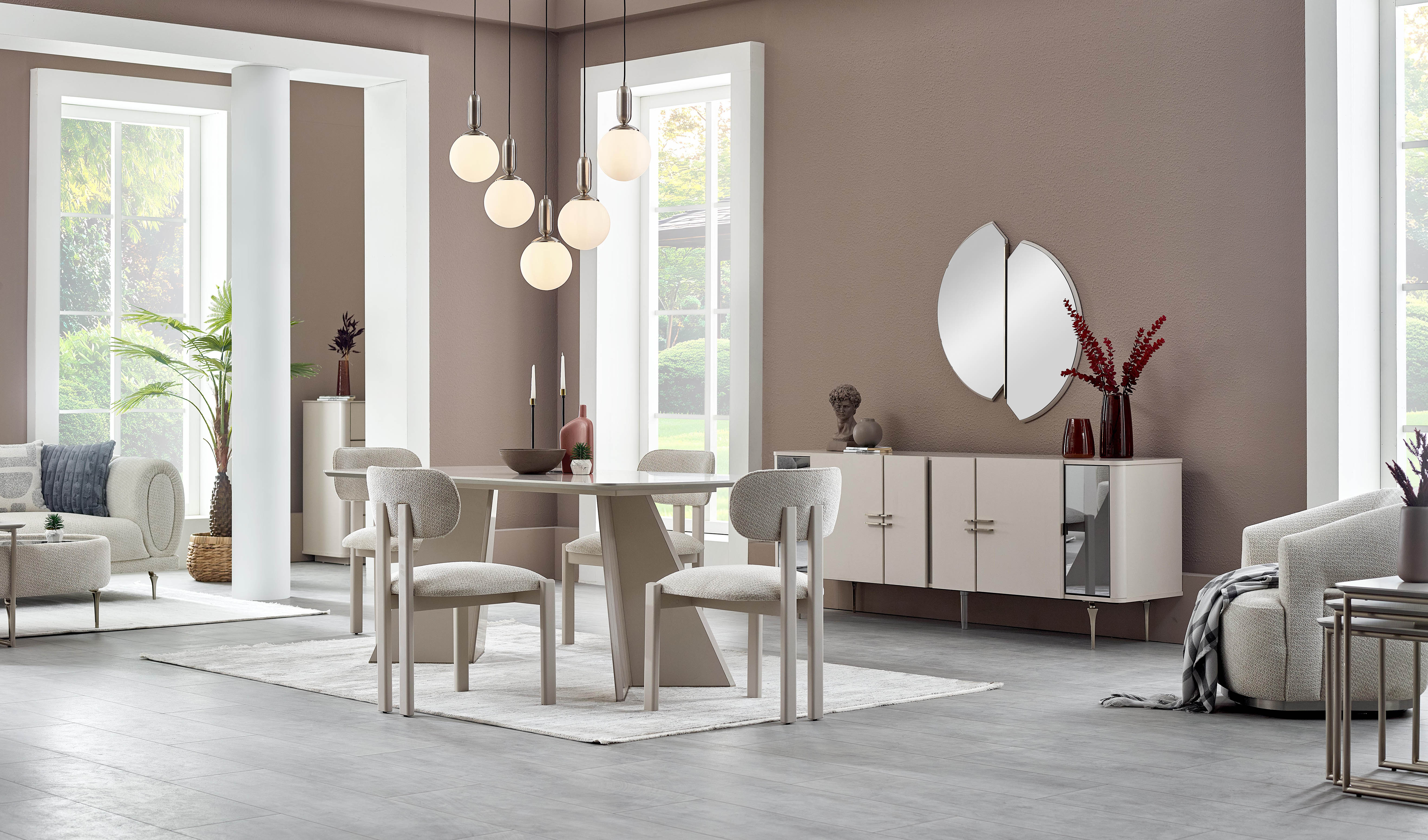 Novera Yemek Odası, dolunay ve inoks renk kombinasyonuyla modern ve şık bir atmosfer sunuyor. Seriye özel inoks kaplamalı kulp ve ayak tasarımı, füme ayna detayları ve açılı tasarımsal kesimi ile novera yemek masası zarafeti ön plana çıkarıyor. Yüksek ayak yapısı temizlik kolaylığı sağlarken, yavaşlatıcılı mekanizma sistemi ile sizlere konforlu bir kullanım sunuyoruz. Takımla uyumlu modern ahşap ayaklı sandalyeleriyle Novera, estetik ve fonksiyonelliği bir araya getiriyor.