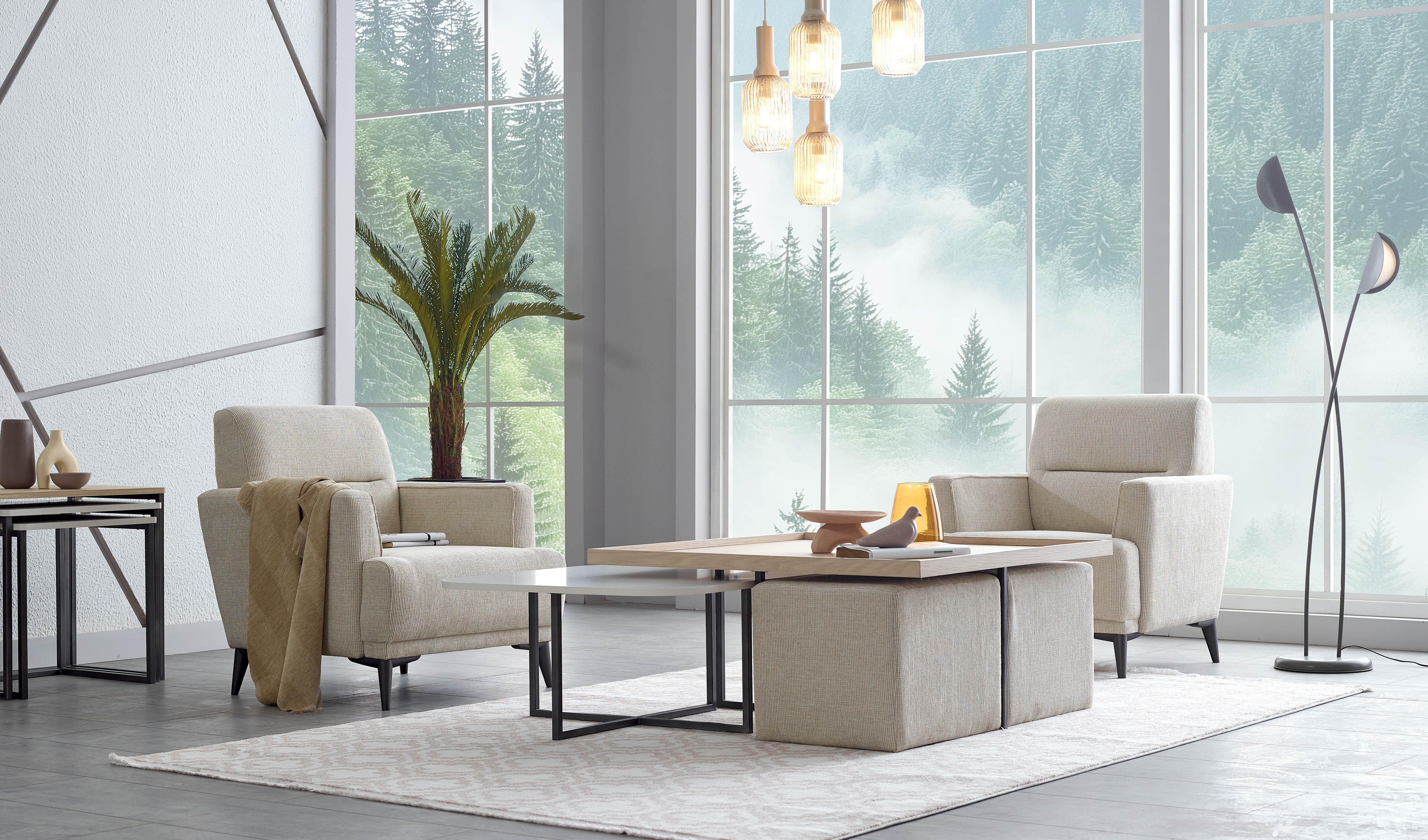 Noya, fonksiyonelliği ve estetiği bir arada sunarak yaşam alanlarınıza değer katıyor. Sıfır açılır makas mekanizması, kullanım kolaylığı sağlarken konforlu bir yatak alternatifi sunar. Dokuma kumaşı, hem şık bir dokunuş ekler hem de kolay temizlenebilir yapısıyla pratik bir kullanım sağlar. Kumaşda renk alternatifleri, dekorasyon zevkinize göre özelleştirme imkanı sunarken, desenli kırlent uygulaması ile takımın görselliği zenginleşir. Sırtta yarma detayı, tasarıma modern bir şıklık katarken, sandıklı yapısı ekstra depolama alanı sunarak düzenli bir yaşam alanı oluşturmanıza yardımcı olur.