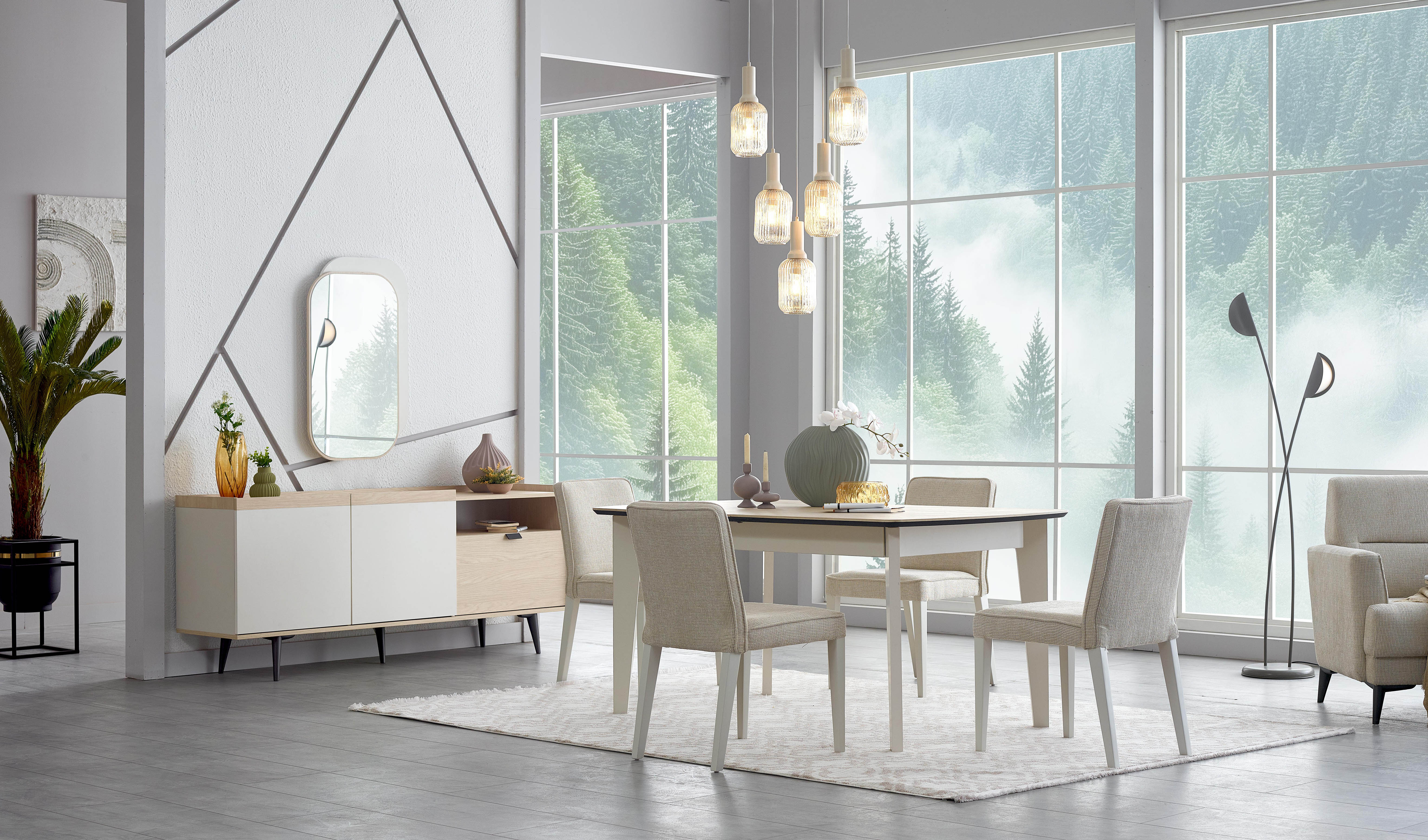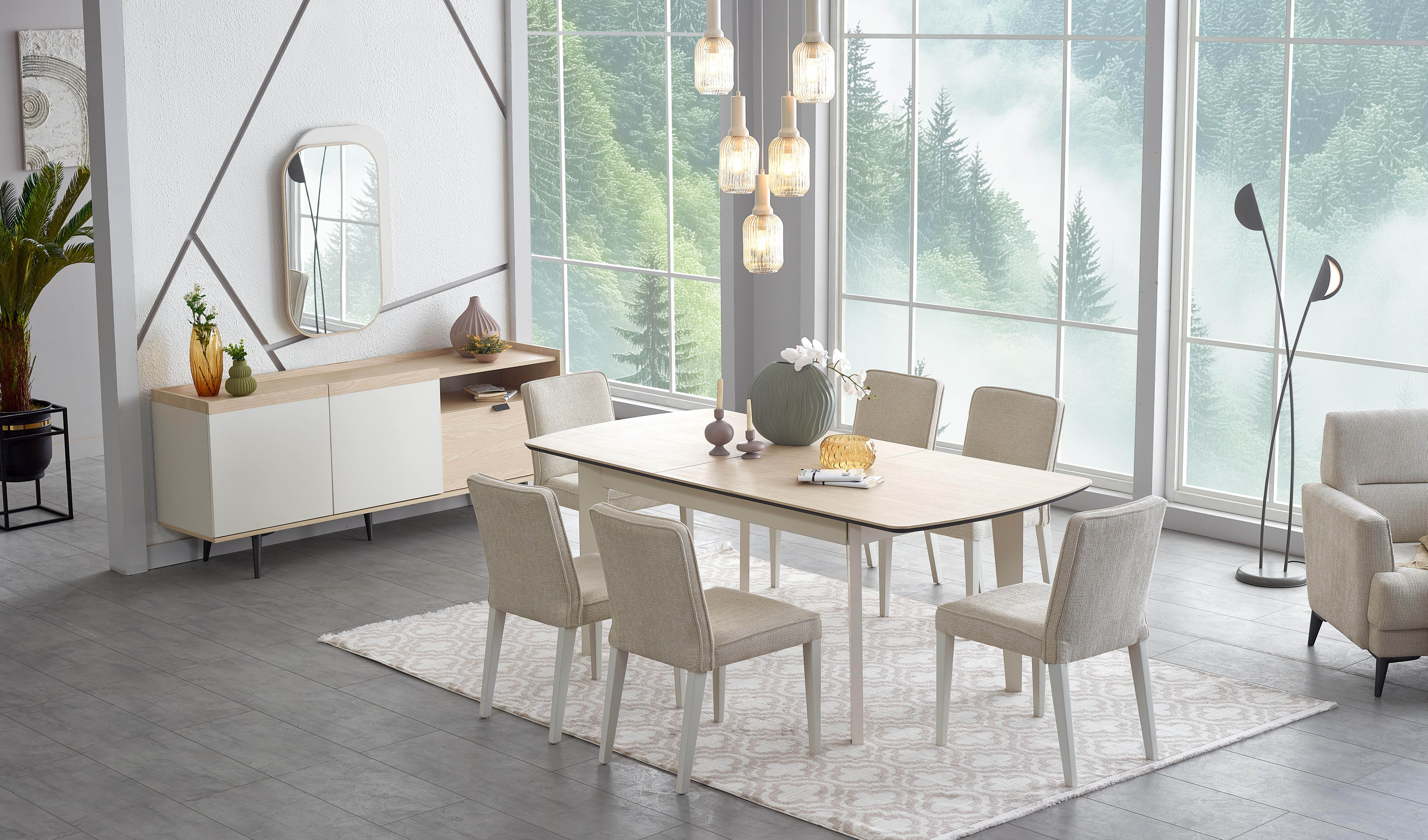 Noya, sana tam bir özgürlük sunuyor. Yemek masasında sabit ve açılır modül seçeneği ile alanını kendi tarzına göre şekillendir; ister günlük kullanım için sabit masa ile sade bir düzen kur, ister kalabalık sofralar için açılır modül ile geniş bir alan yarat – hepsini dilediğin gibi seçip tasarlayabilirsin. Seri ile uyumlu ahşap ayaklı sandalye tasarımı, şıklığı tamamlıyor; sandalyelerde lüks ve ekonomik satın alma olanağı ile ister gösterişli bir konfor, ister bütçe dostu bir seçenek tercih et – seçim tamamen senin! Modülleri birleştir, ihtiyaçlarına göre ayarla ve sofralarını tamamen kendi zevkine göre yeniden şekillendir – Noya ile her an özel!